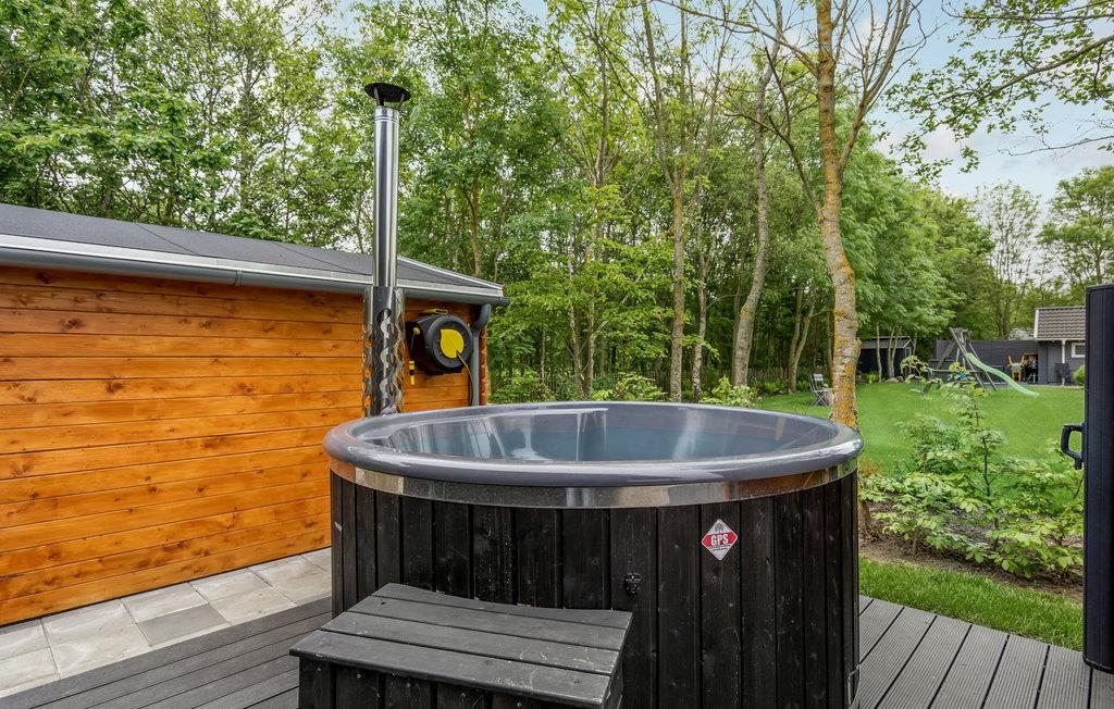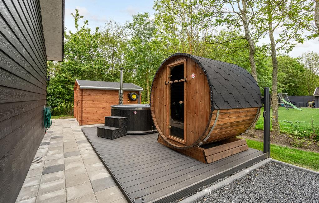 Det lækre udemiljø er noget helt særligt. Her er der alt, hvad I kan ønske jer til de dejlige dage med udeliv - lige fra to skønne terrasser til en havegrill, bålplads, saunatønde, shelter og et vildmarksbad. Fra terrassen kan I se børnene kravle op i tårnet med rutsjebane, og i sandkassen kan de mindste hygge sig med at lave sandkager. Skulle I få lyst til komme ud at se jer omkring, er der kun få minutters gang til en stor fælles legeplads.