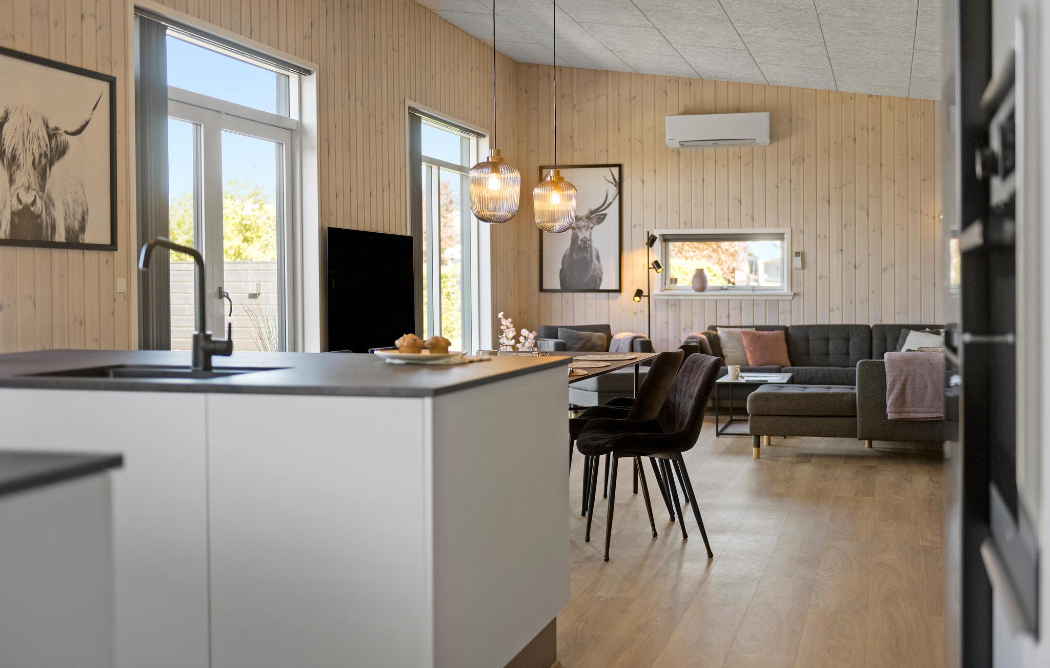 Velkommen til Bork Havn og dette veludstyrede hus, der danner rammen om årets bedste uger med familien. Huset er flot indrettet med moderne materialer, et komfortabelt møblement og store vinduespartier, der lader dagslyset sive ind og giver en dejlig udsigt til terrassen og haven. Hvis vejret bider lidt, kan I tænde op i biopejsen og se frem til indendørs hygge med god tid til madlavningen i det veludstyrede køkken, et lækkert måltid mad ved spisebordet og en sjov aften i den store sofa med snacks, brætspil og en god film på tv'et.