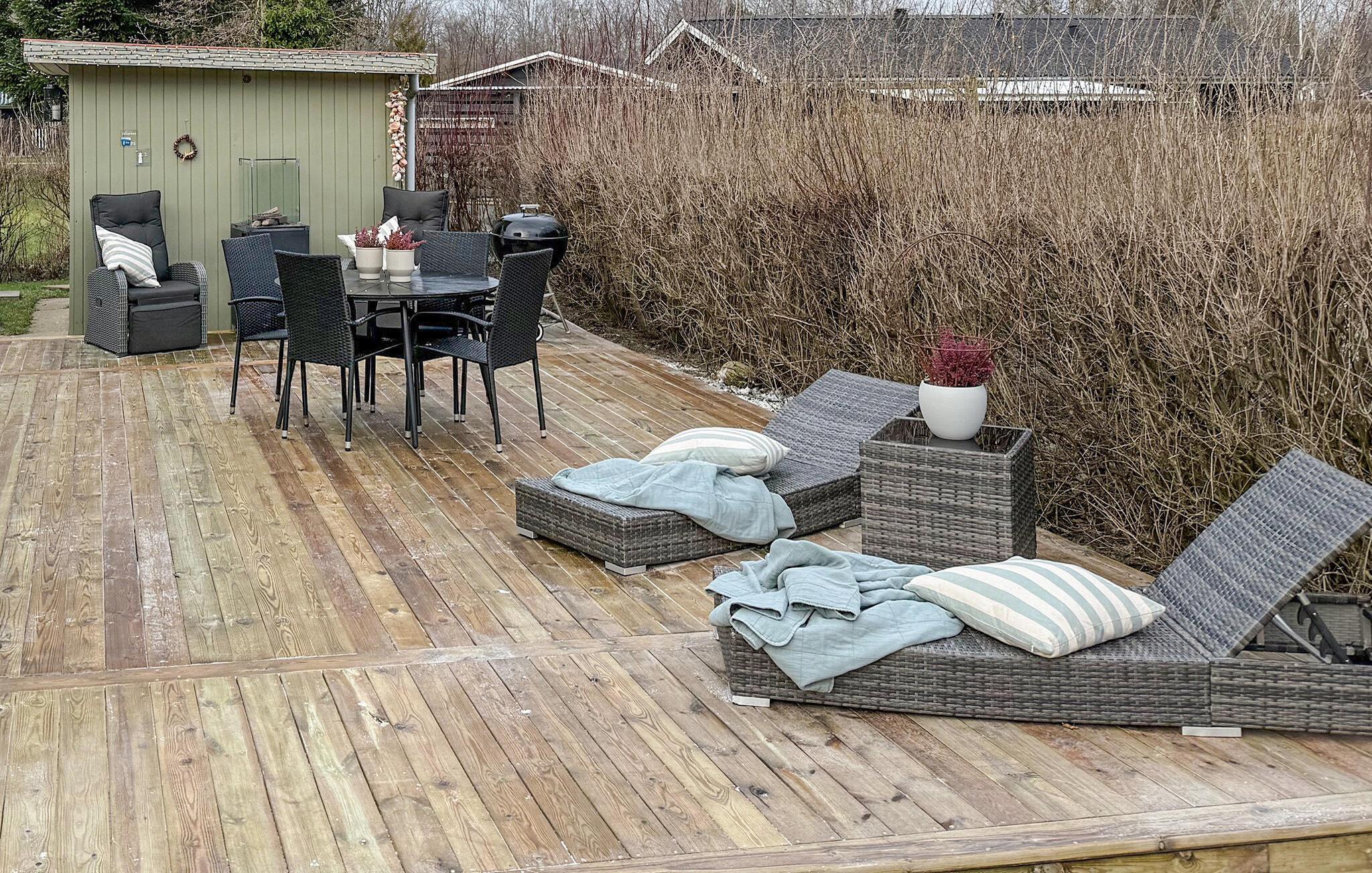 Aftensmaden kan også nydes i sol eller skygge på den delvist store ugenerede træterrasse til varmen fra den tændte gaspejs. Her er der god plads til, at man om dagenkan slikke sol, dække op til en frokost eller spille diverse brætspil, som findes i sommerhuset. Slip børnene løs i den store have, hvor der både findes gyngestativ, sandkasse samt udendørsfaciliteter. Sidst på dagen er det ren forkælelse med en stille aftenstund i det store vildmarksbad under åben himmel eller i loungeområdet - måske med en frisk drink ved hånden.