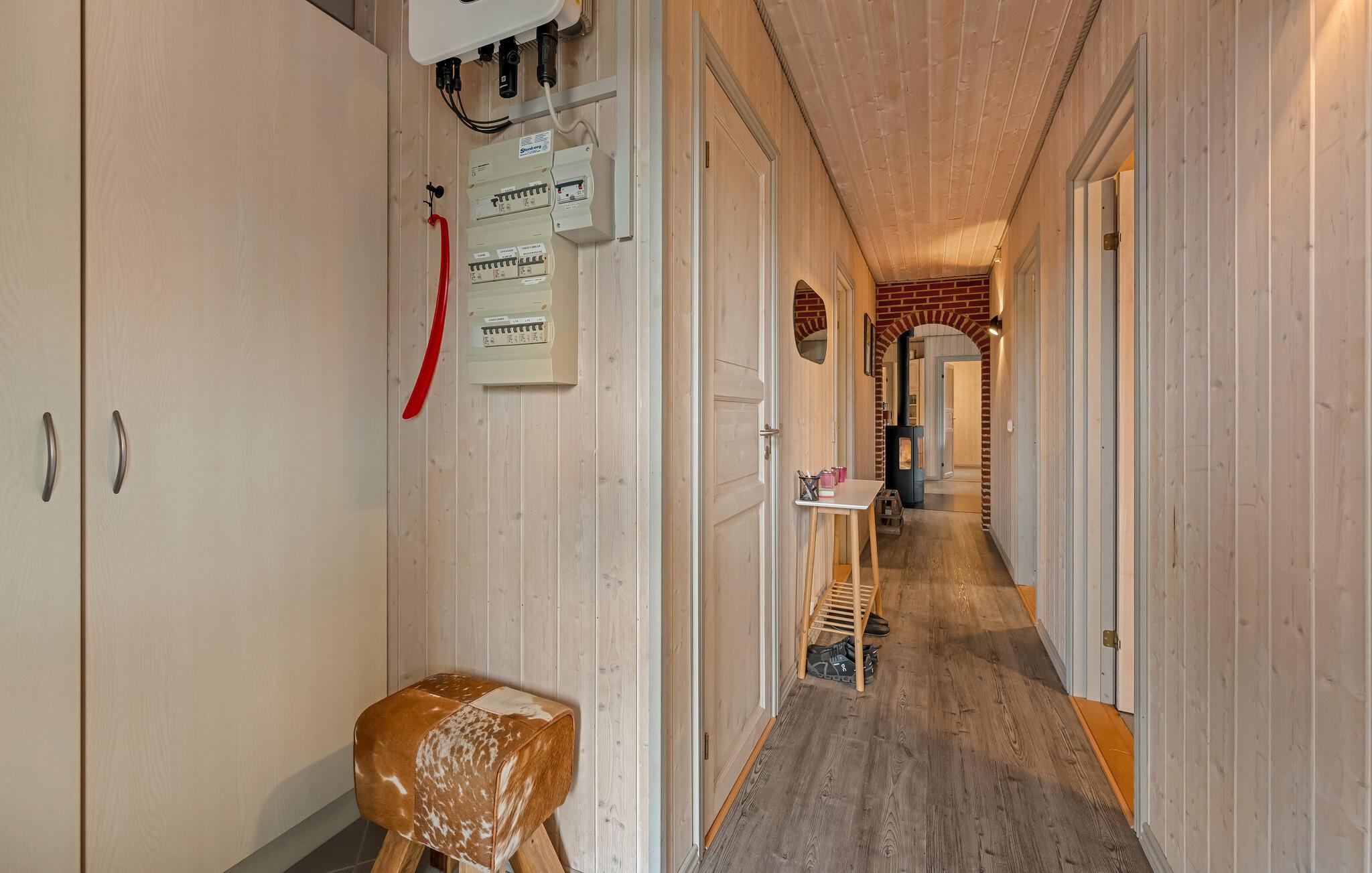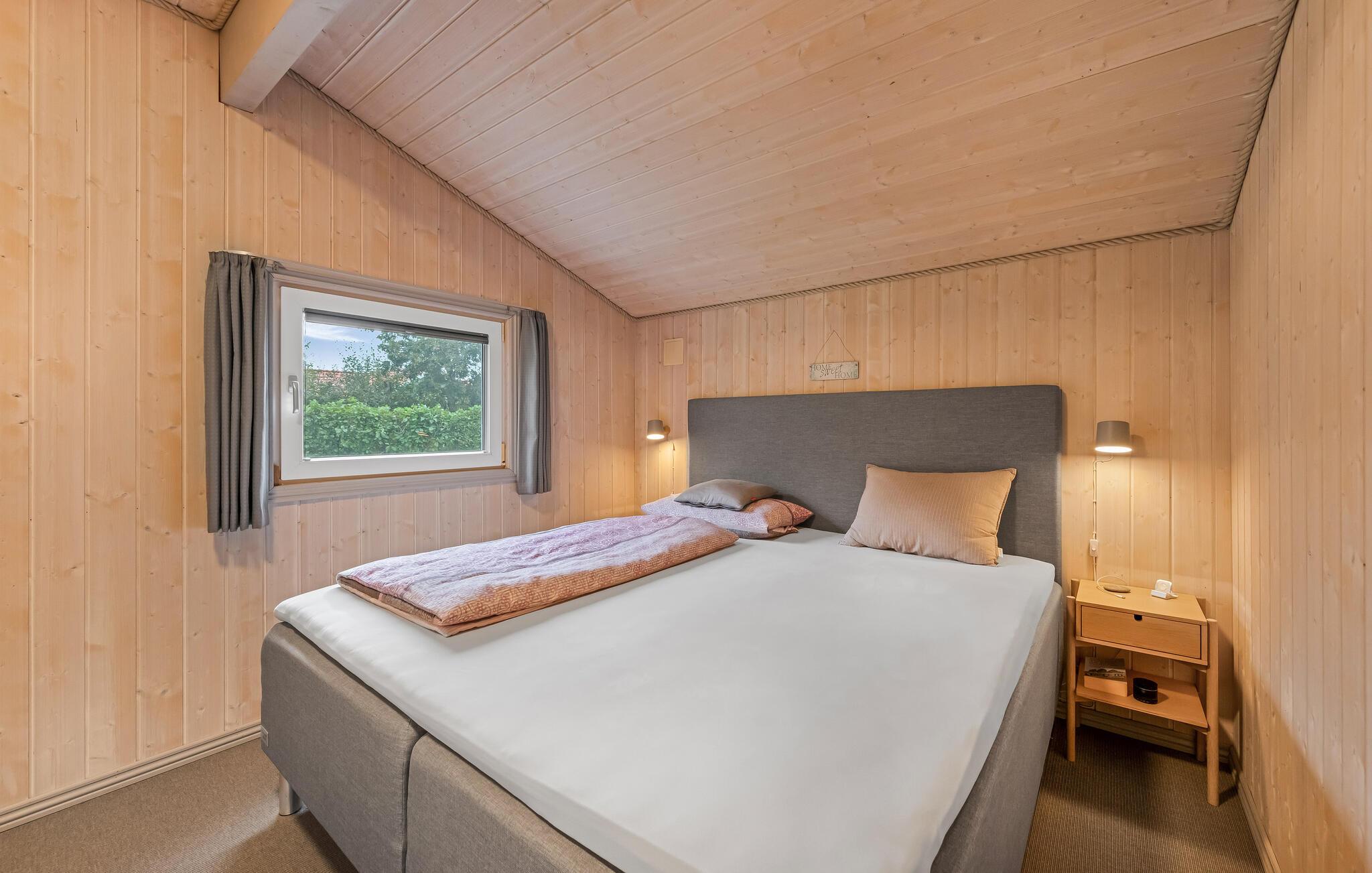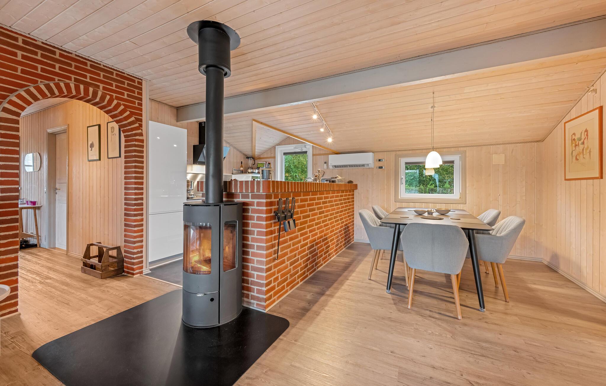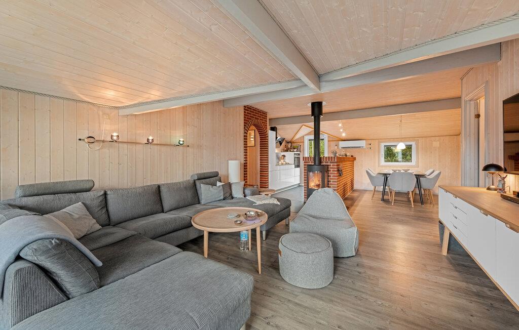 Glæd jer til jeres smagfulde feriehus. Den bekvemme beliggenhed i et populært ferieområde og den høje komfort skaber optimale betingelser for en afslappende ferie på alle tider af året. Læn jer tilbage i den smukke opholdsstue, der udstråler en varm atmosfære med sit lyse træ, den rummelige sofa og de store vinduer. Brug brændeovnen til at skabe en hyggelig atmosfære på køligere dage og tilbring afslappende timer foran fjernsynet. Tilbered jeres måltider i det moderne køkken, der er udstyret med apparater af høj kvalitet og nem adgang til terrassen. Og nyd lidt forkælelse i badeværelset med spabad og sauna.