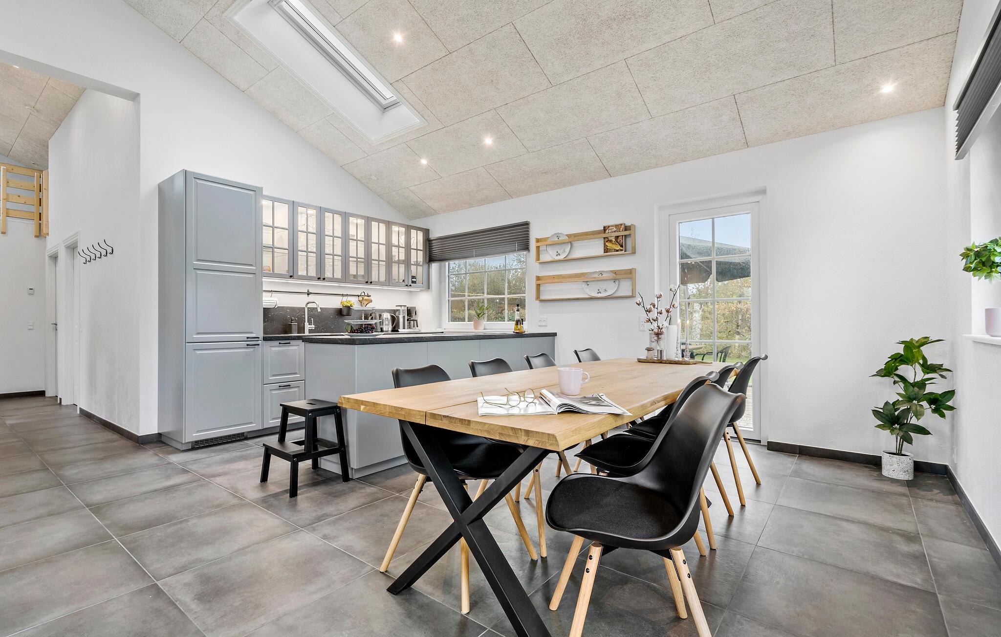 Den åbne stue med højt til loftet og store vinduer skaber en lys og venlig atmosfære. Slap af i det rummelige sofahjørne og nyd tiden sammen med familie eller venner. Det moderne, veludstyrede køkken med tilstødende spisebord giver plads til fælles måltider og hyggelige aftener.