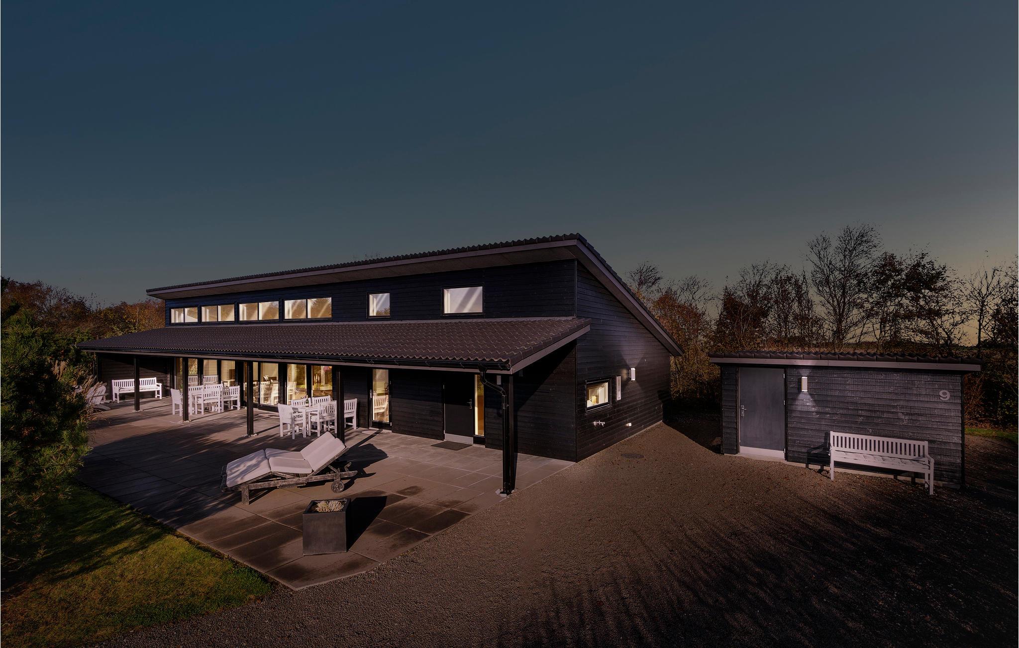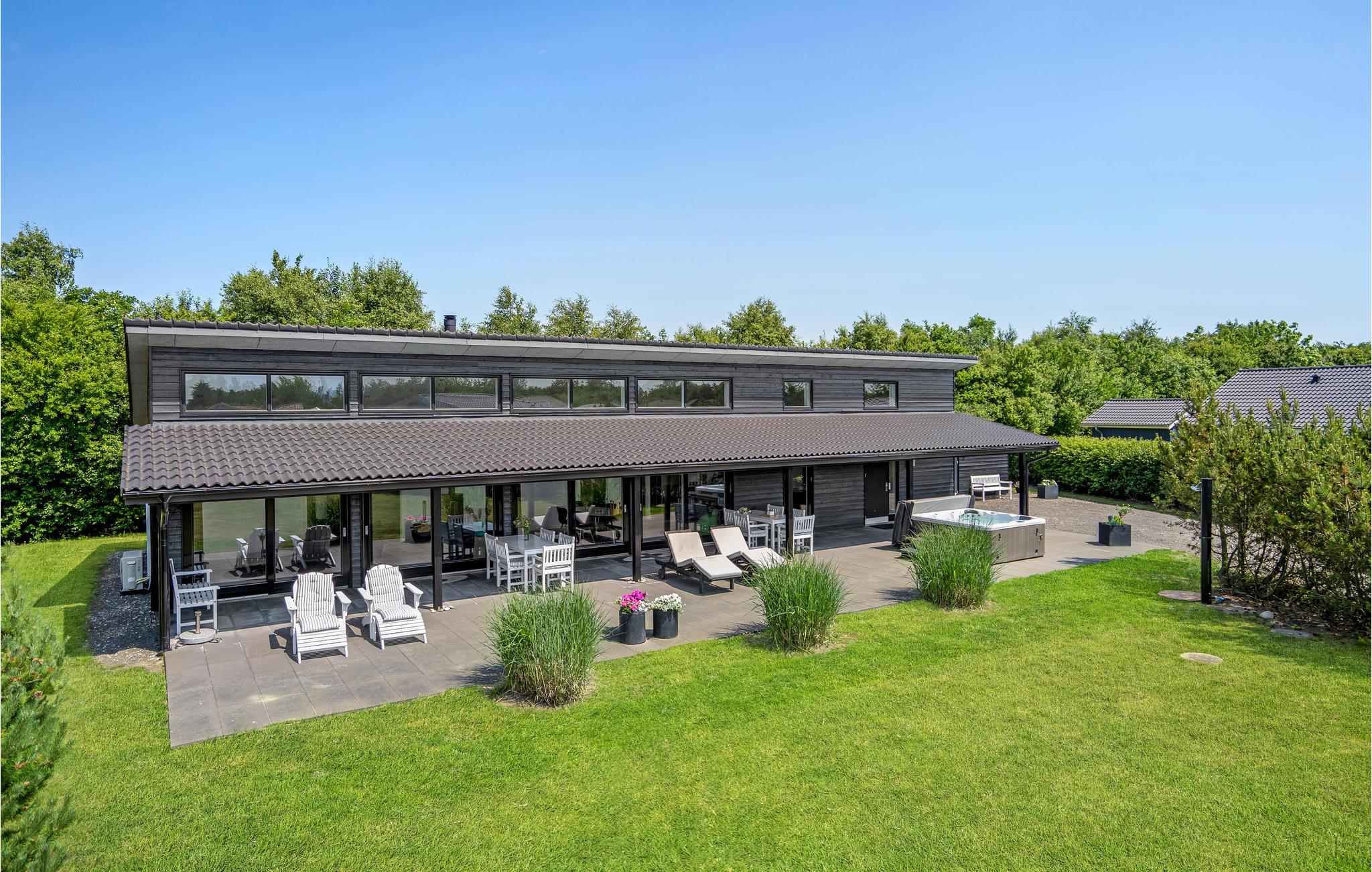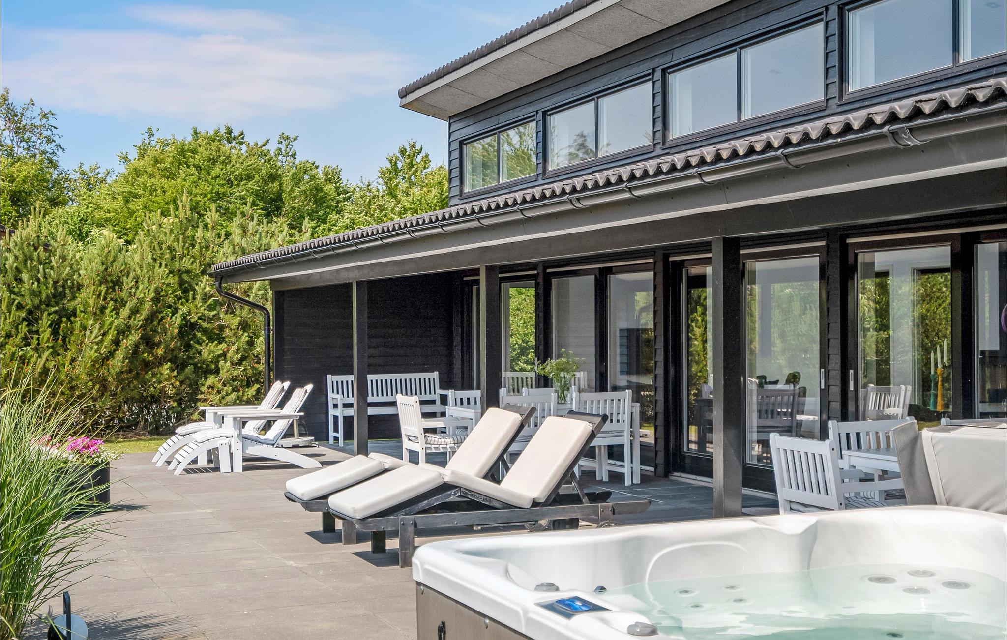 Veludstyret feriehus med stor overdækket terrasse, nær Bork Havn og Vikingehavn, perfekt til udendørsliv og afslapning.