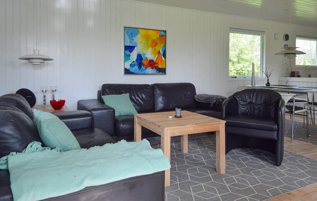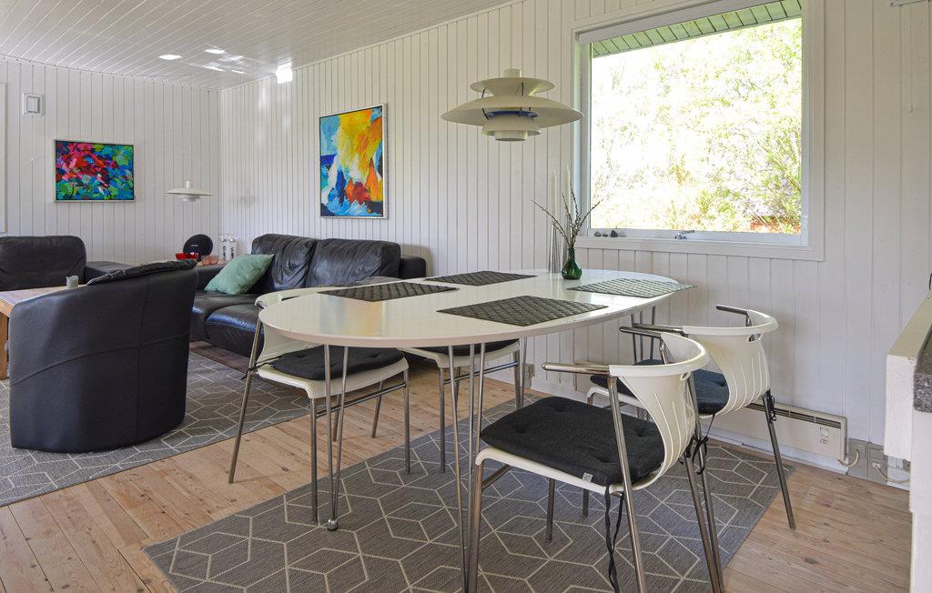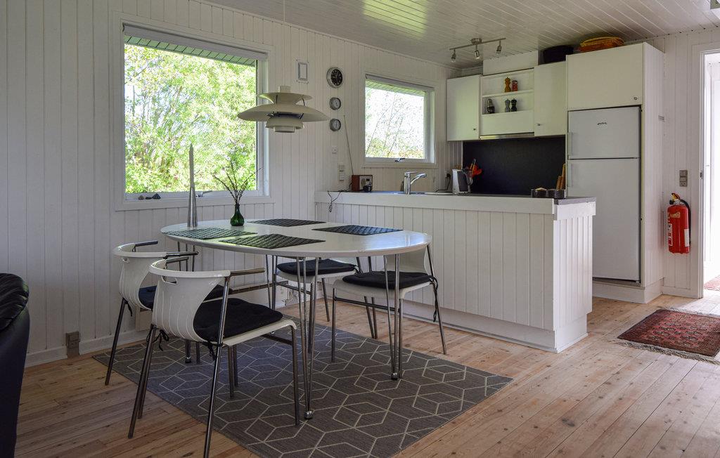 Lyst sommerhus, med åbent køkken og hyggelig opholdsstue. Her kan familien tilbringe masser af kvalitetstid, med madlavning og hygge foran Tv'et eller brændeovnen. På lune sommeraftener kan madlavningen rykke udenfor på den overdækkede træterrasse, hvor I har gasgrill og havemøbler til rådighed. Her kan I nyde den smukke naturgrund sammen med et godt glas vin.
