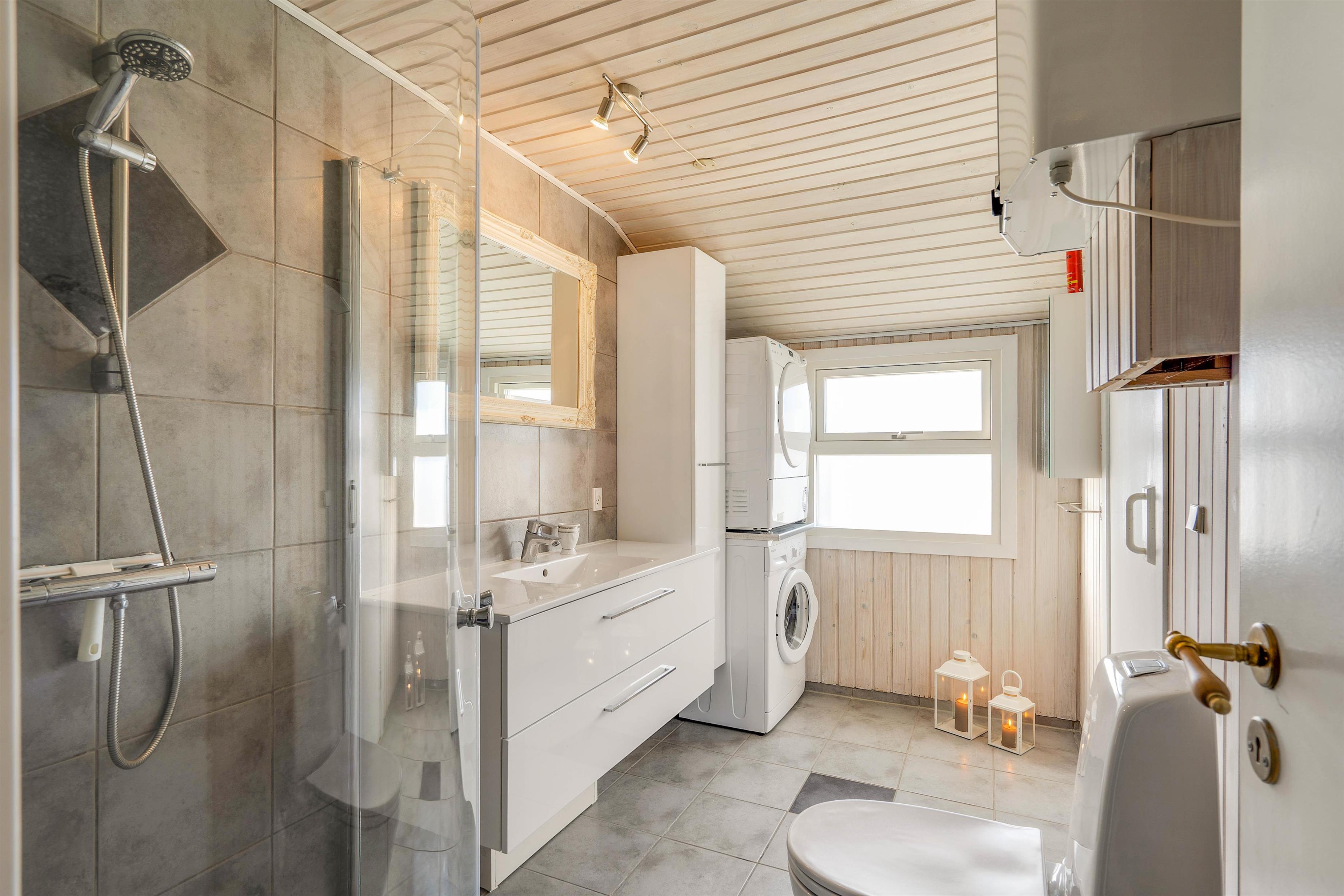I sommerhuset er der desuden 1 badeværelse, der er udstyret med gulvvarme, så I slipper for at fryse fødderne. På badeværelset har I også adgang til sommerhusets sauna, hvor I virkelig kan få slappet af og komme ned i gear i den dejlige varme.