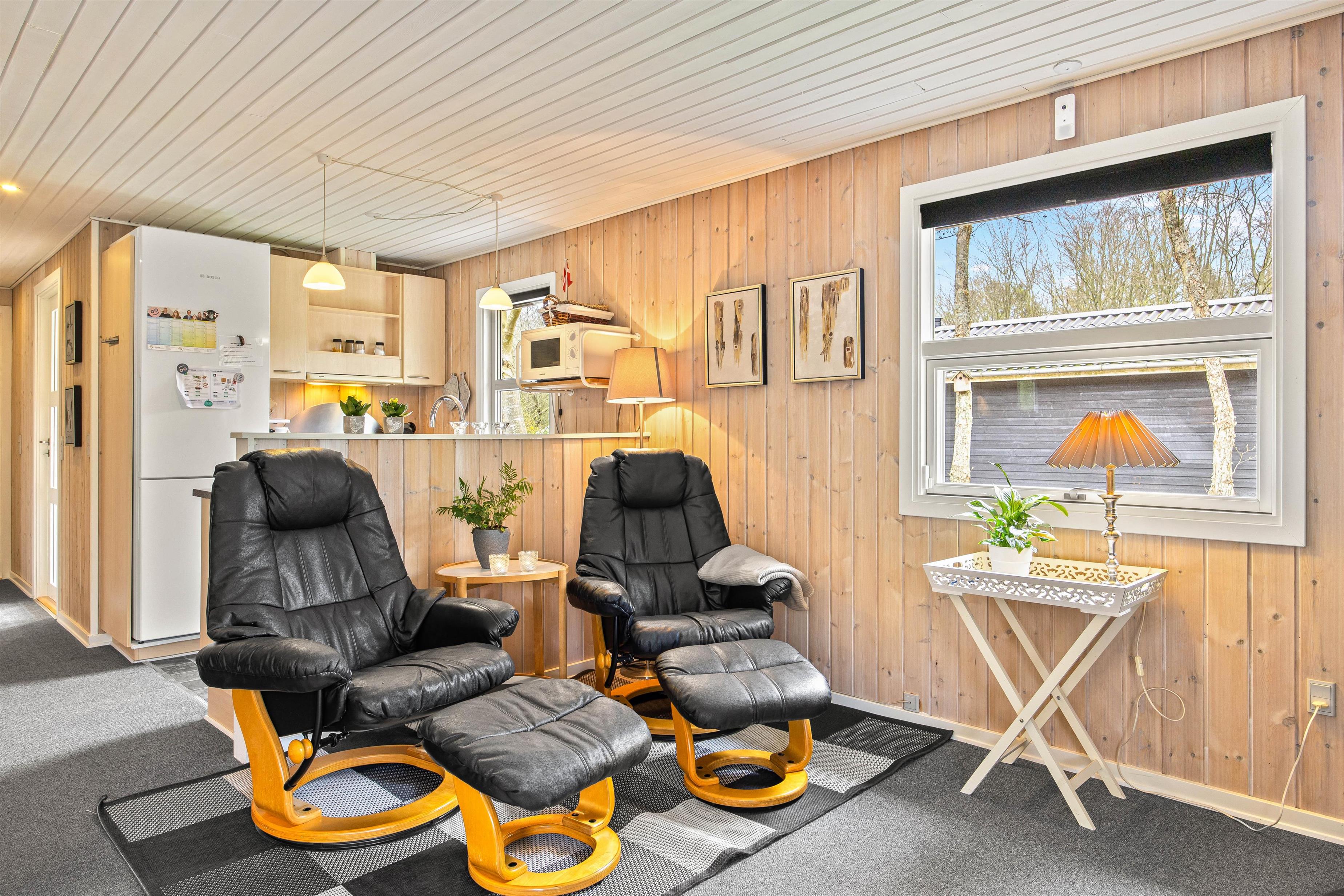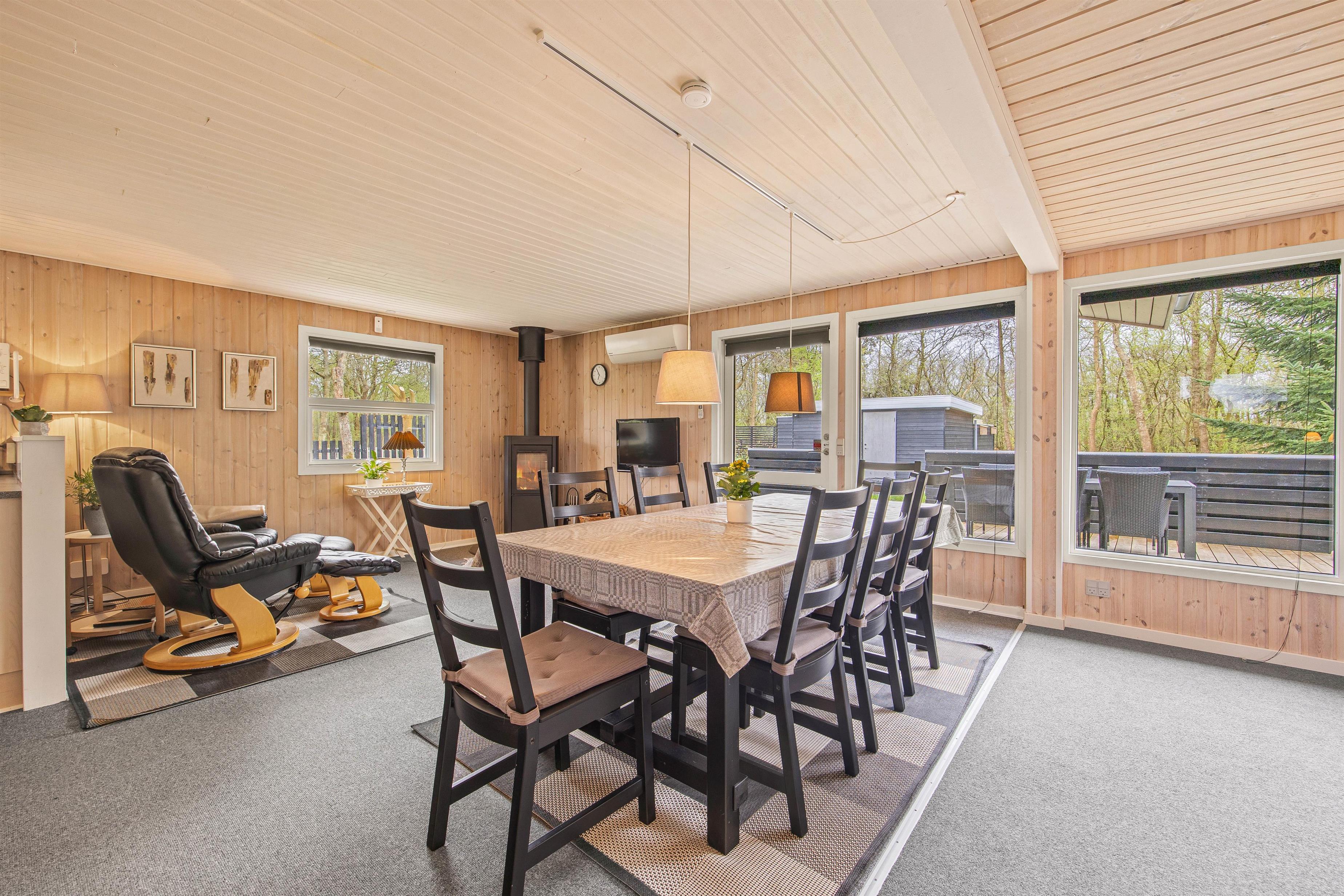 Den lyse indretning med flotte træpaneler og lyse møbler skaber en indbydende atmosfære. Sommerhuset byder på 2 separate stueområder, så I kan vælge mellem tv-hygge eller fordybelse foran brændeovnen - og ejeren stiller frit brænde til rådighed, så I kan nyde varmen og knitren fra flammerne.