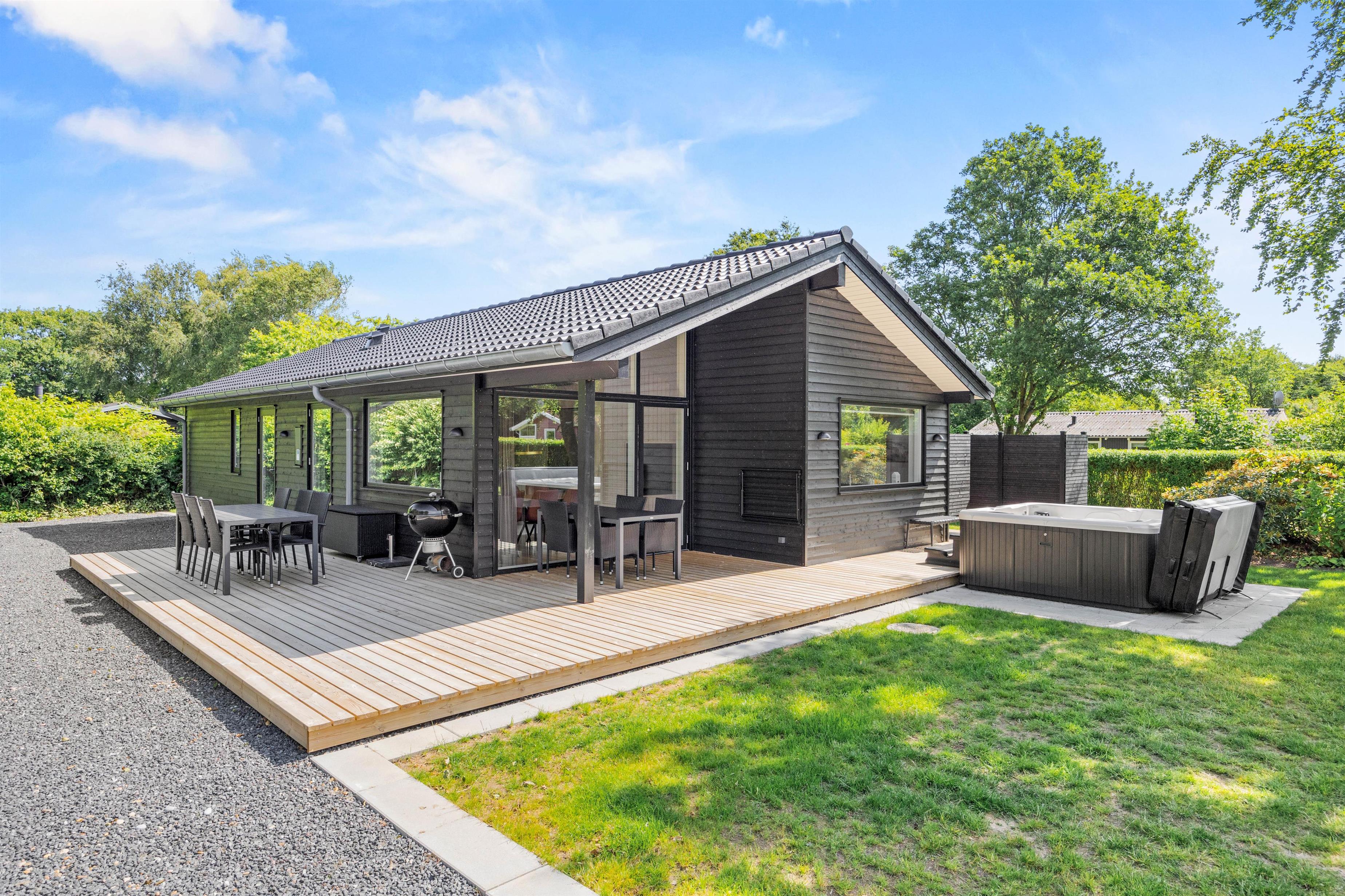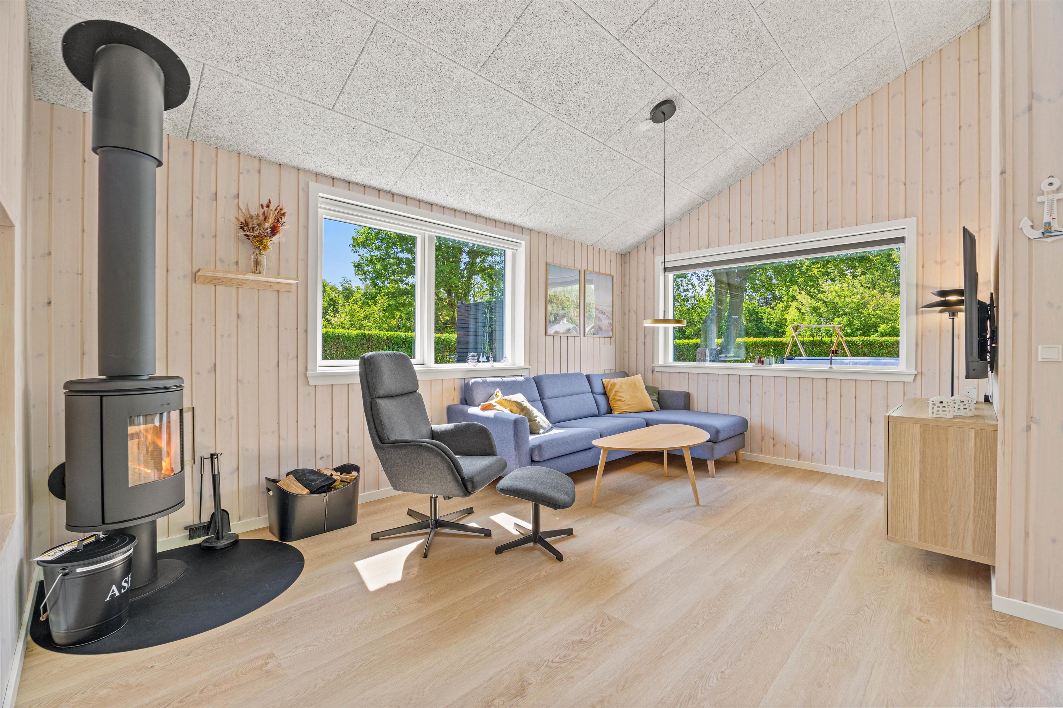 På Hejrevænget 19 har den lyse og moderne indretning i åbent plan fokus på hygge og samvær. I stuen kan I slappe af i sofaen foran ilden i brændeovnen, eller I kan følge med i, hvad der sker på terrassen, ved udespaen eller i køkken- og spiseområdet.