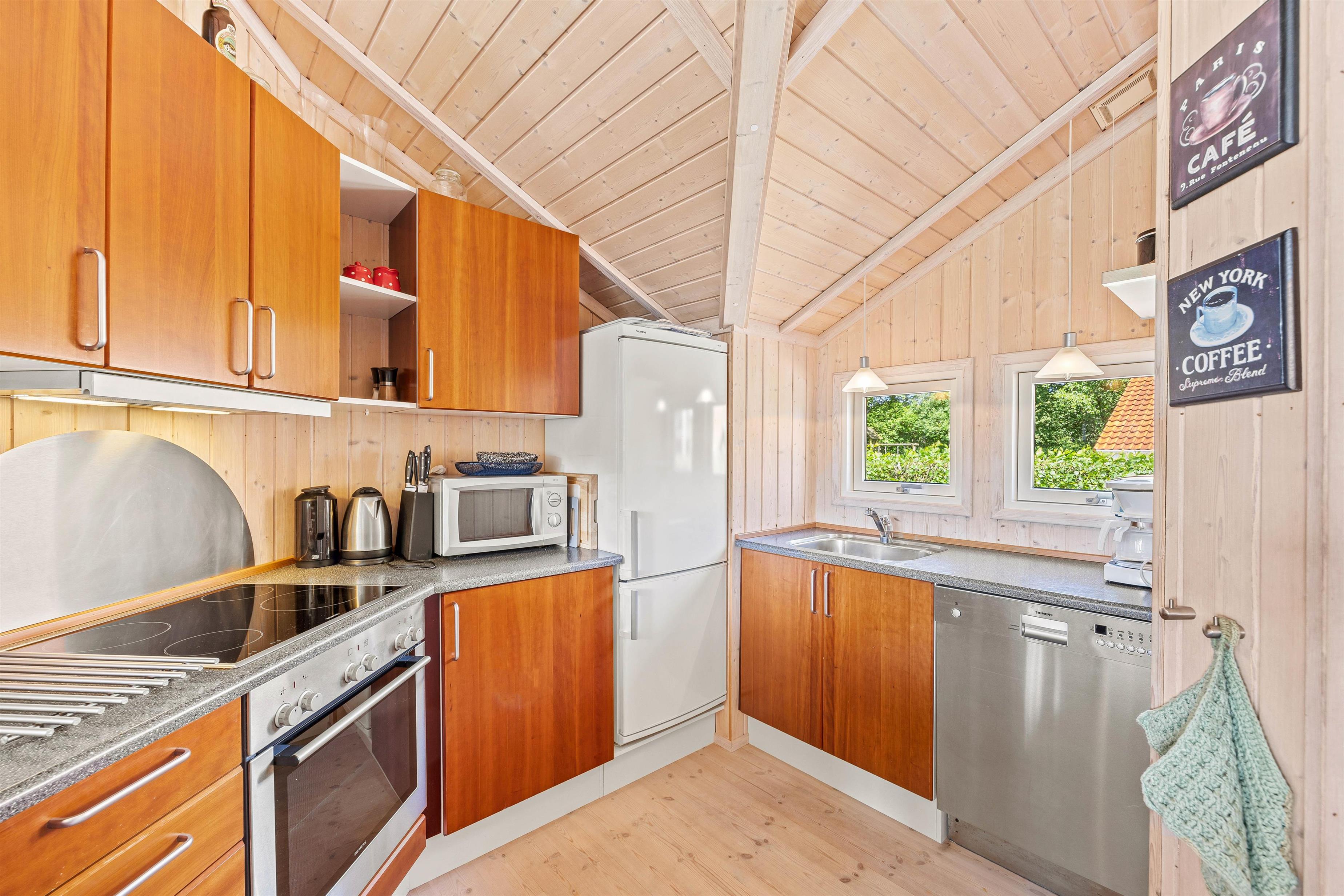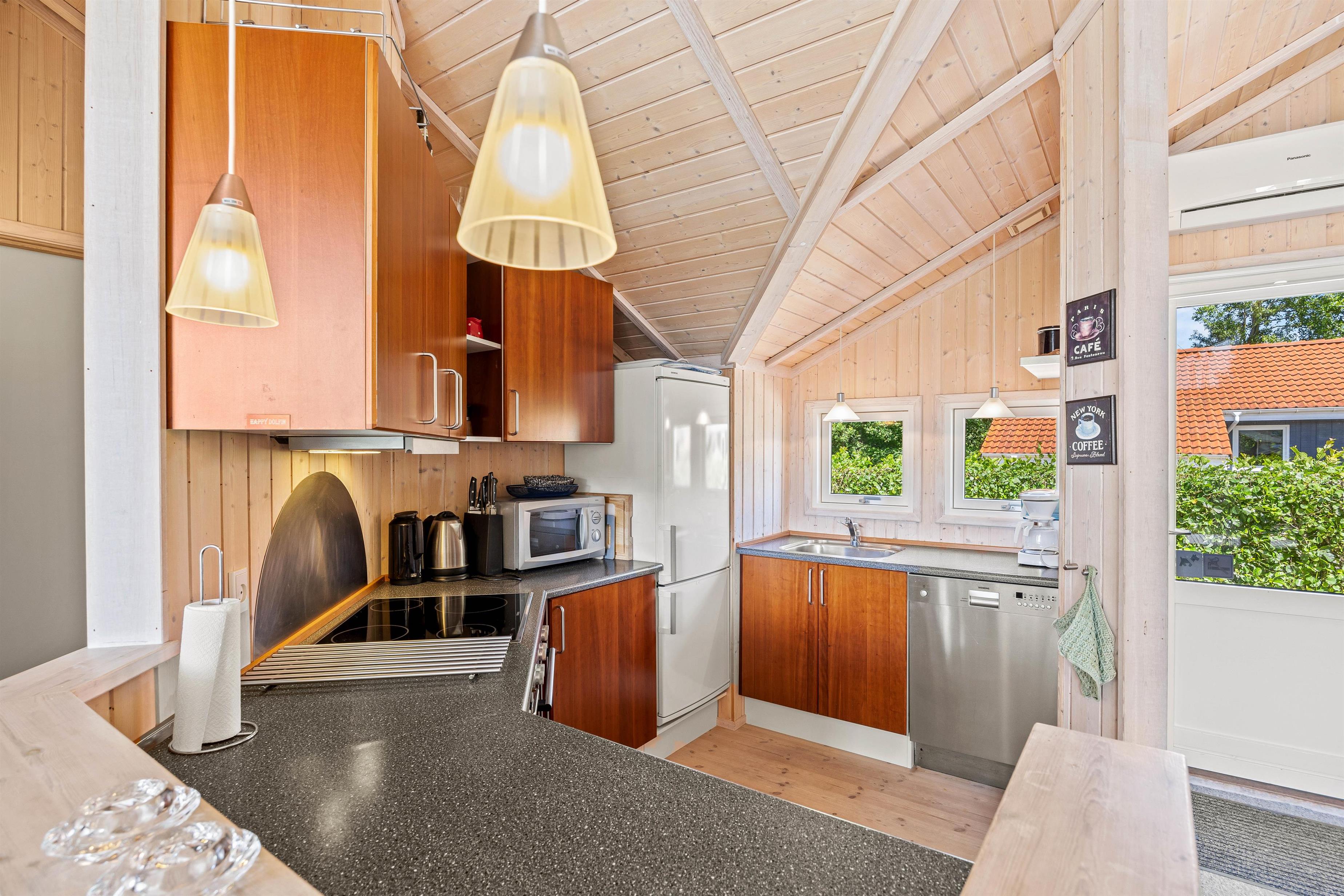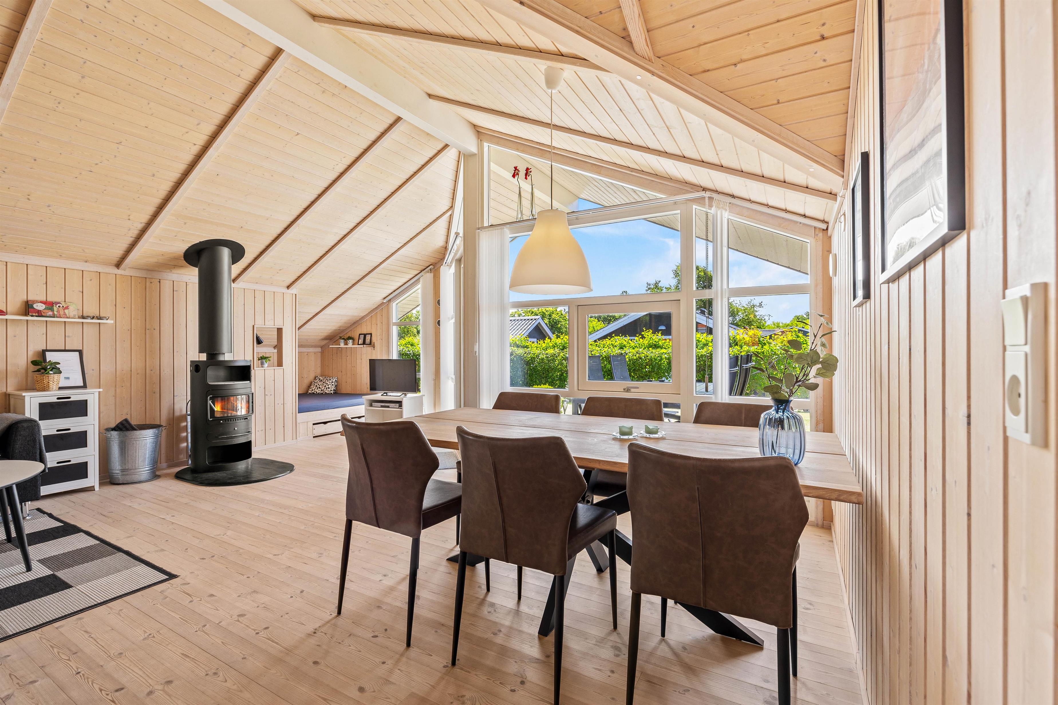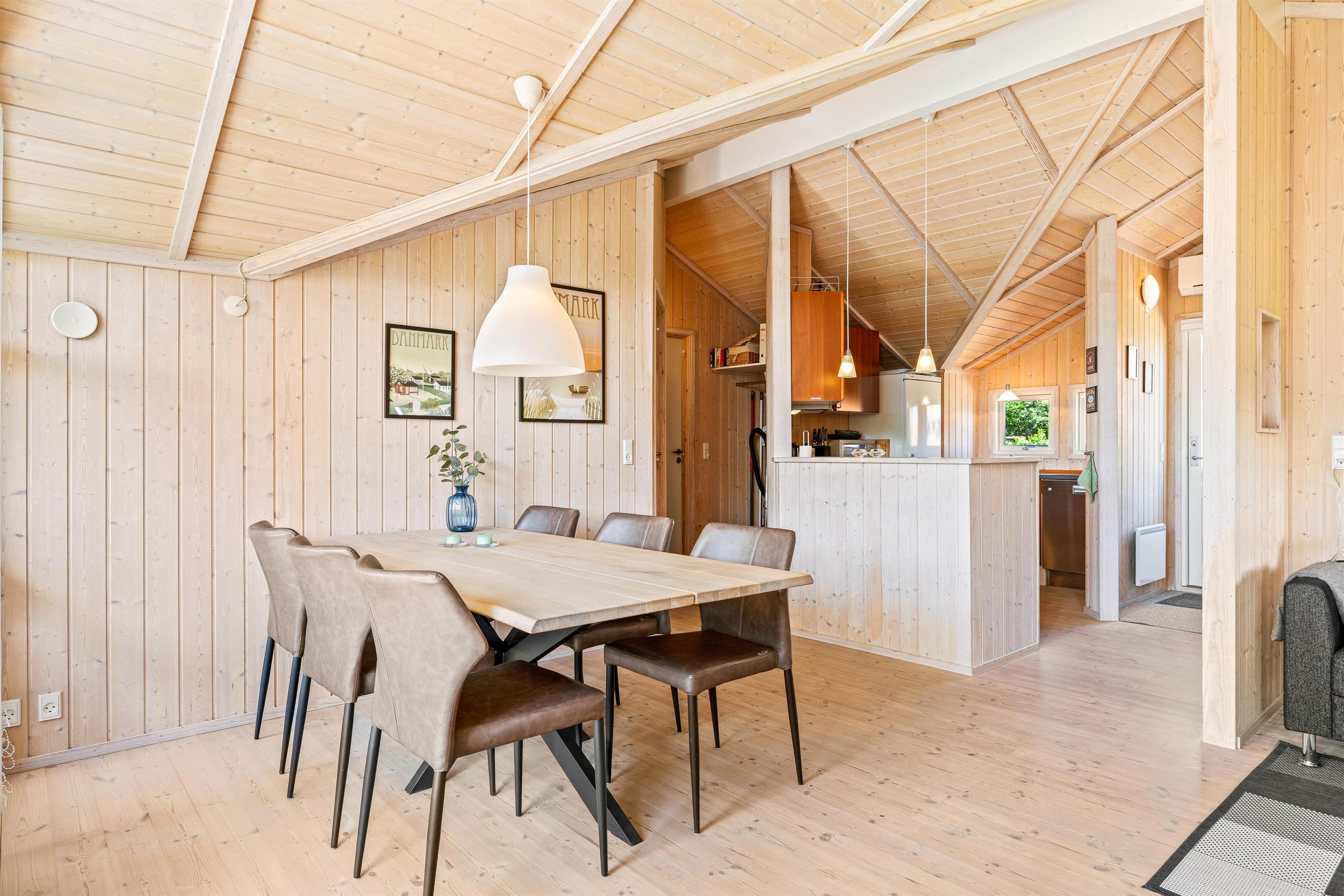 Indendørs byder dette sommerhus på en behagelig atmosfære og praktiske faciliteter, der gør jeres ophold komfortabelt. Det rummelige køkken giver mulighed for fælles madlavning, mens man samtidig kan nyde udsigten over spisebordet og stuen, der inviterer til hygge og afslapning. Med en opvaskemaskine til rådighed er rengøringen enkel og hurtig.