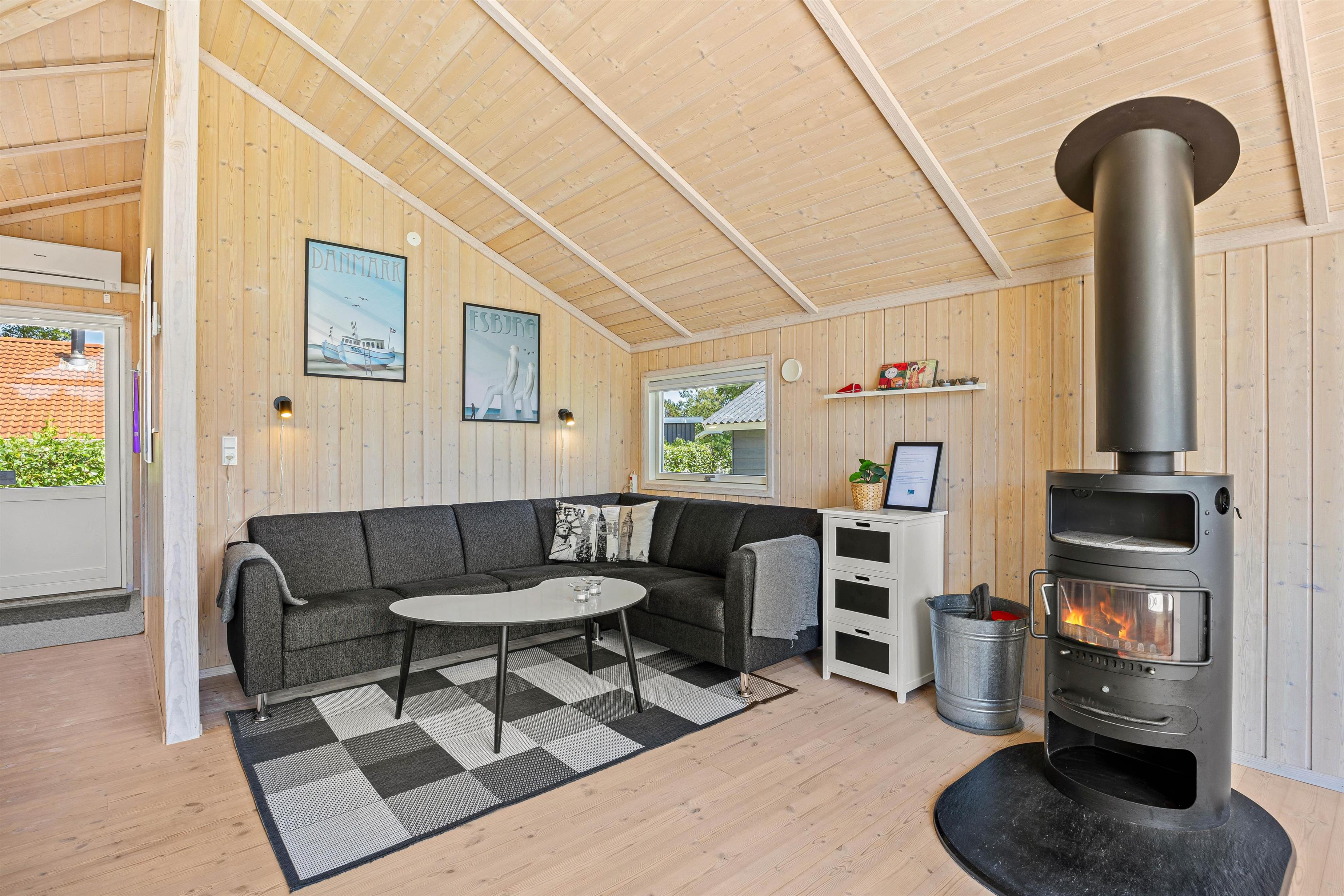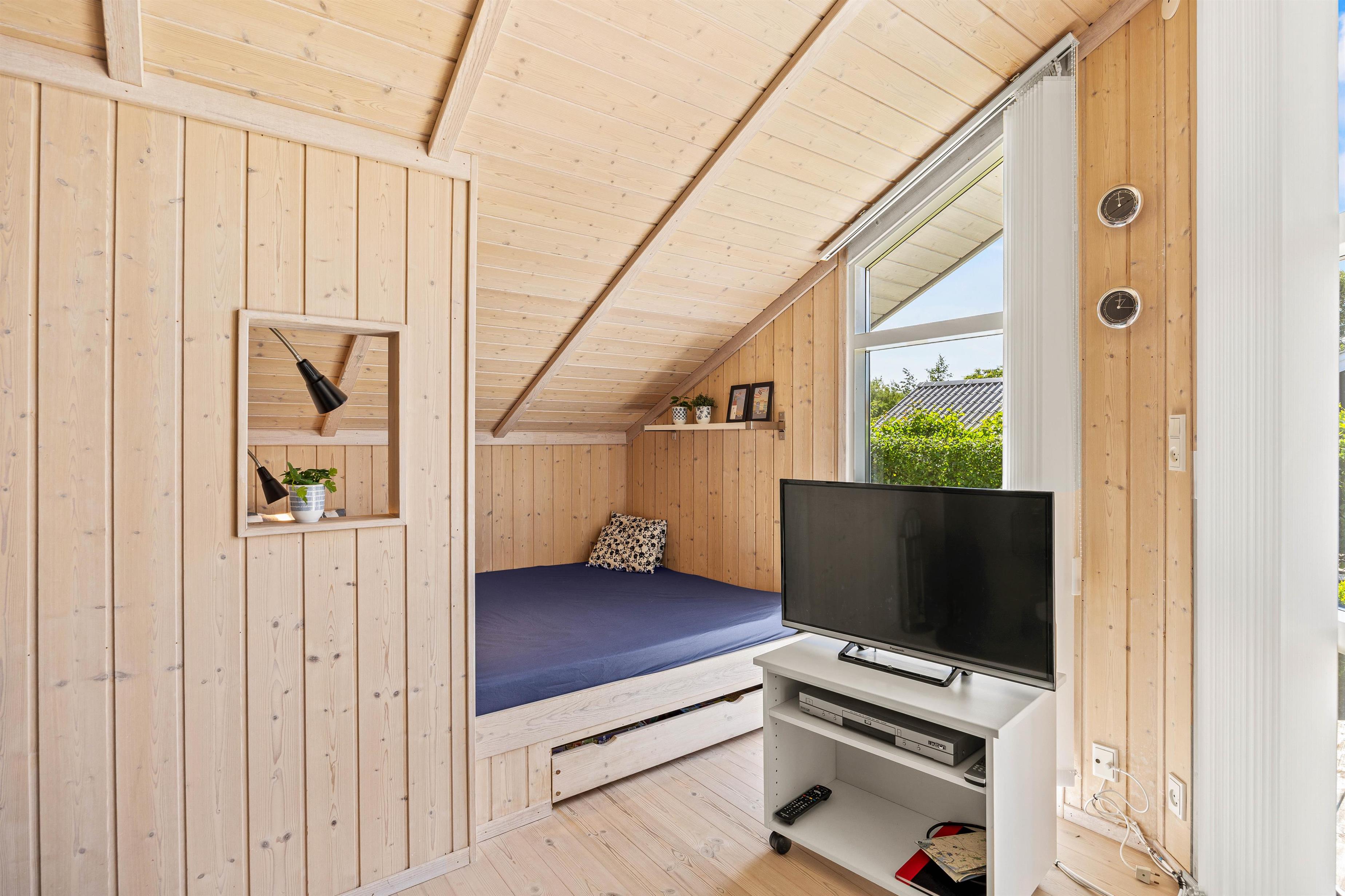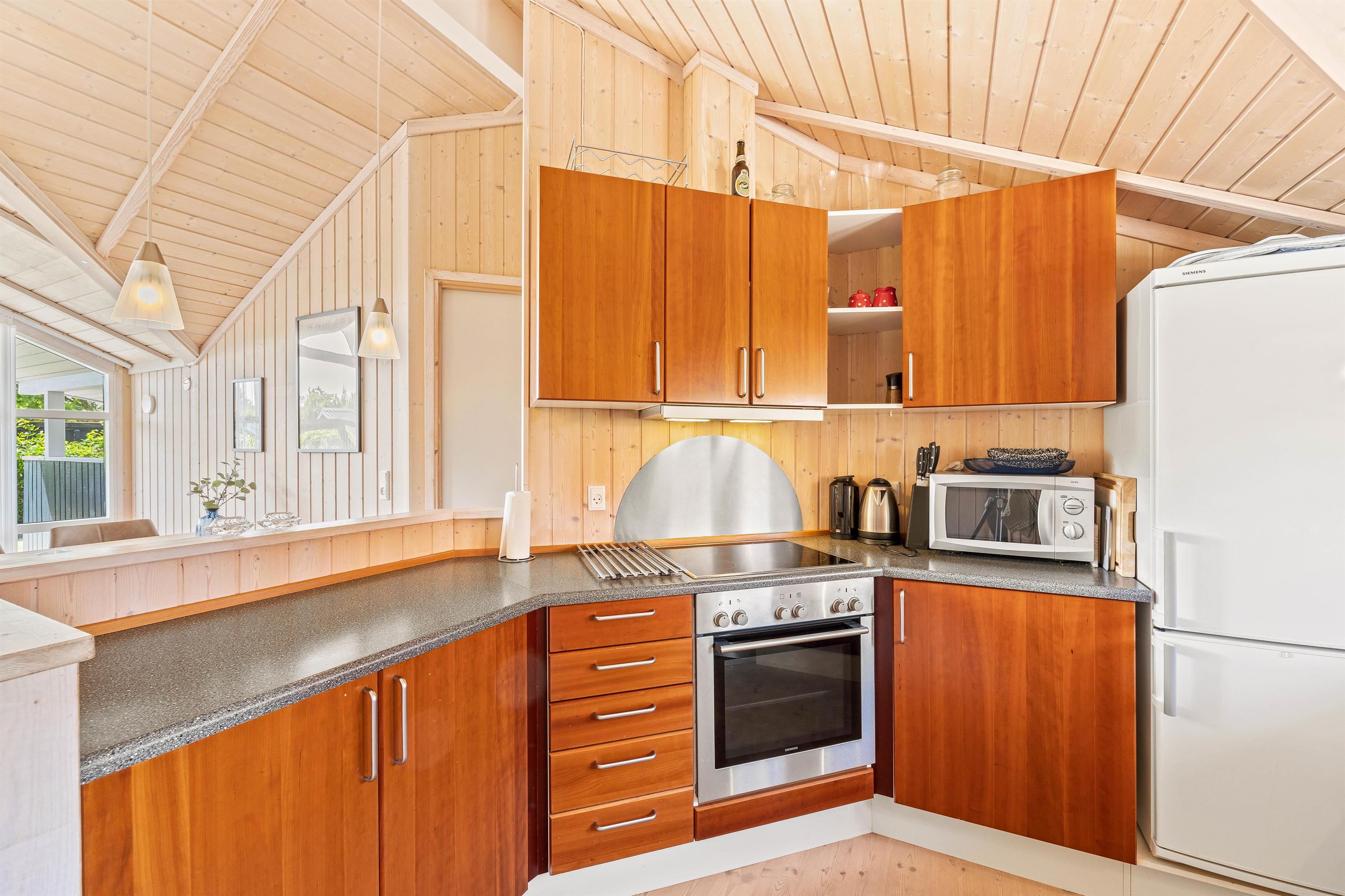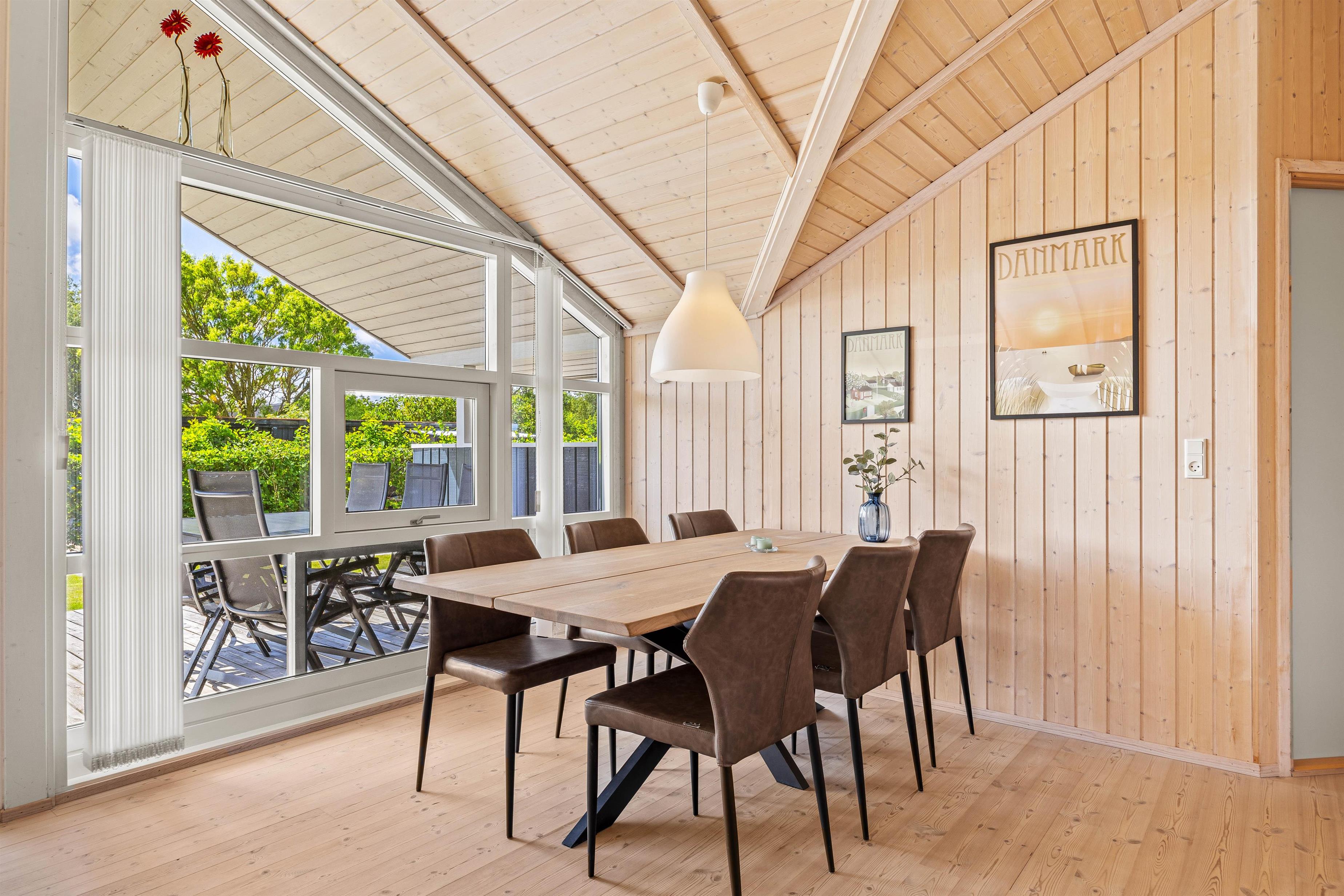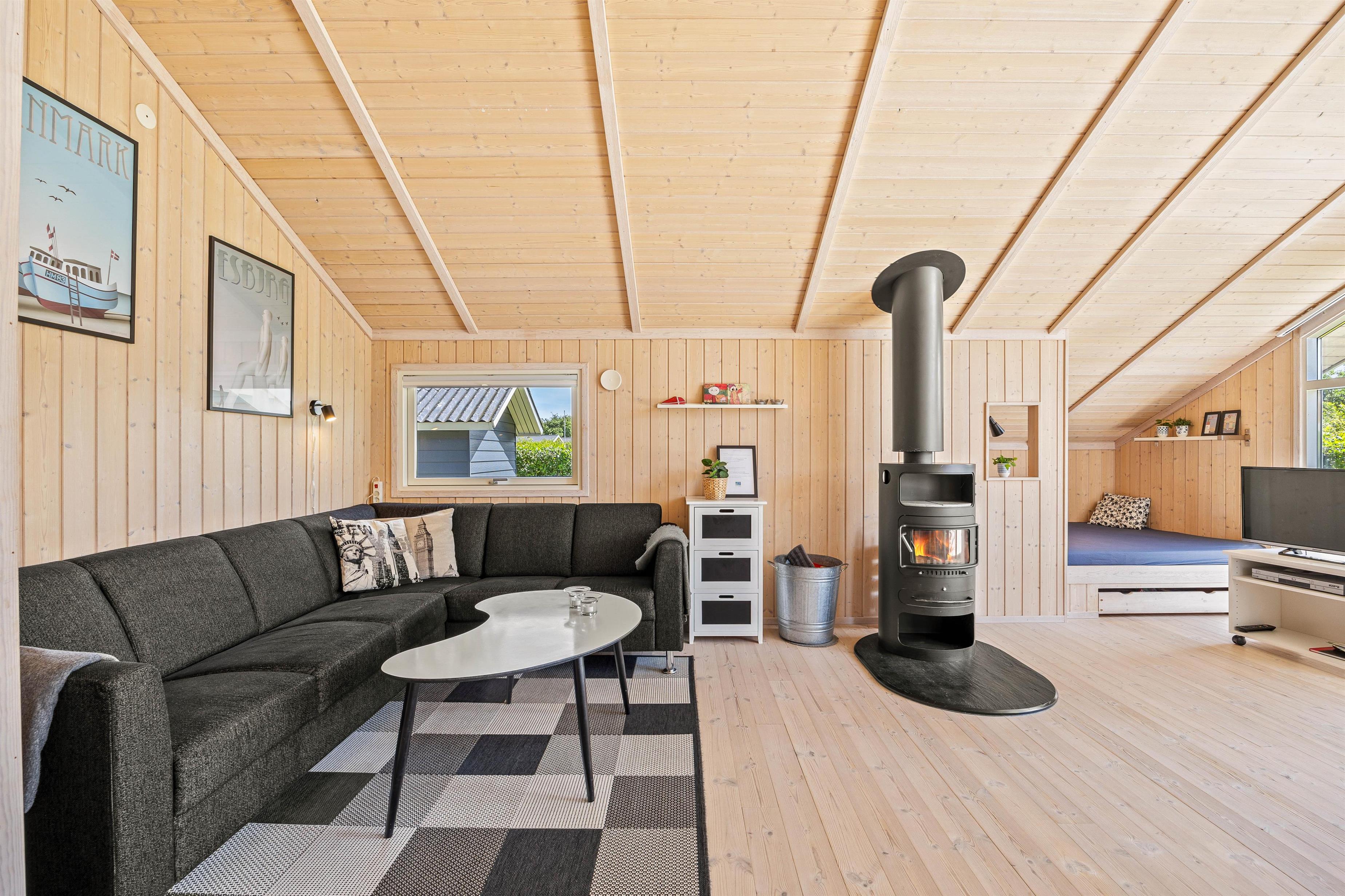 Indendørs byder dette sommerhus på en behagelig atmosfære og praktiske faciliteter, der gør jeres ophold komfortabelt. Det rummelige køkken giver mulighed for fælles madlavning, mens man samtidig kan nyde udsigten over spisebordet og stuen, der inviterer til hygge og afslapning. Med en opvaskemaskine til rådighed er rengøringen enkel og hurtig.