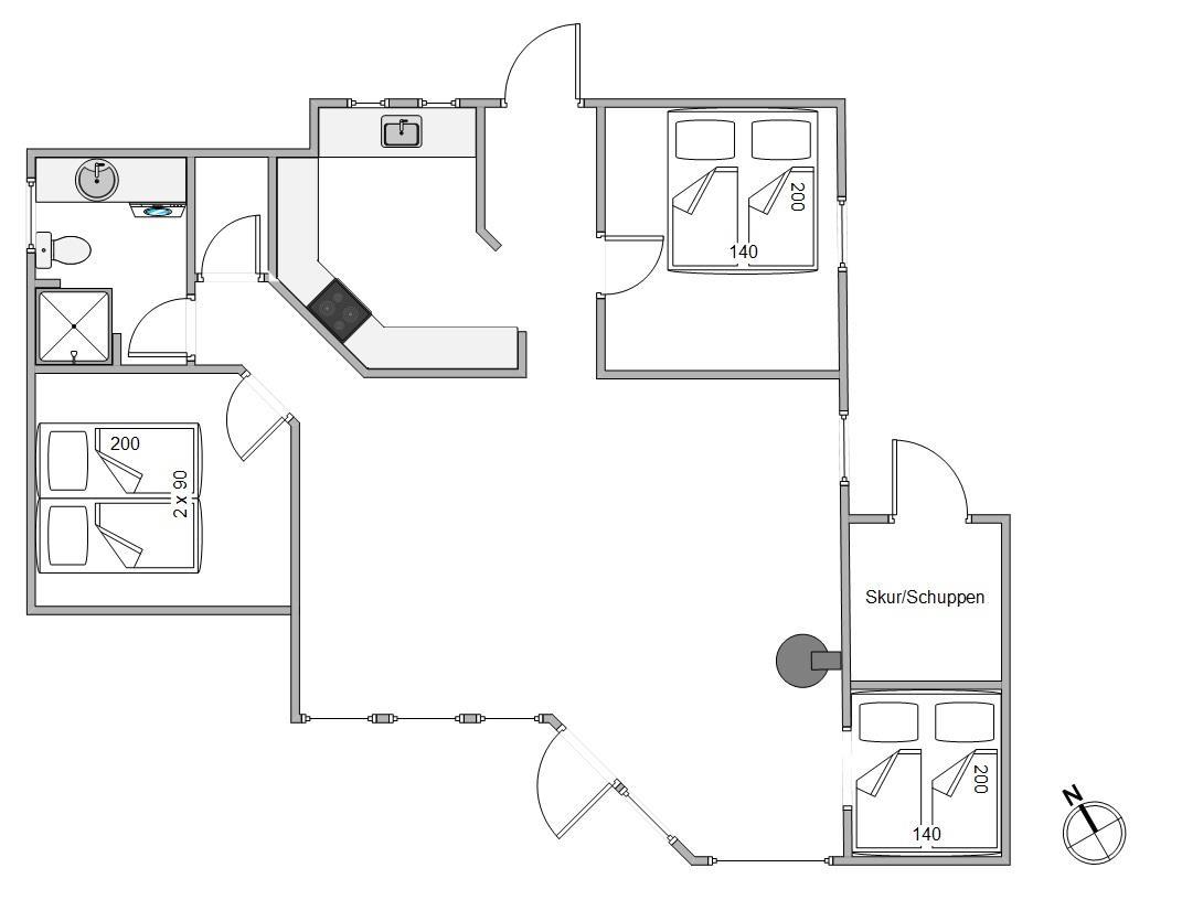 Sommerhuset har 2 komfortable soveværelser, det ene med en dobbeltseng og det andet med 2 enkeltsenge. Derudover er der en hyggelig alkove i forlængelse af stuen, udstyret med endnu en dobbeltseng, hvilket gør stedet perfekt til en familie- eller vennetur.