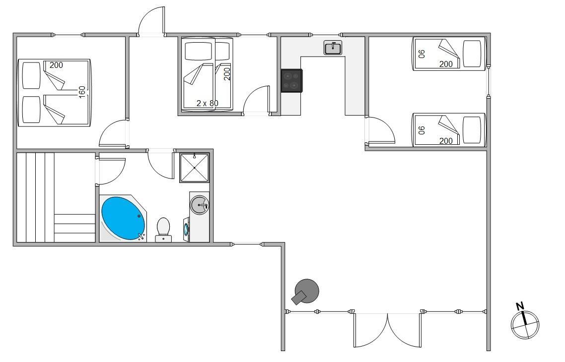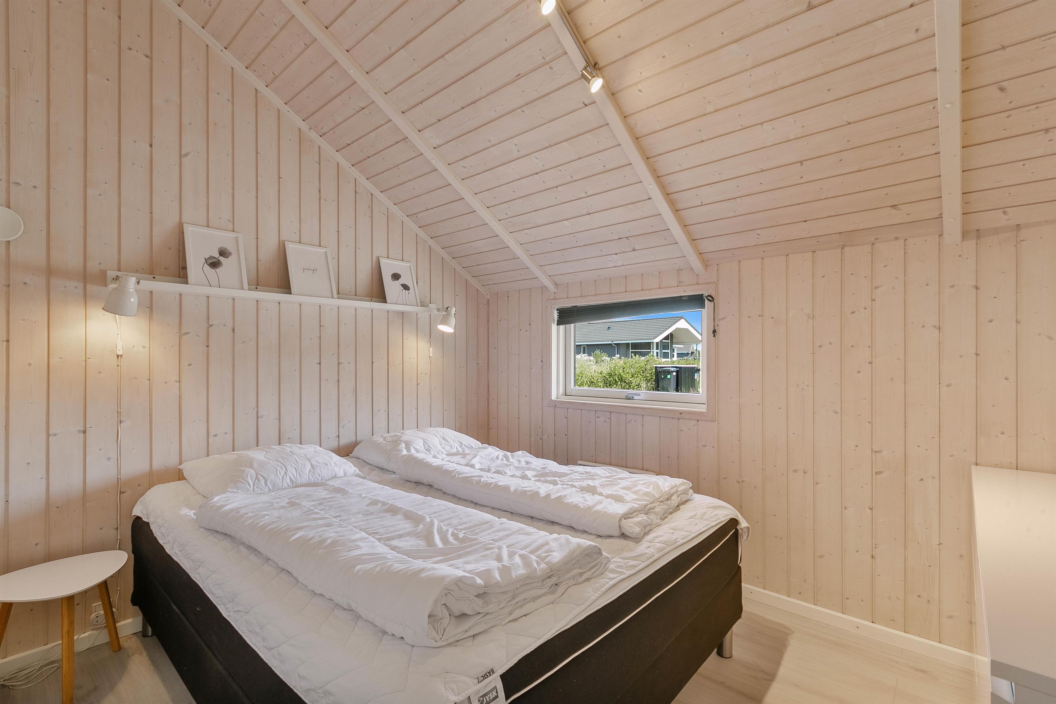 Sommerhuset har tre komfortable soveværelser. Det ene soveværelse er indrettet med en 160’er dobbeltseng. De to andre soveværelser er udstyret med to enkeltsenge og en køjeseng, hvilket gør dem perfekte til børnefamilier. Badeværelset er udstyret med gulvvarme og inkluderer en tømmespa til to personer for ultimativ afslapning. Som et ekstra element af luksus findes der også en sauna.