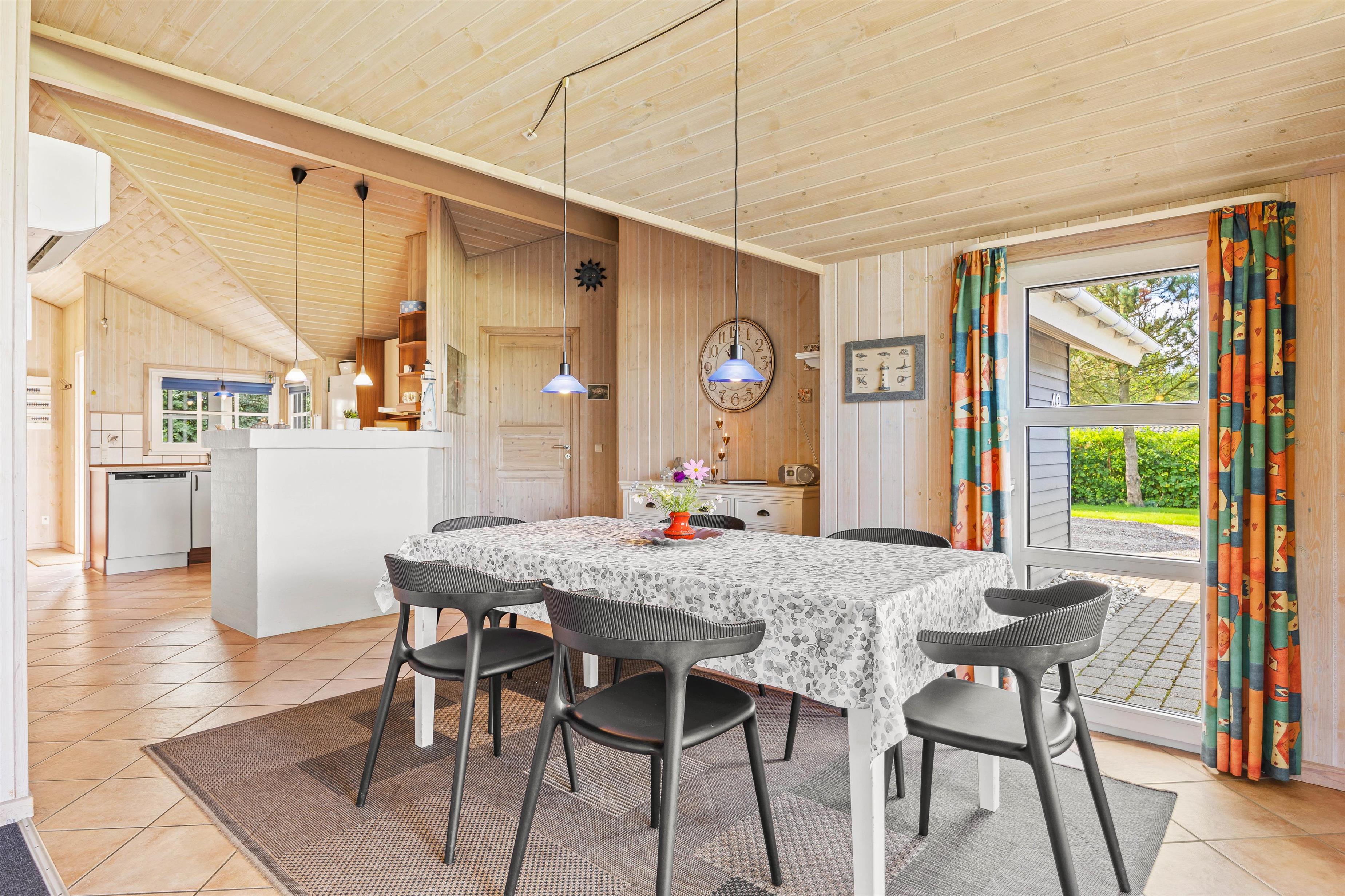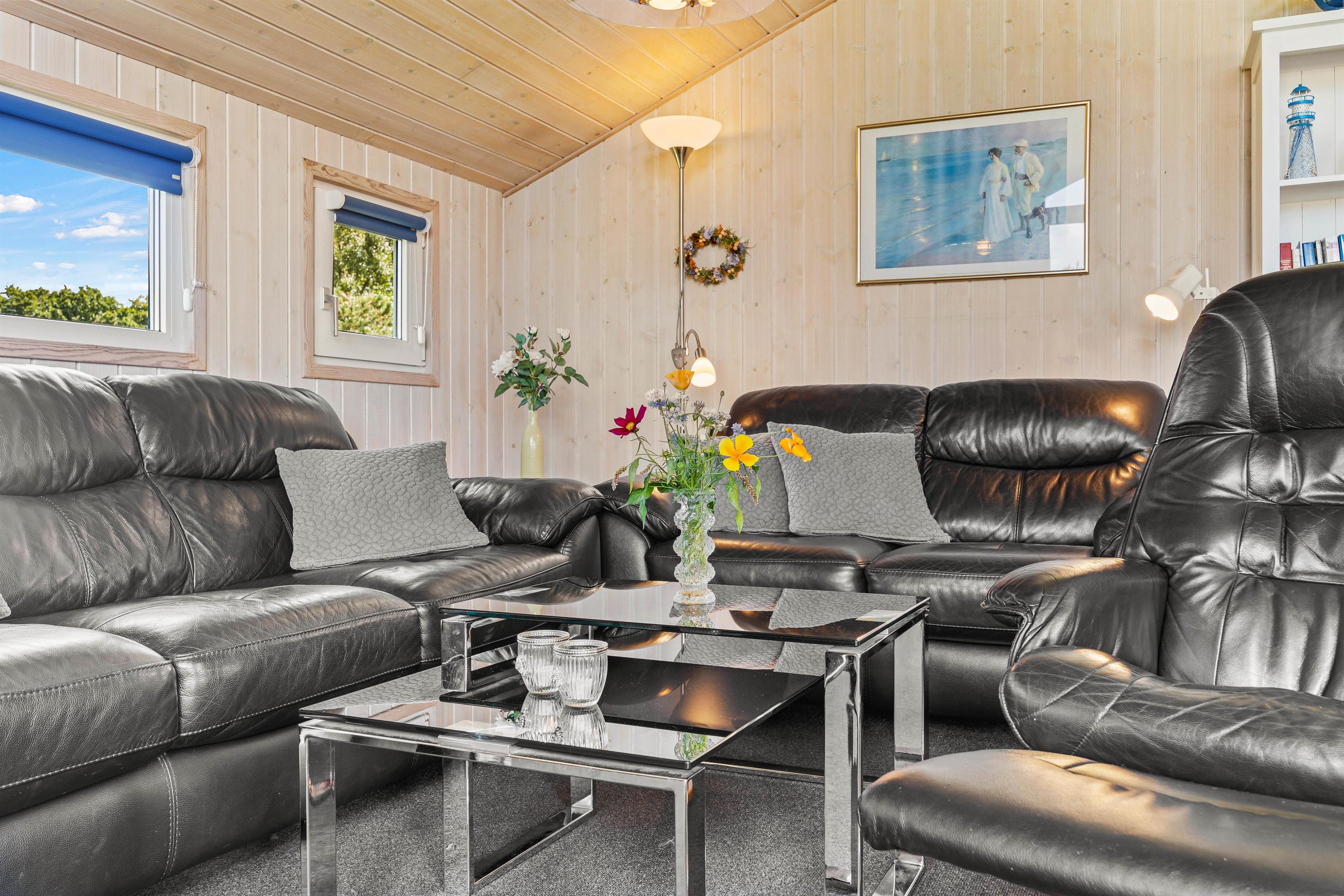 I stuen er der et stort vinduesparti, som giver en masse sollys og en dejlig udsigt til det fri. Her er gode og hyggelige siddepladser, hvorfra I kan se dagens nyheder på tv'et eller læse en bog i fred og ro. Tænd op i brændeovnen, mærk varmen sprede sig gennem sommerhuset og lad jer fortrylle af de dansende flammer.
