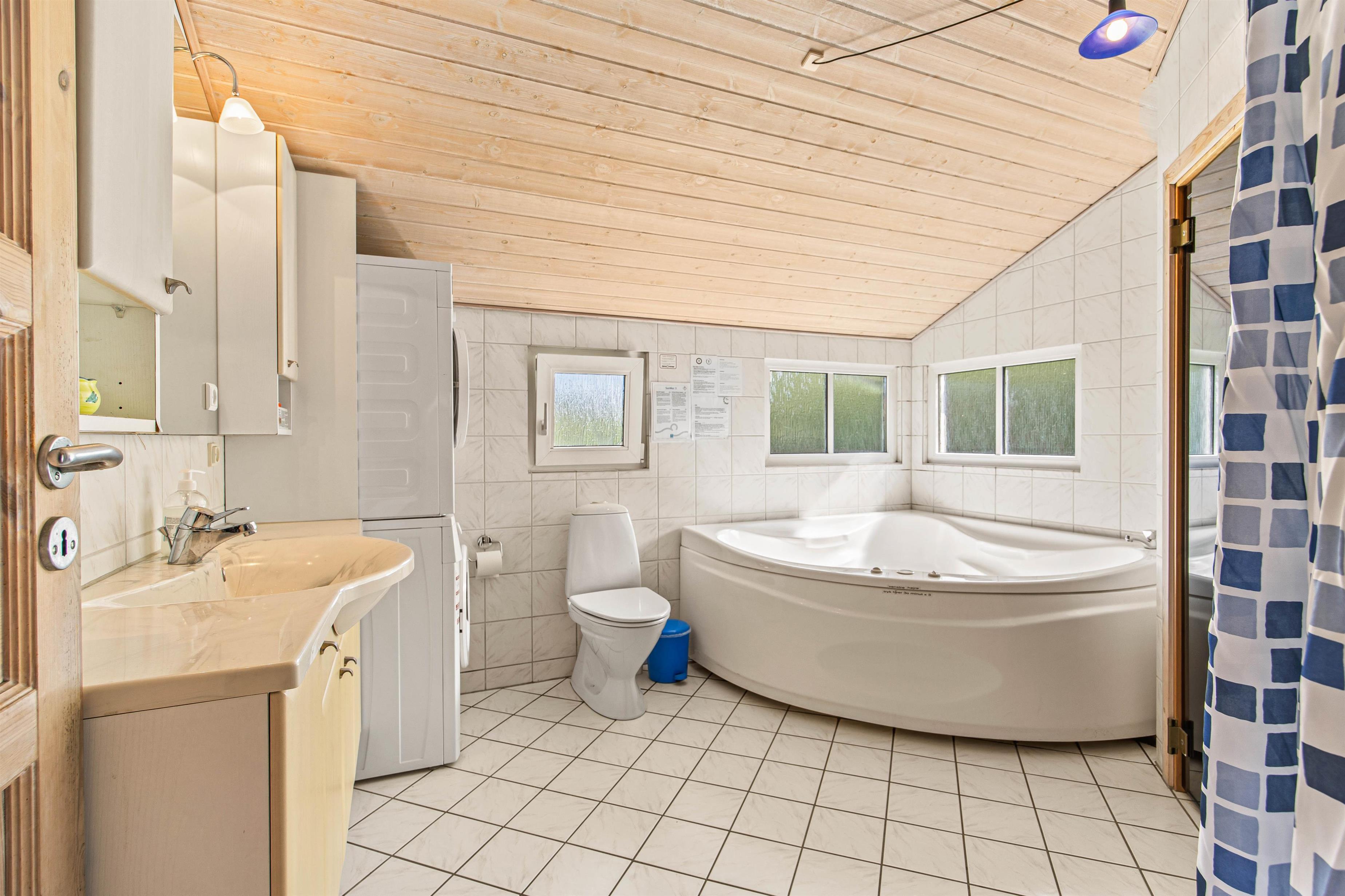 På sommerhusets badeværelse er der både spabad og sauna, hvilket er helt perfekt til ro og afslapning efter en sjov og oplevelsesrig dag med familien.