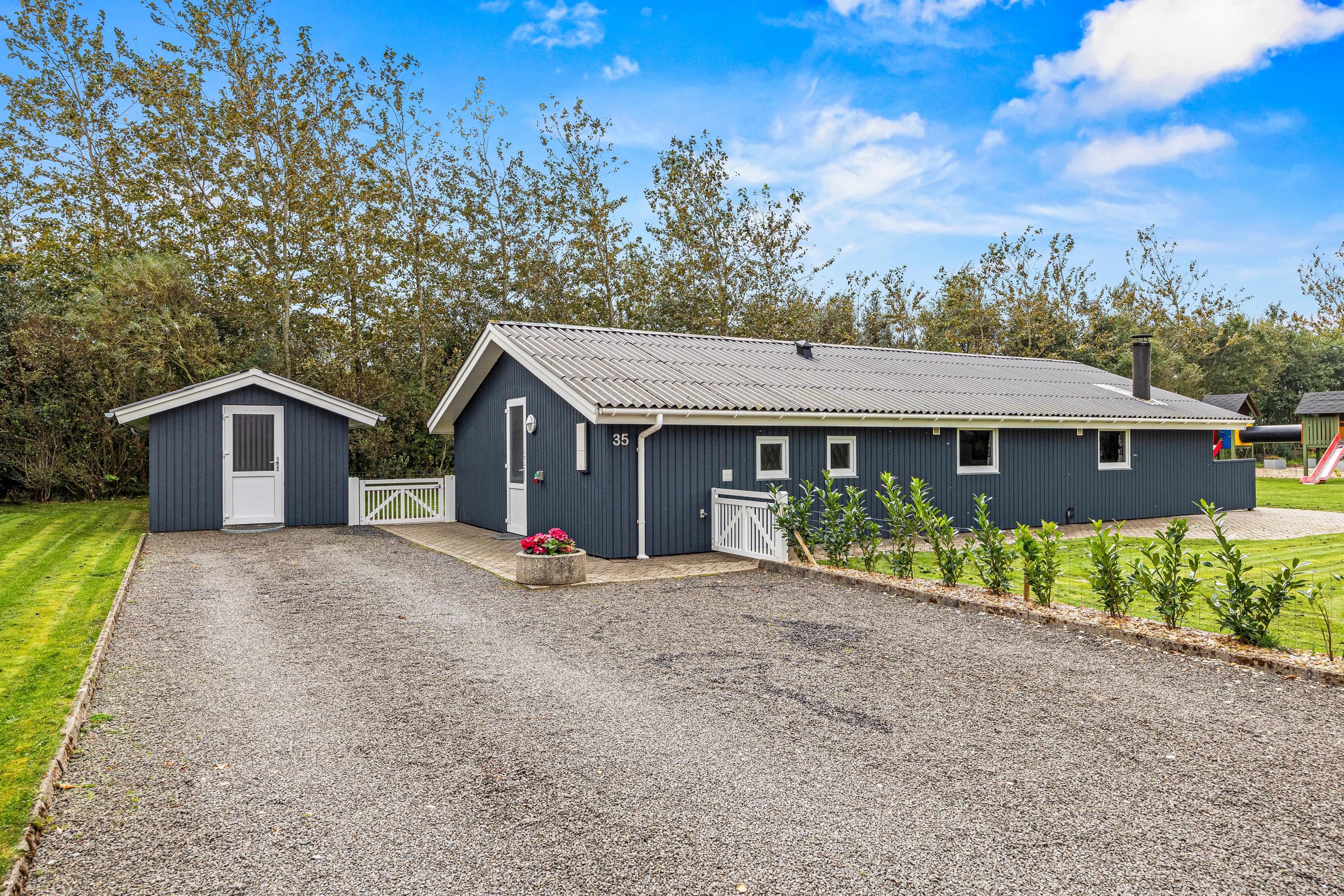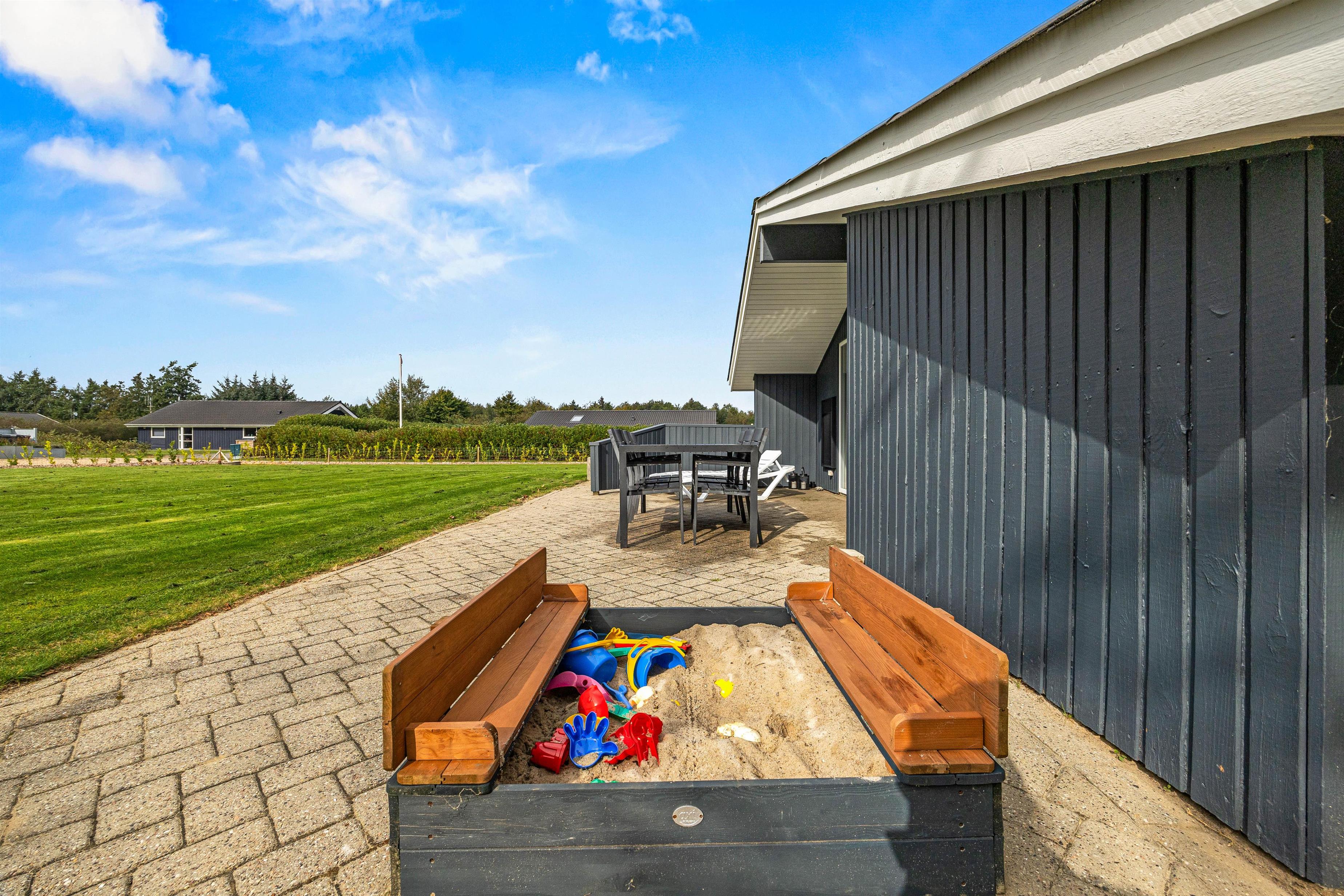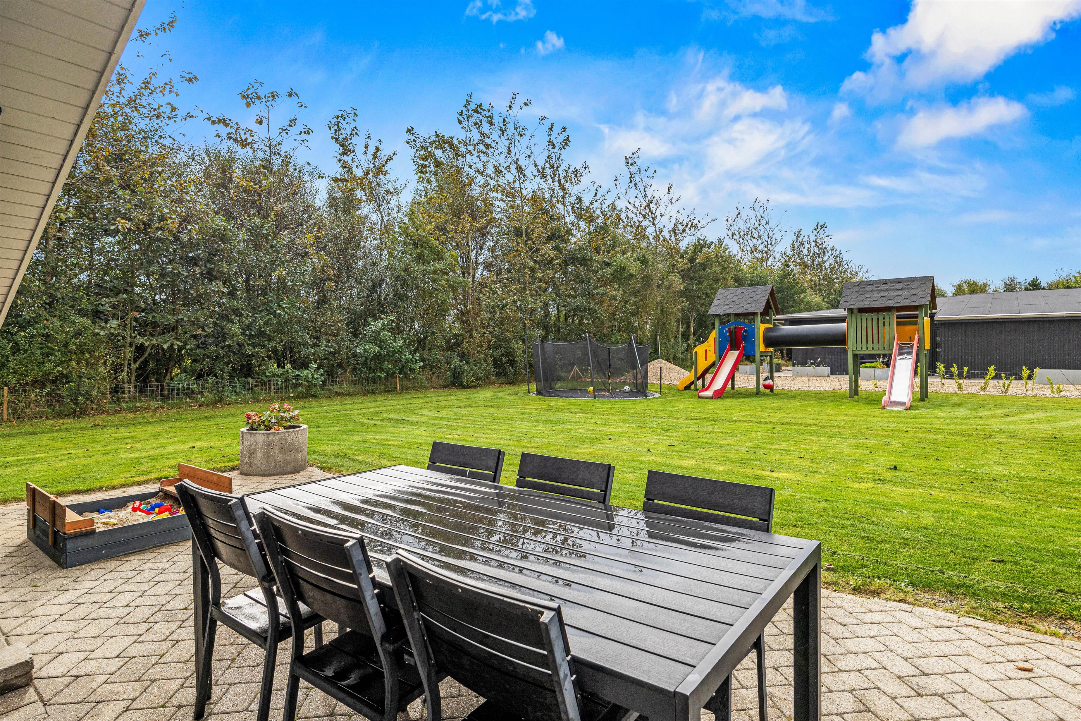 Også her er det oplagt at afslutte dagen med en dejlig grillaften – dét er ægte hygge. Den store, indhegnede have vil blive et sikkert hit for børnene, der desuden også finder en trampolin, sandkasse og et gyngestativ på grunden. I sandet kan der bygges flotte sandslotte, og især trampolinen plejer at være et hit hos de små.