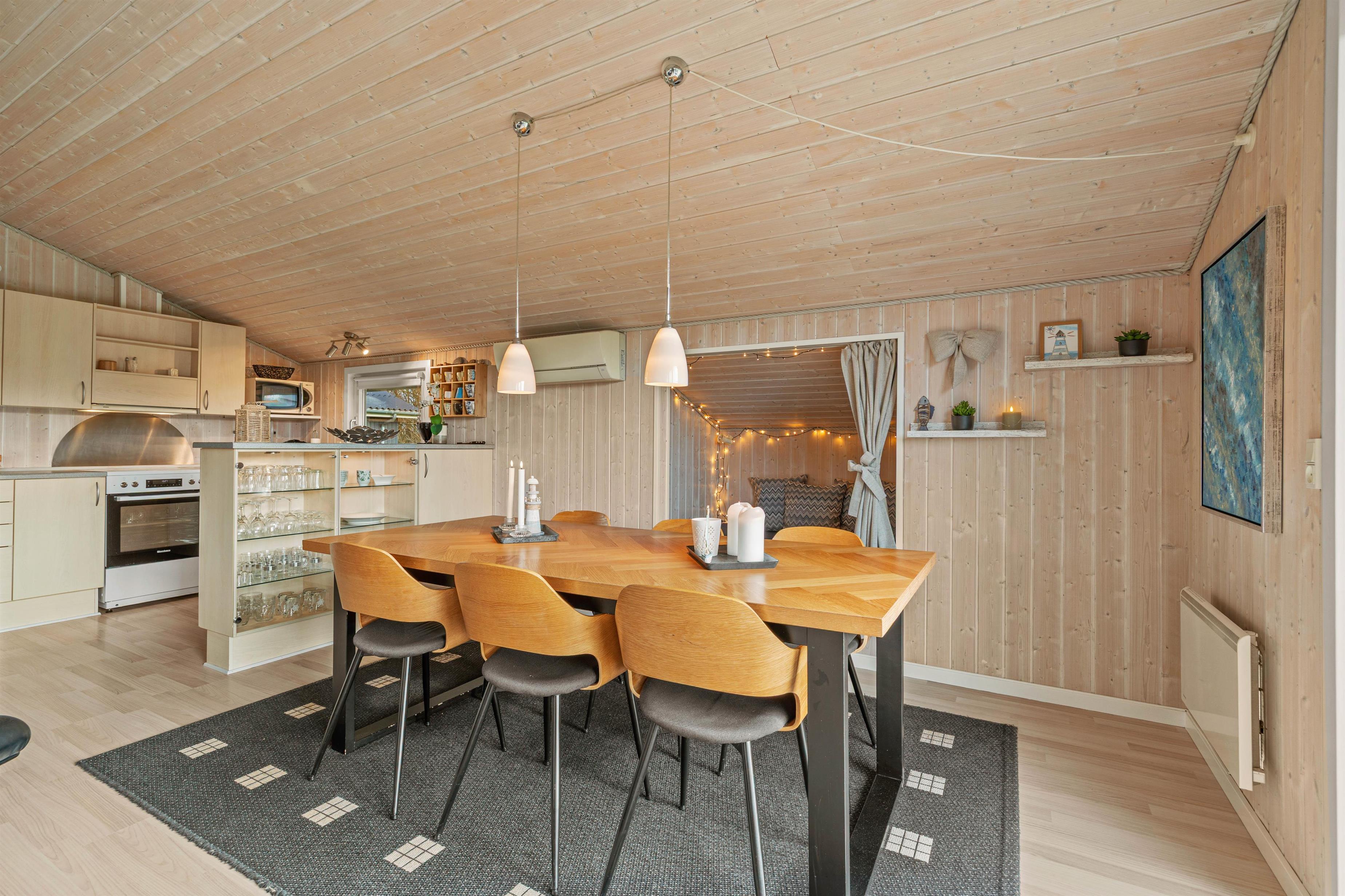 Stuen er udstyret med en brændeovn og en hyggelig alkove, der både kan bruges som hyggekrog og soveplads. På de køligere aftener kan I samles i sofaen for at se en god film, som kan streames via Chromecast.