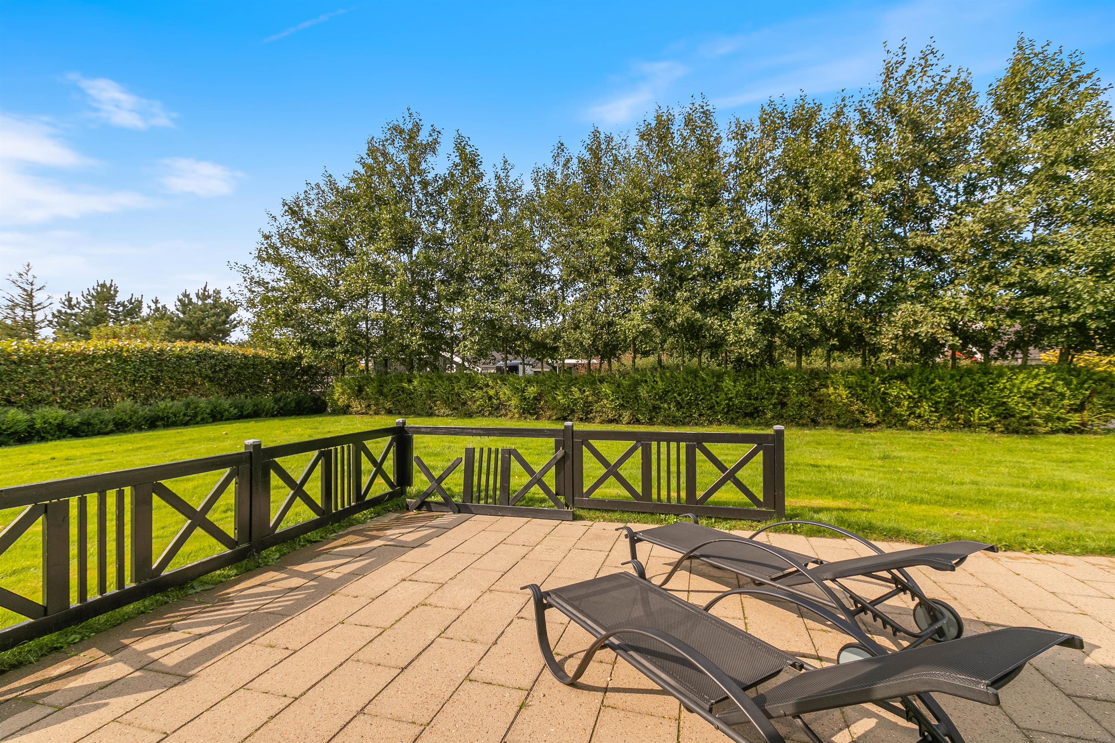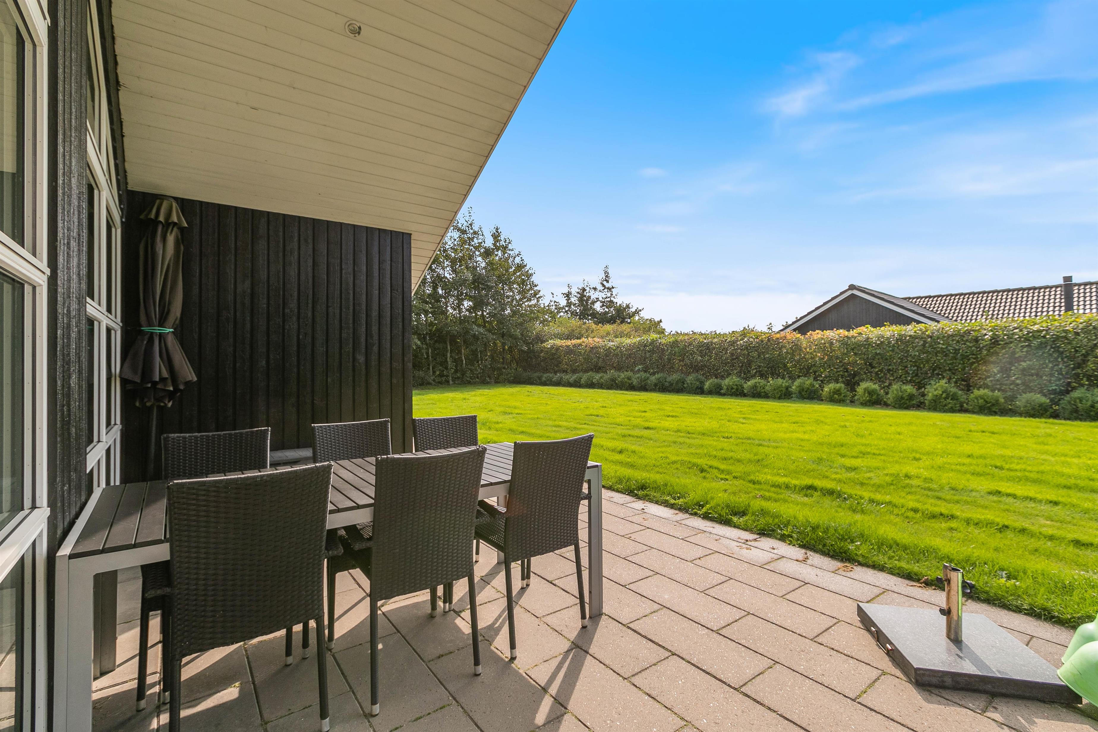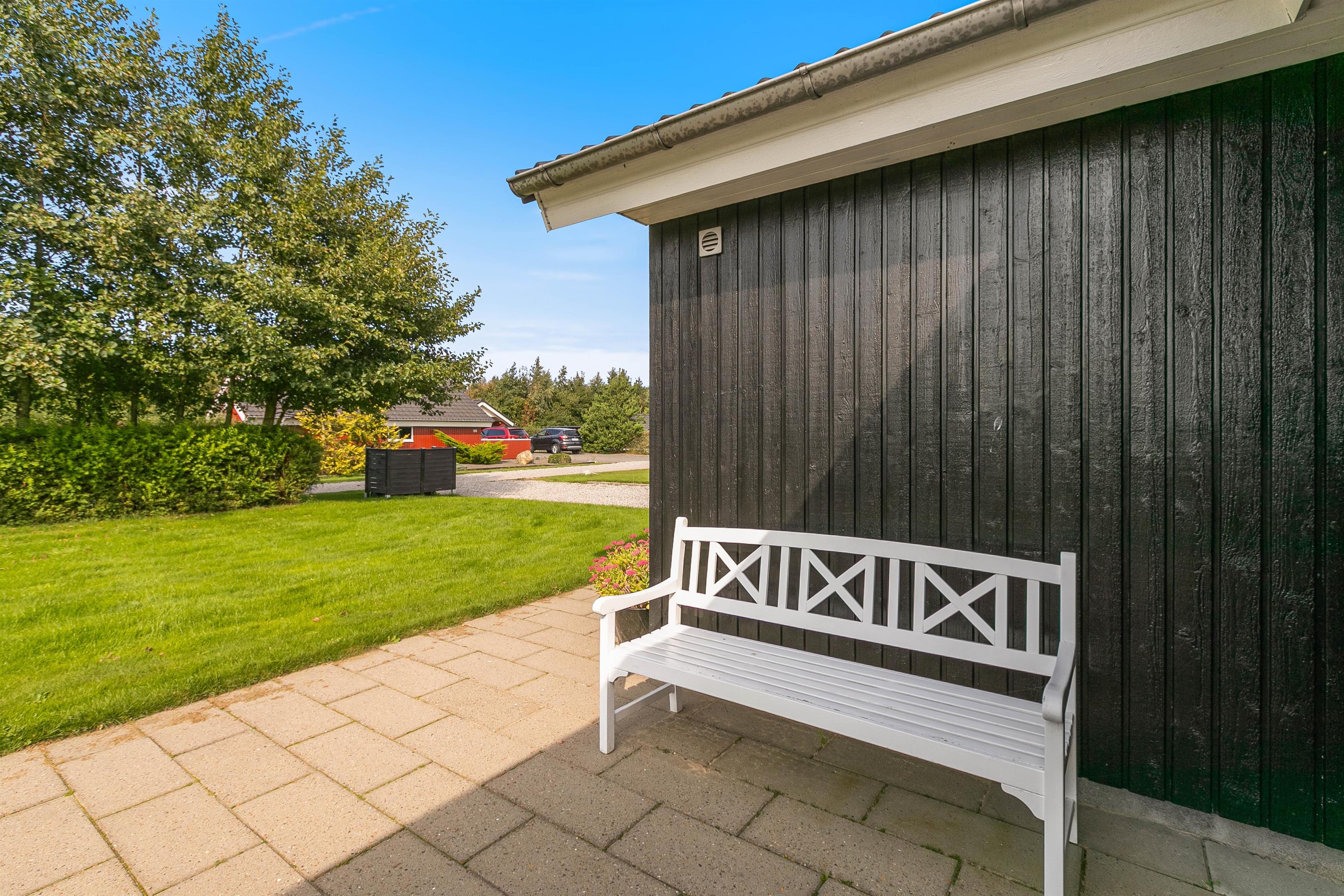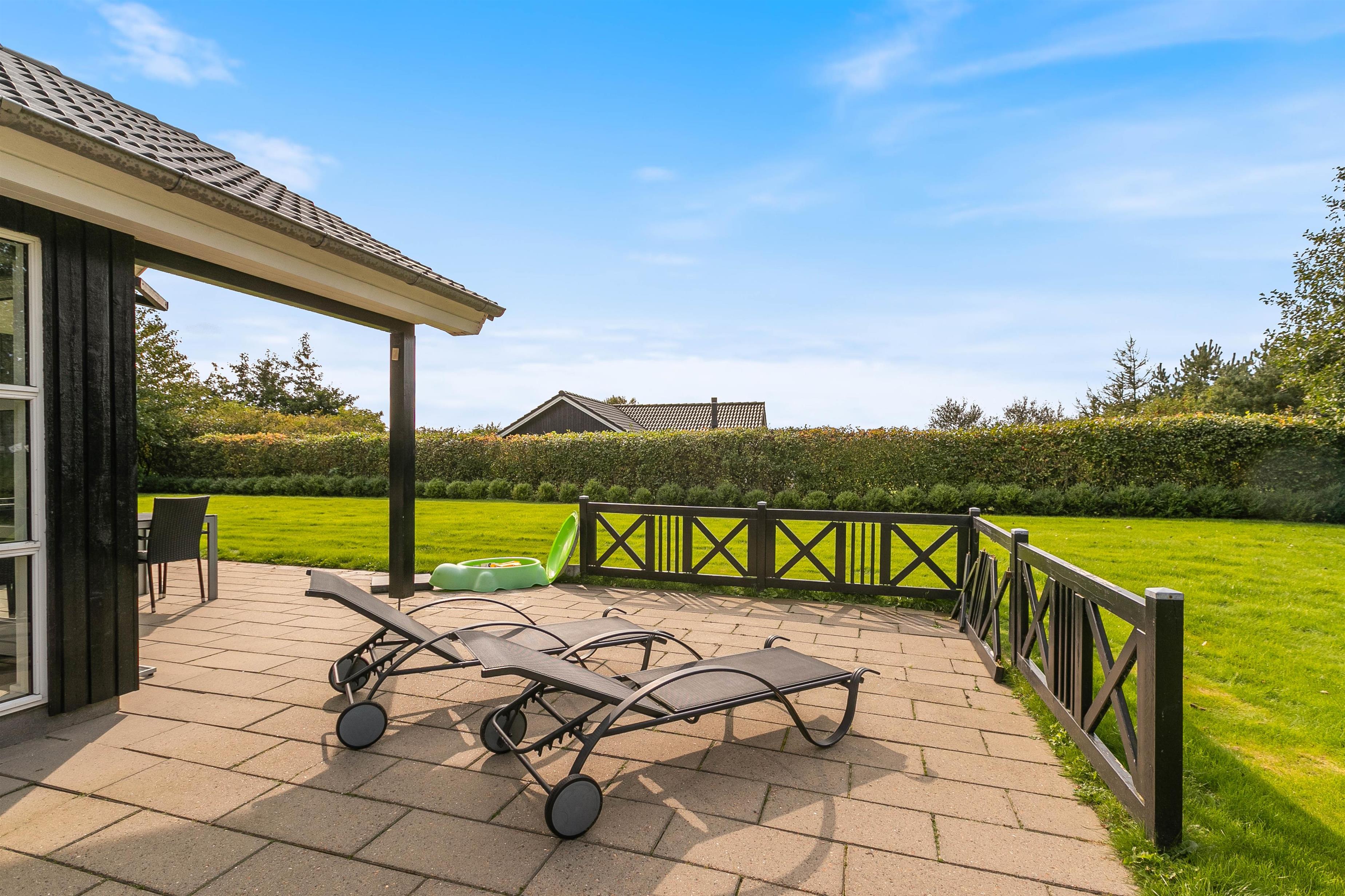 Uderummet er uden tvivl mindst lige så vigtigt! Og her er der heller ikke noget at sætte en finger på. Den store flisebelagte terrasse går næsten rundt om hele feriehuset og giver mulighed for at nyde solen hele dagen. Her står havemøbler og liggestolene klar til jer.