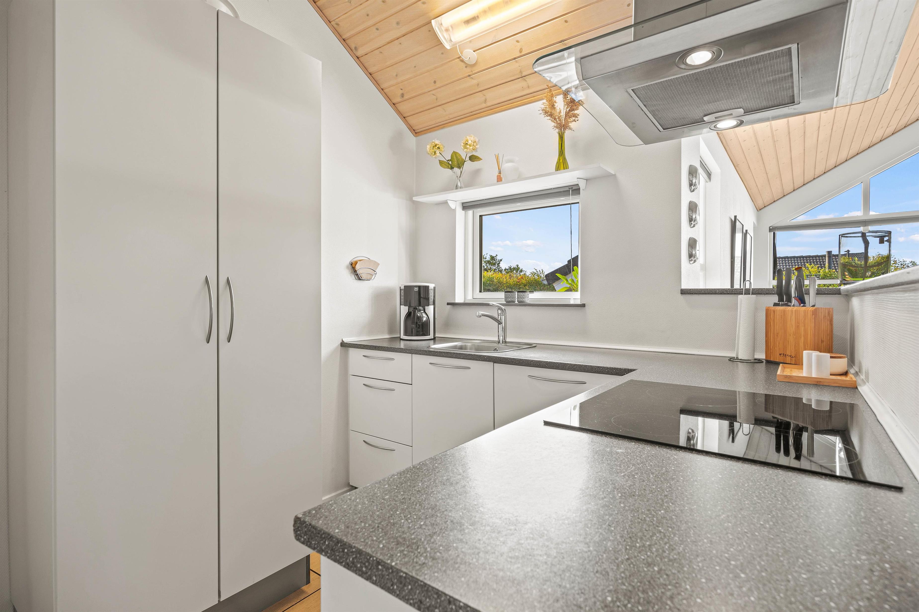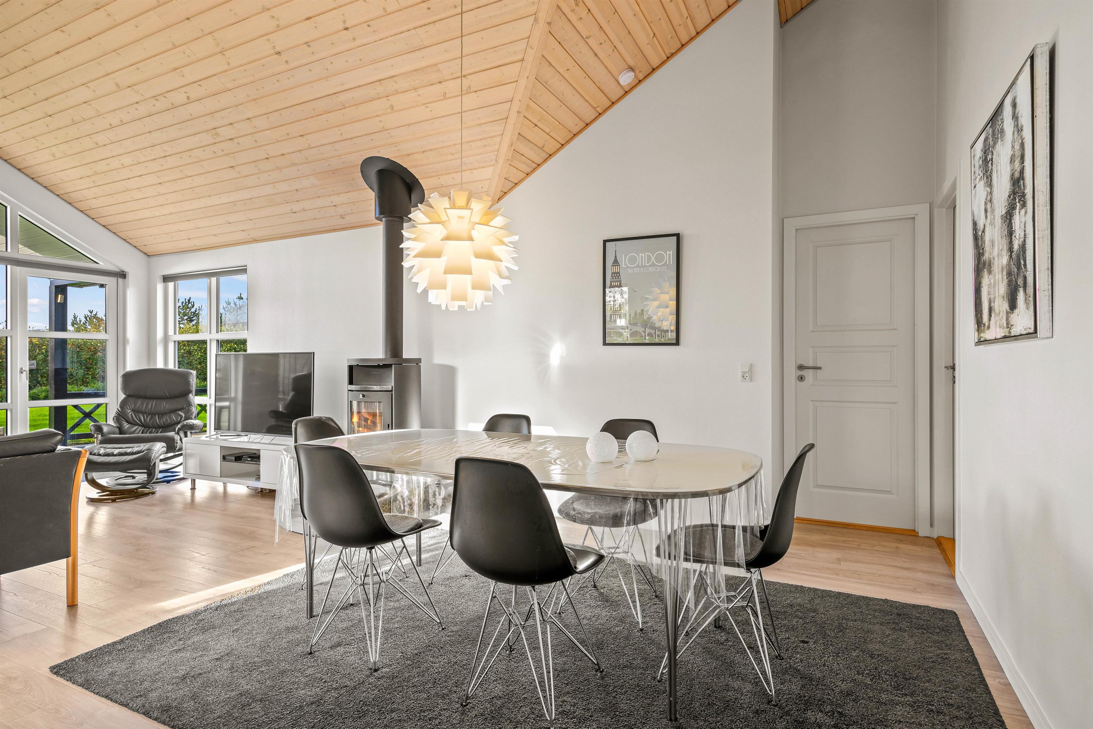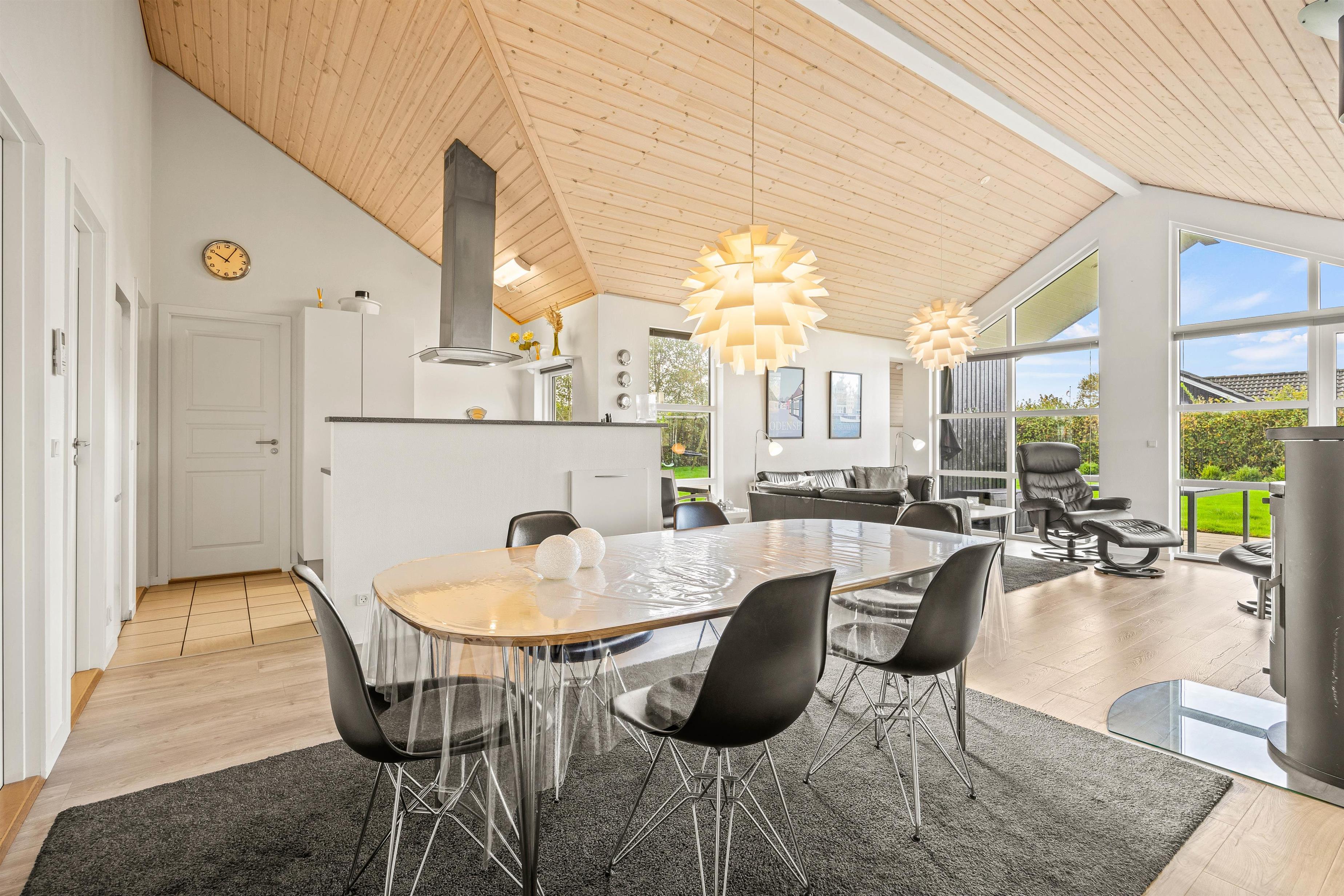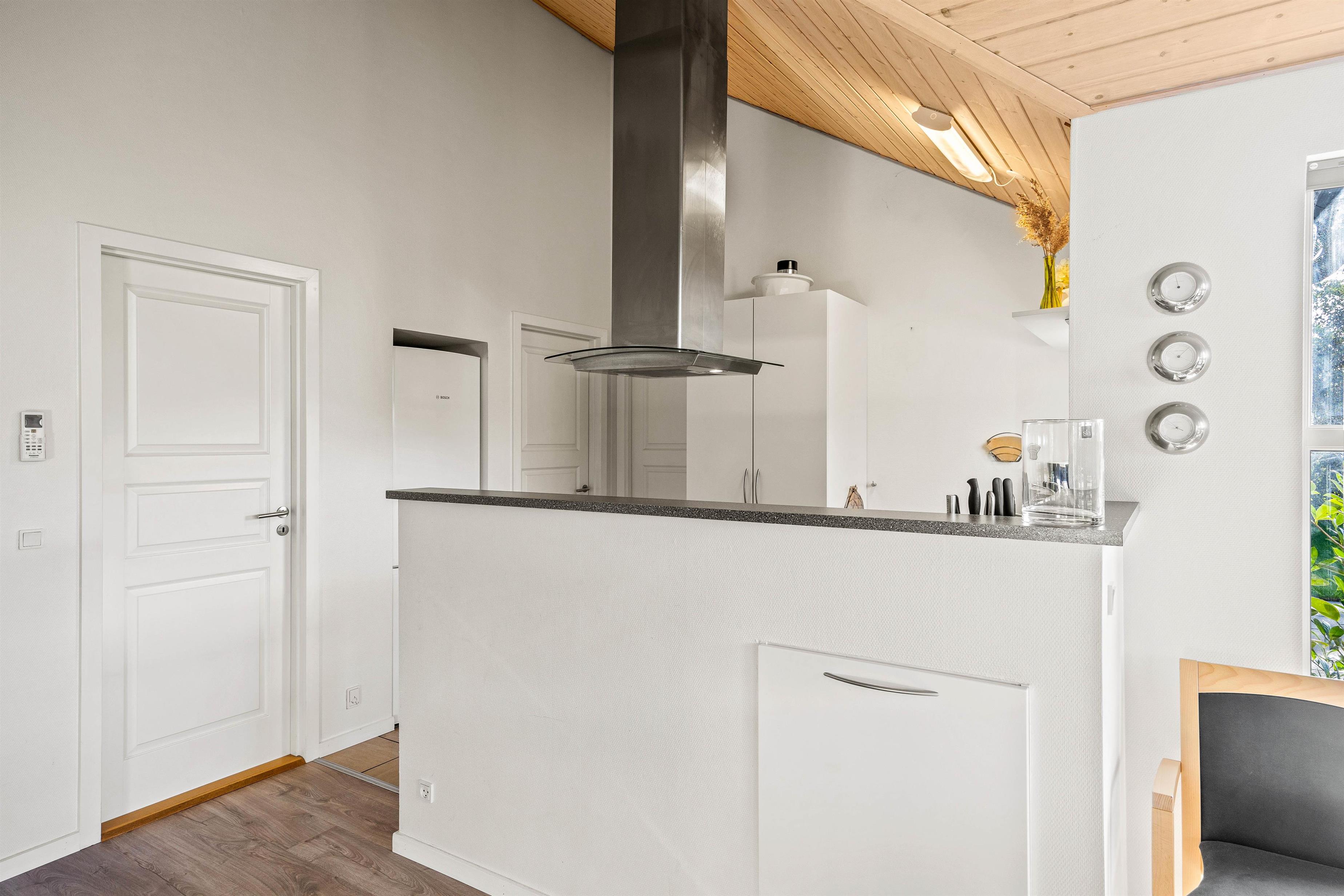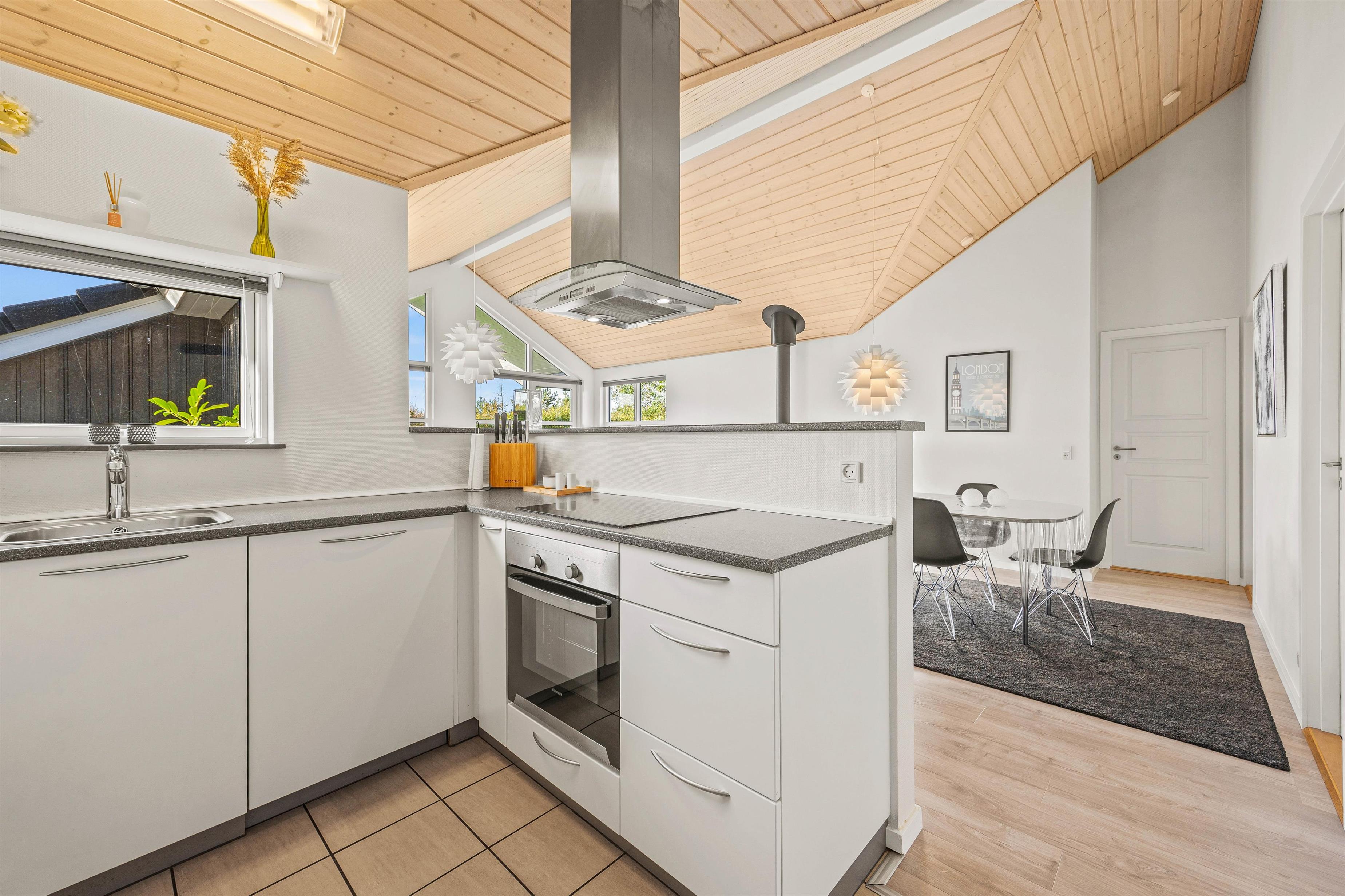 Først træder I ind i entréen med vaskemaskine og tørretumbler samt god plads til opbevaring. Træder I længere ind, kommer I direkte ind i sommerhusets hjerte; det store alrum og samlingspunkt, hvor stue og køkken forenes. Her kan I hygge med spil i sofaen, tegne tegninger omkring spisebordet, mens der laves mad i det veludstyrede køkken. Imens opvaskemaskinen klarer rengøringen, kan I se film sammen i sofaen eller planlægge morgendagens aktiviteter sammen. Med fordel kan I skabe lidt ekstra hygge ved at tænde op i brændeovnen.