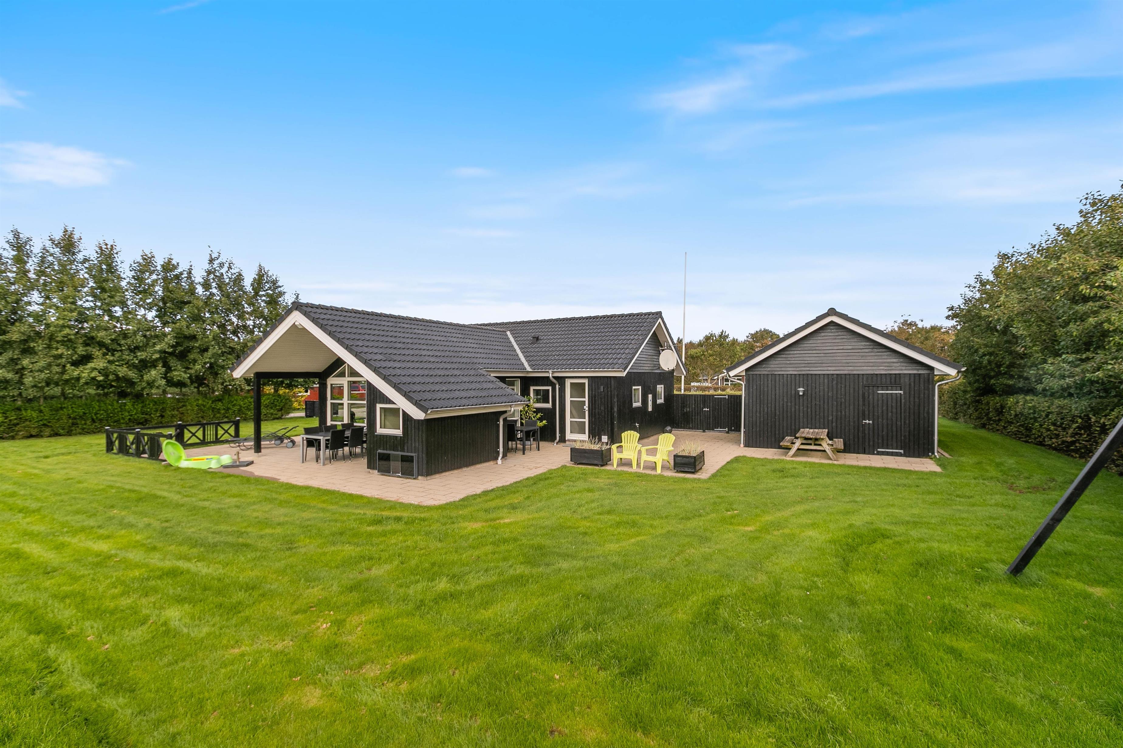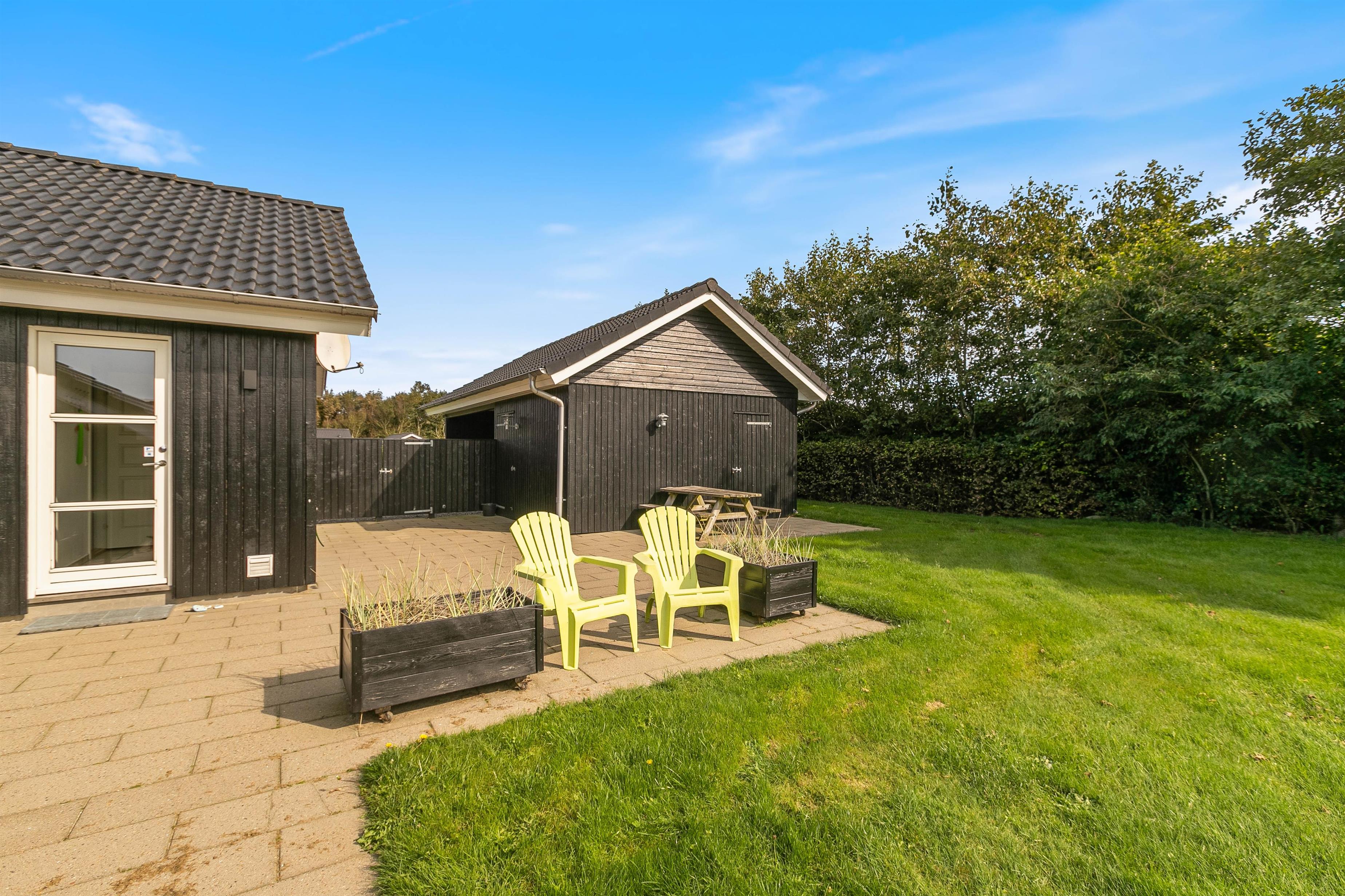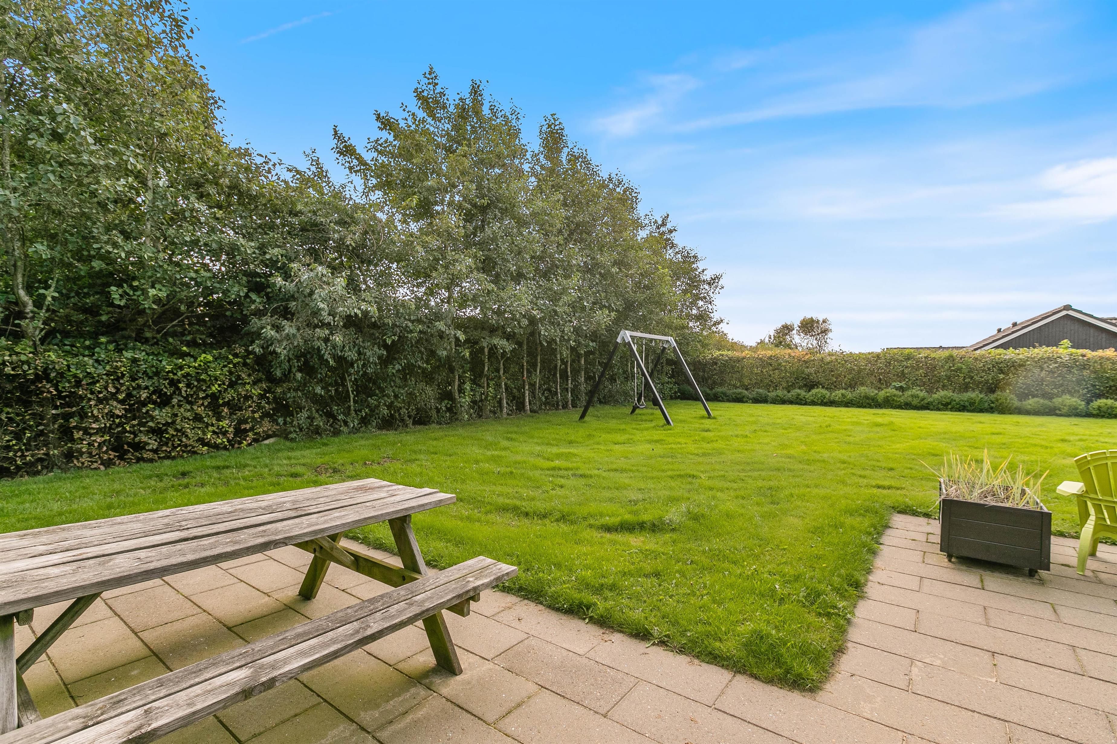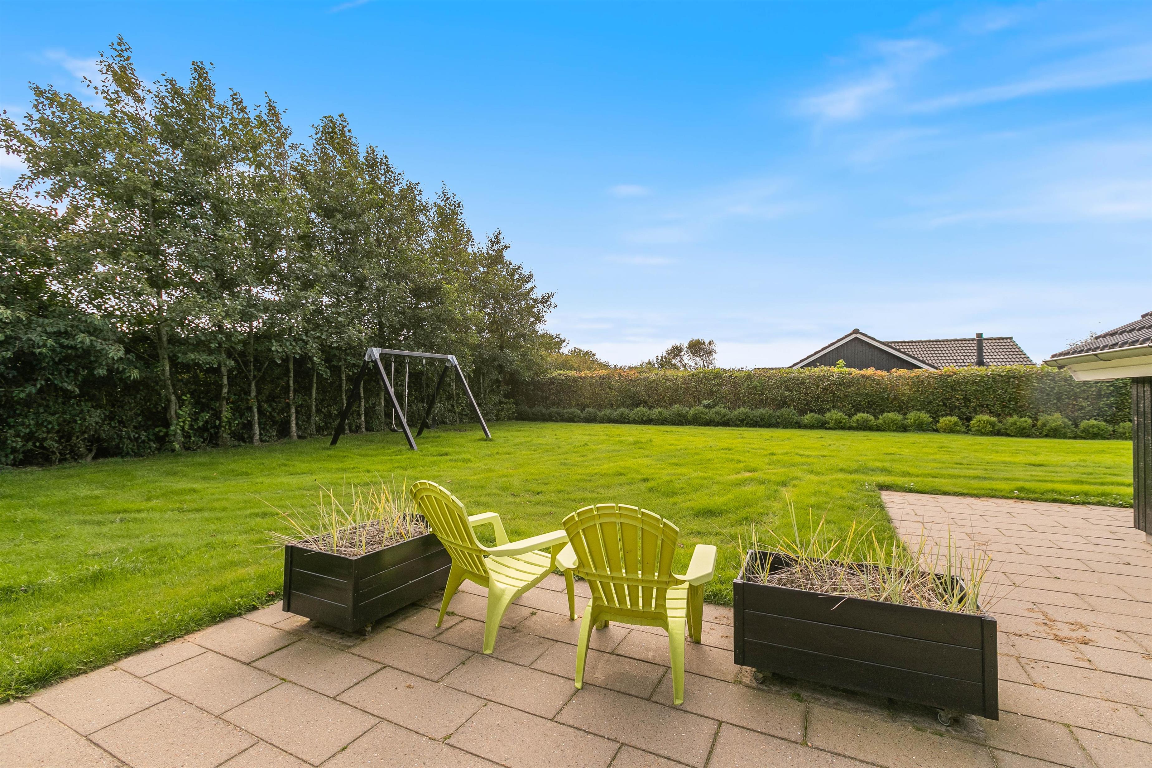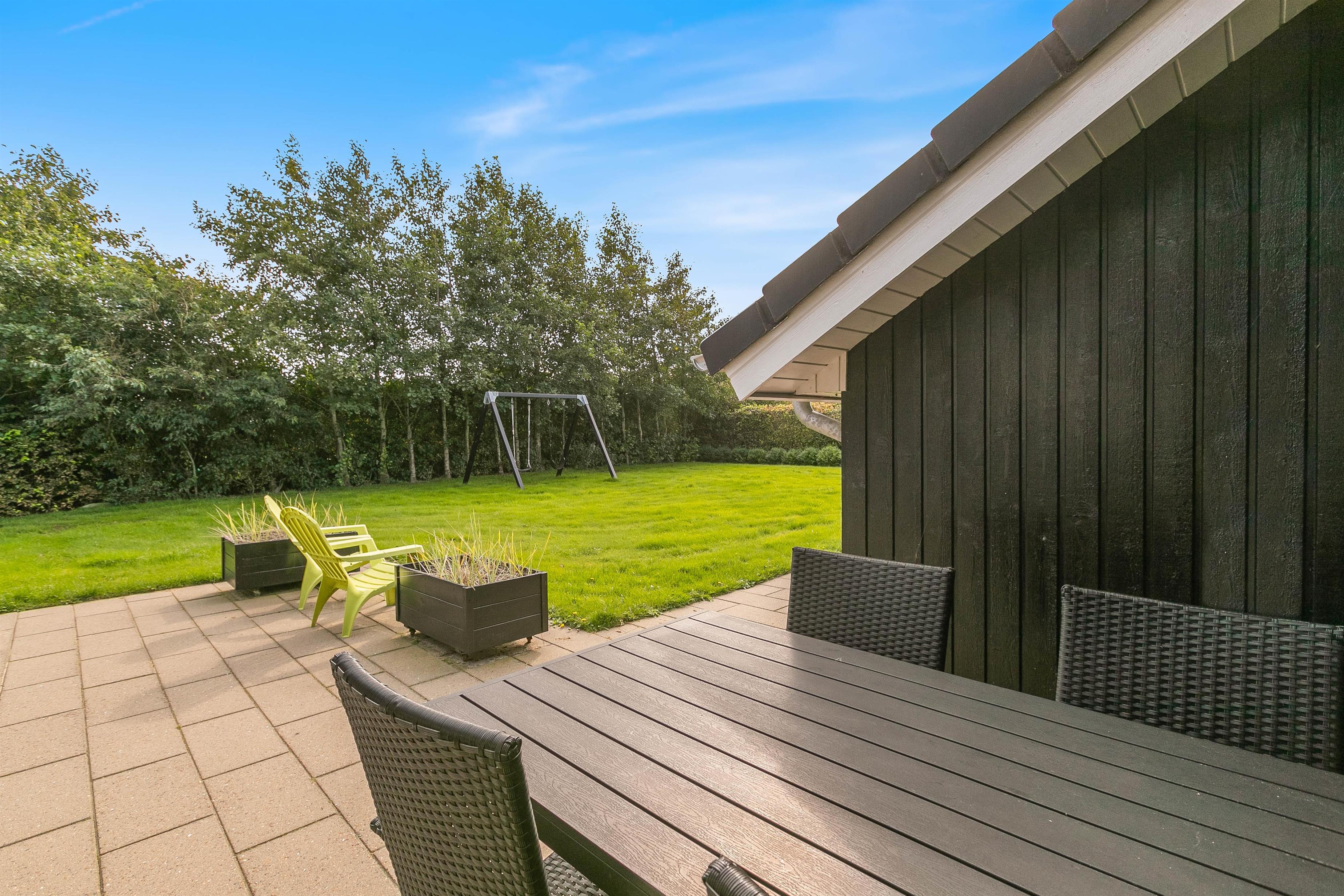 Har I brug for at sidde i læ og skygge, kan I flytte stolene ind under overdækningen eller finde parasollen frem. Her er også tænkt på de mindste med gynger samt den store græsplæne, hvor der er plads til leg. Mens der spilles kongespil eller bold på græsplænen, bliver der tilberedt lækker aftensmad på grillen – dét er ægte hygge!