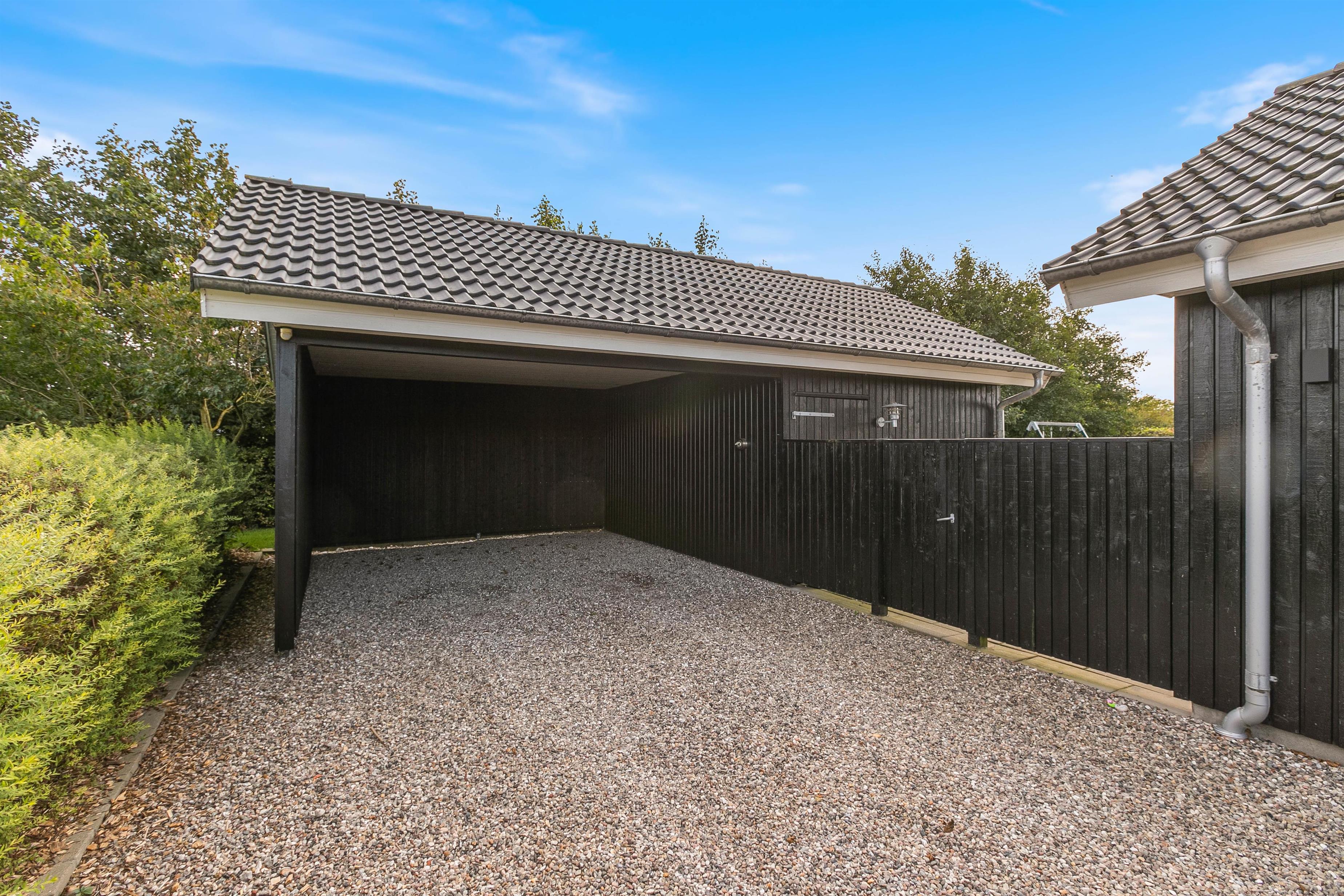 Når I har parkeret bilen i carporten, vil I blive mødt at et klassisk sortmalet træsommerhus med sans for detaljerne.