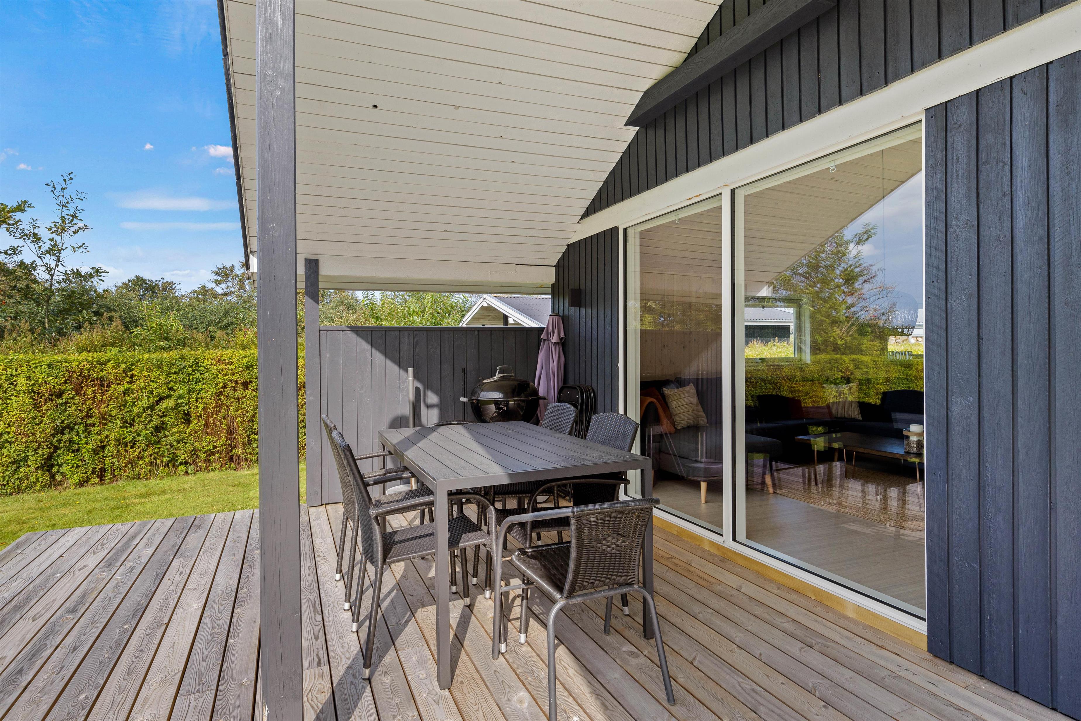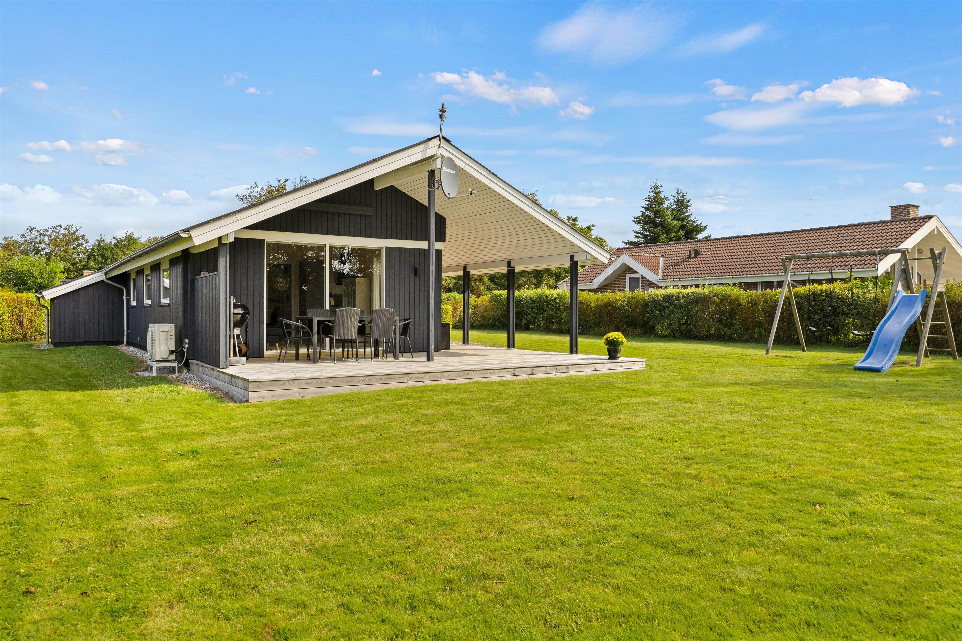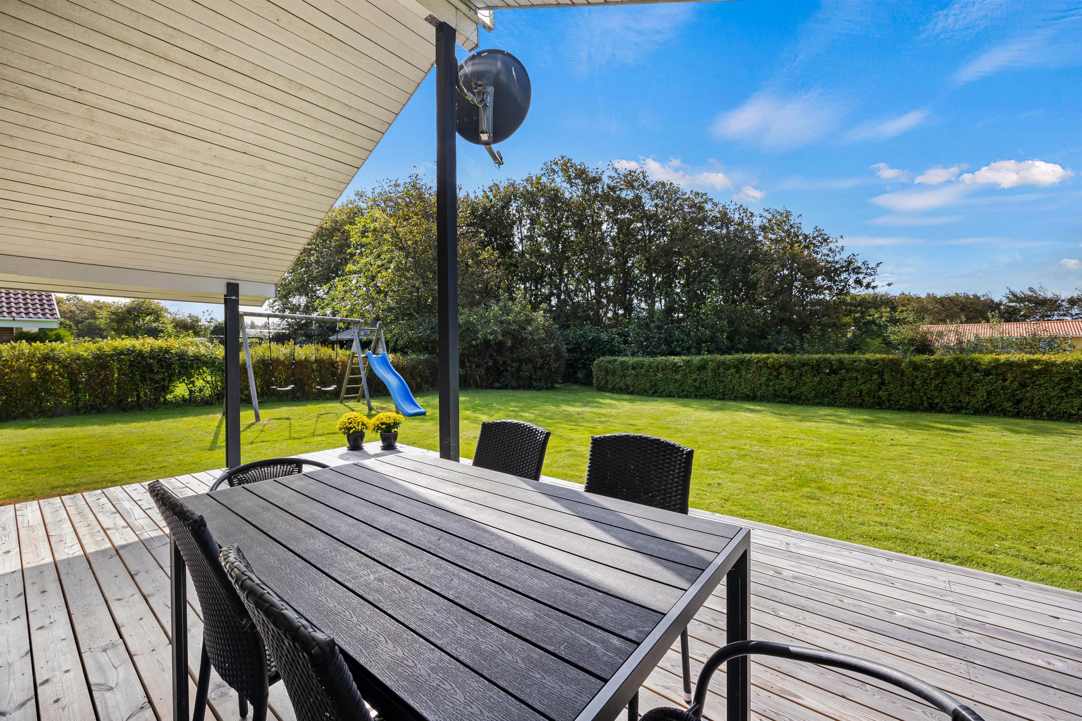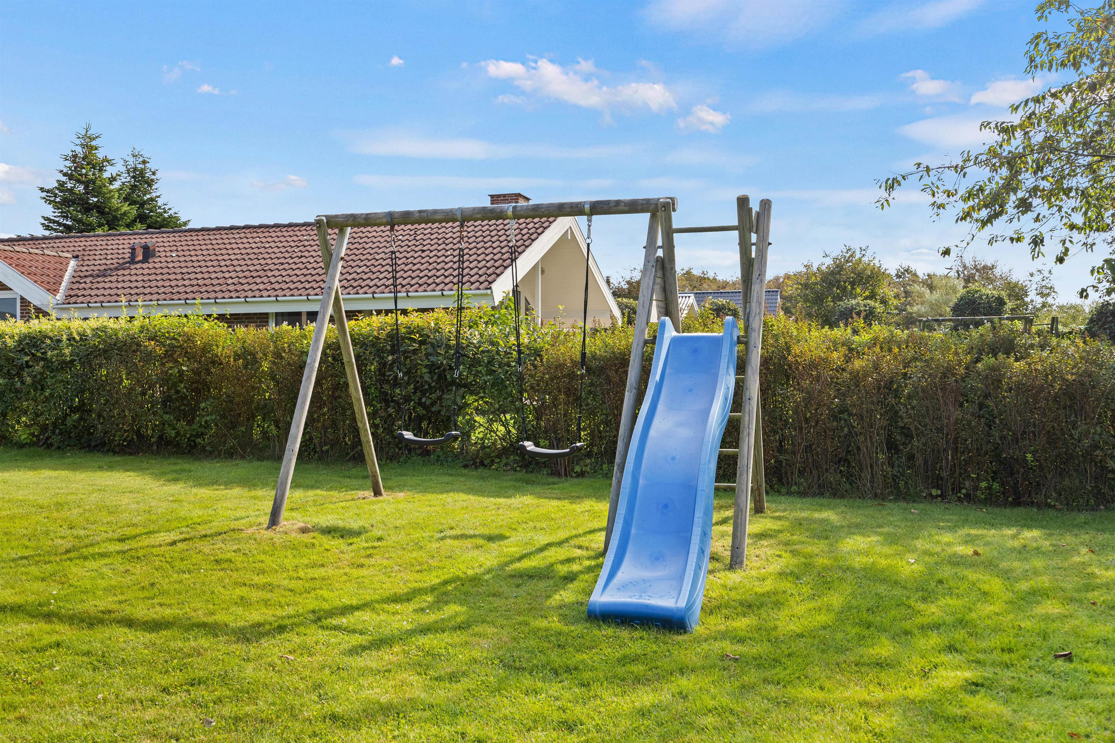 Udeområdet i sommerhuset er en sand oase for friluftsentusiaster og små eventyrere. Med en rummelig grund på 710 m2 er der masser af plads til både leg og afslapning. Børnene vil elske at tilbringe tid på plænegrunden, hvor en gynge står klar til sjove stunder og høje sving. For dem, der elsker at nyde mad under åben himmel, er der både en grill og komfortable havemøbler til rådighed.