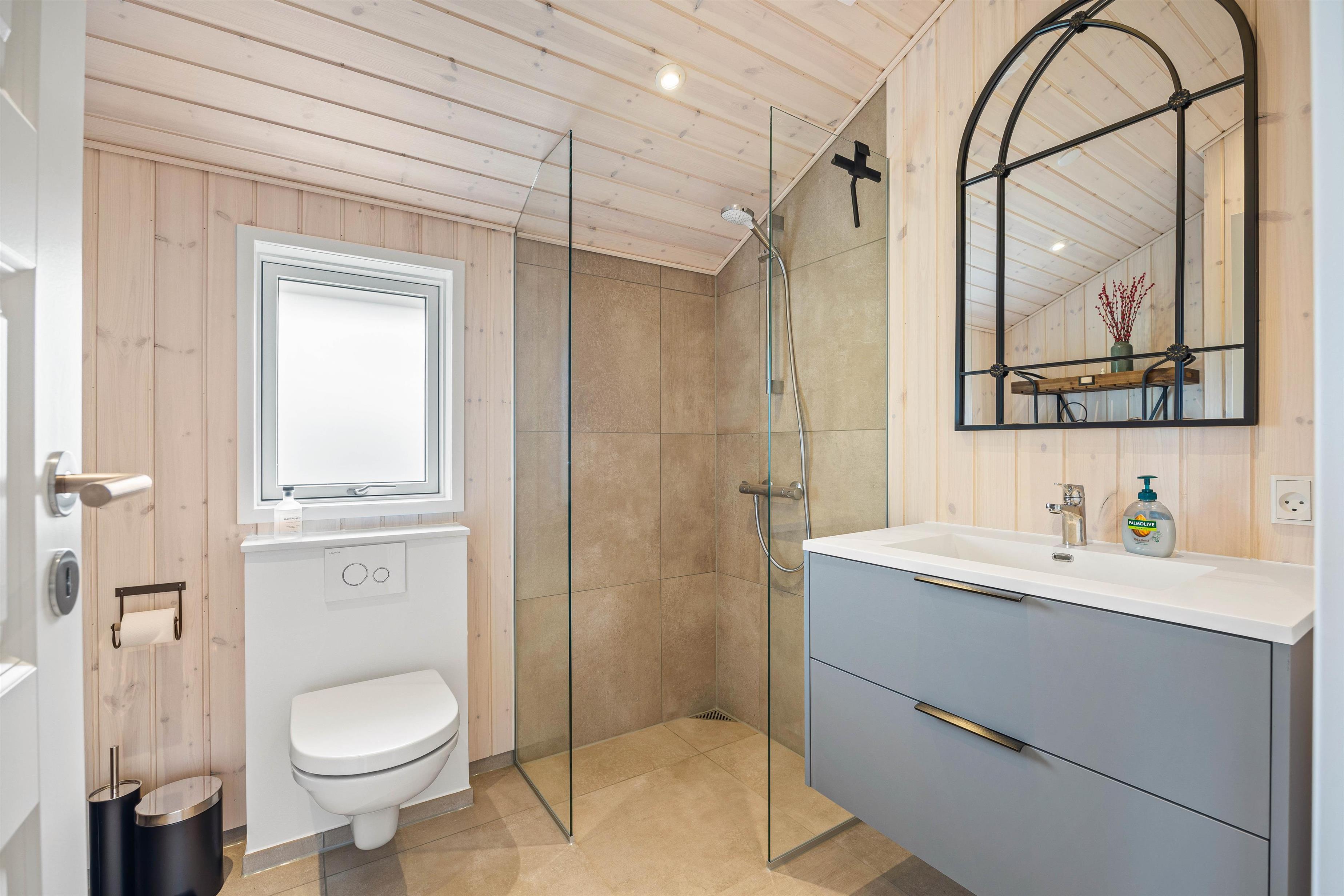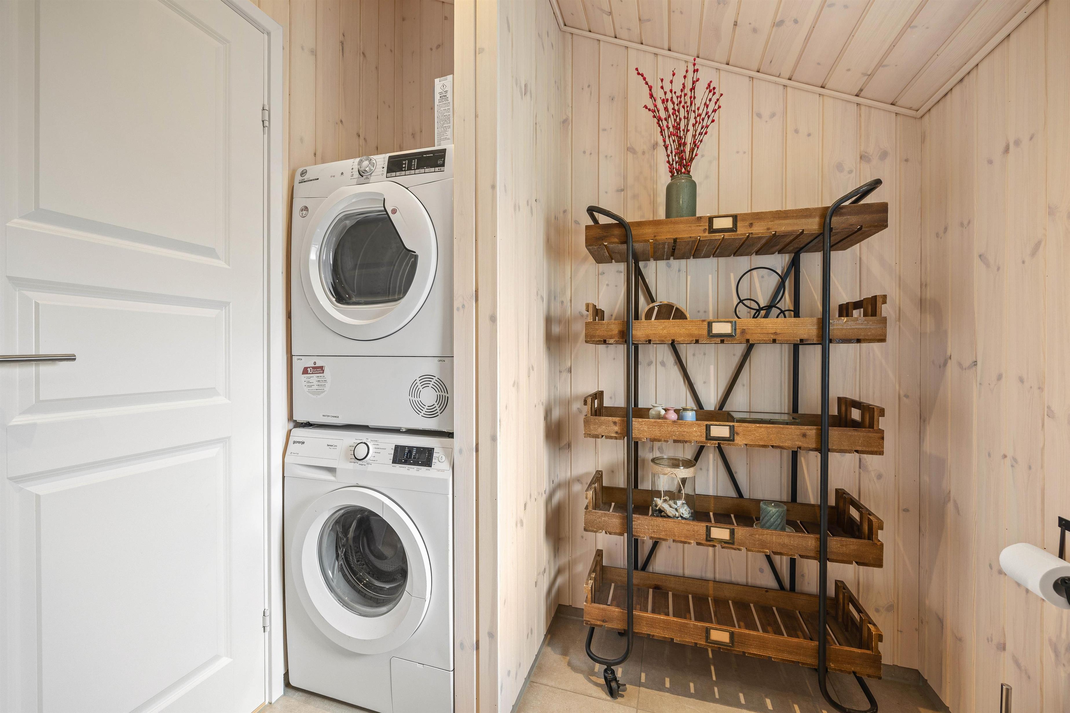 Badeværelset er en oase af komfort med sin gulvvarme, der sikrer varme fødder selv på kolde dage. Derudover er sommerhuset praktisk udstyret med både vaskemaskine og tørretumbler, så I nemt kan vaske og tørre tøj efter en dag ved havet eller i naturen.