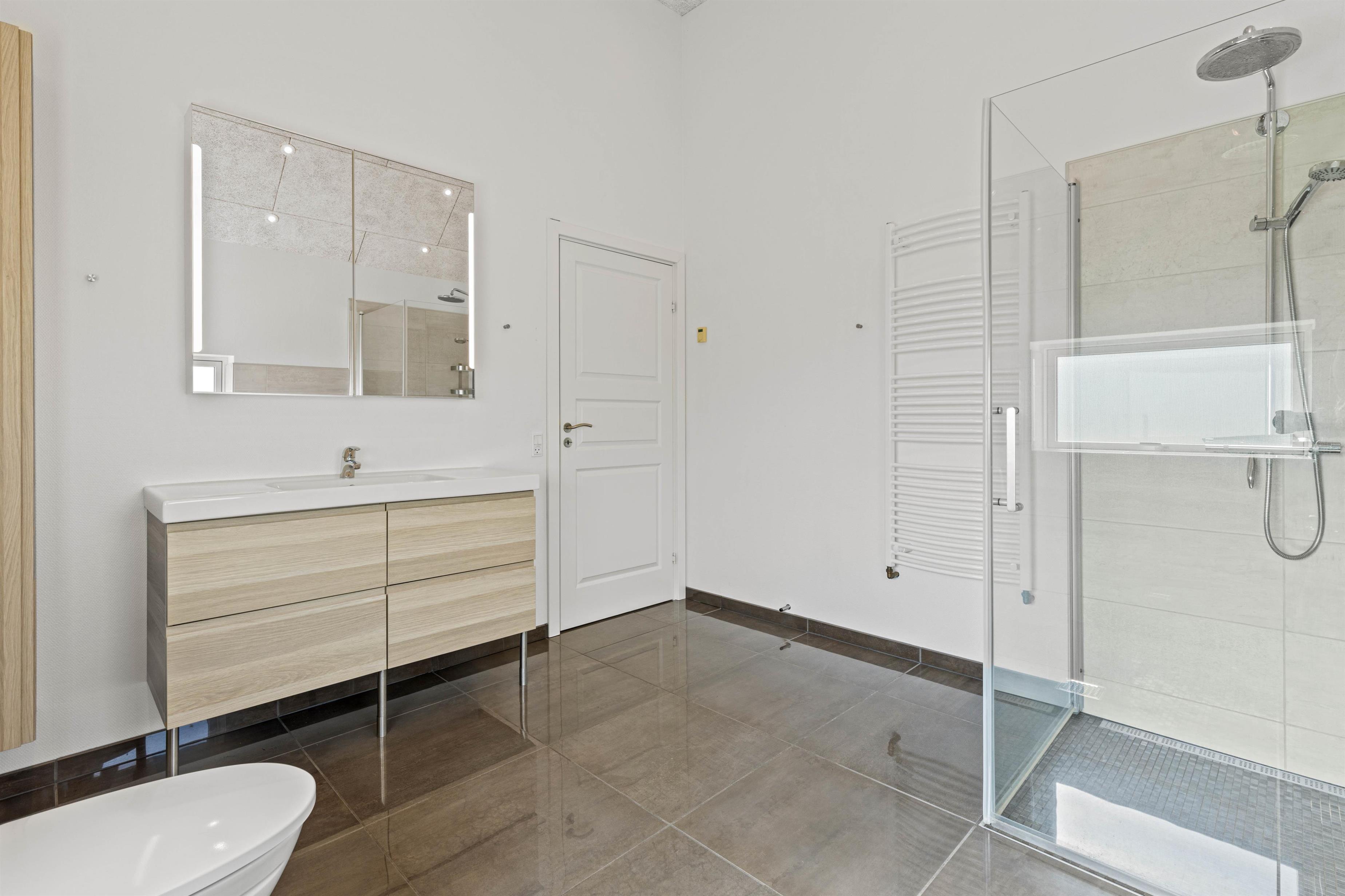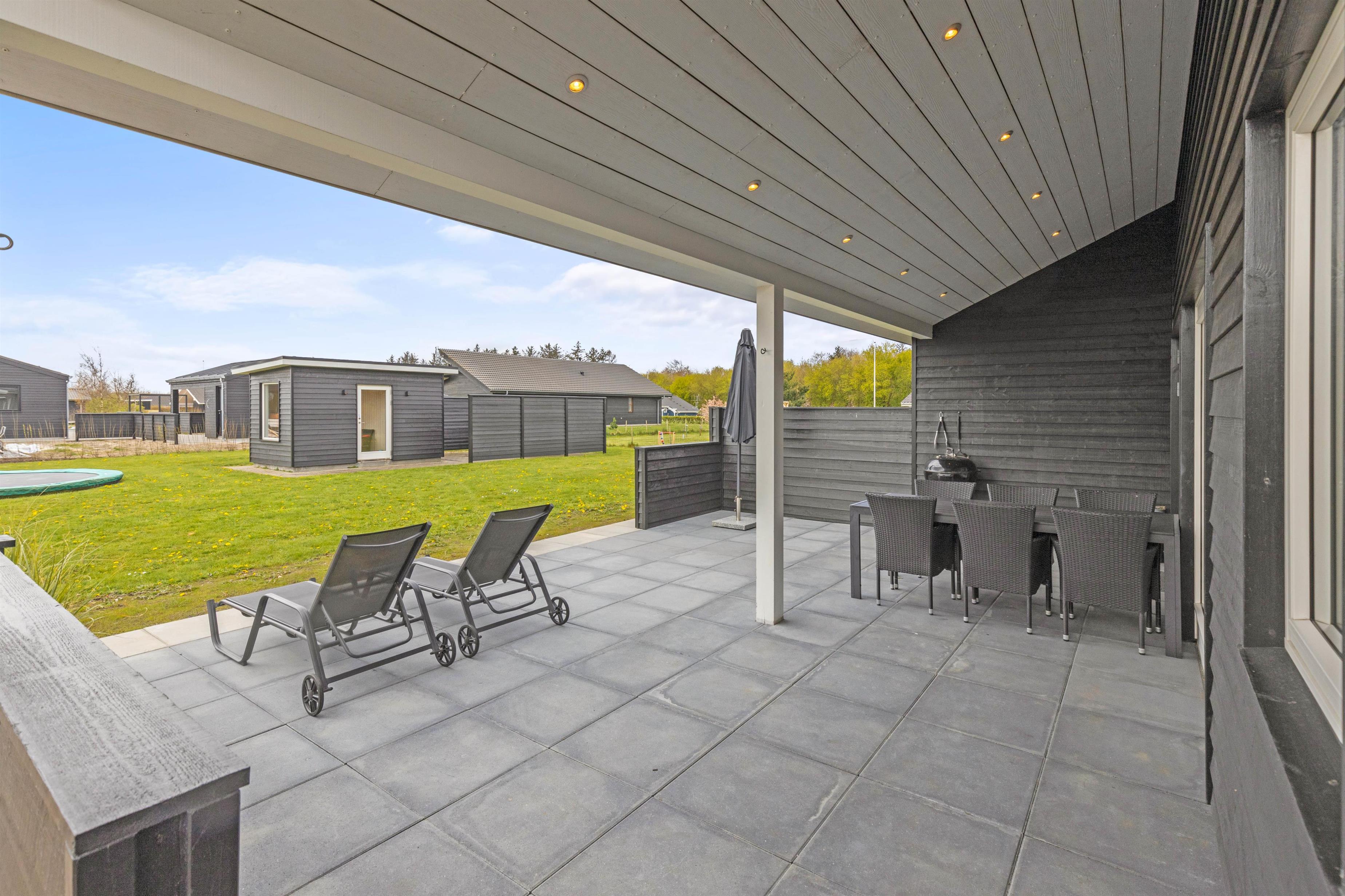 Fra køkkenalrummet kan I træde ud på den overdækkede terrasse, hvilket gør det muligt at nyde jeres måltider i alt slags vejr. Udsigten til den omkringliggende natur og lyden af fuglekvidder skaber den perfekte ramme for afslapning og gode samtaler. Højdepunktet udendørs er helt sikkert den afskærmede terrasse, hvor I både finder en behagelig spa, udebruser og sauna. Udebruseren kan benyttes fra april til november, hvilket giver jer mulighed for at nyde de forfriskende faciliteter i lang tid af året.