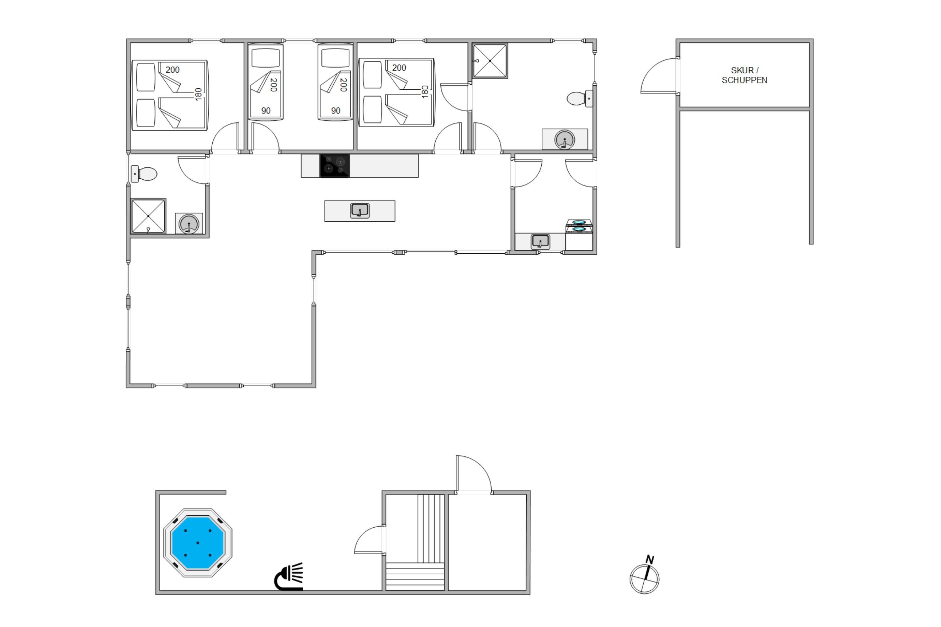 Sommerhuset rummer 3 dejlige soverum; 2 af dem er udstyret med dobbeltsenge og 1 med 2 enkeltsenge, som skaber den perfekte ramme for en afslappende nats søvn. De 2 badeværelser har gulvvarme – ligesom resten af sommerhuset – hvilket sikrer, at alle kan starte dagen friske og veltilpasse. Der er også opvaskemaskine, vaskemaskine og tørretumbler, så I nemt kan klare de praktiske gøremål i løbet af ferien.