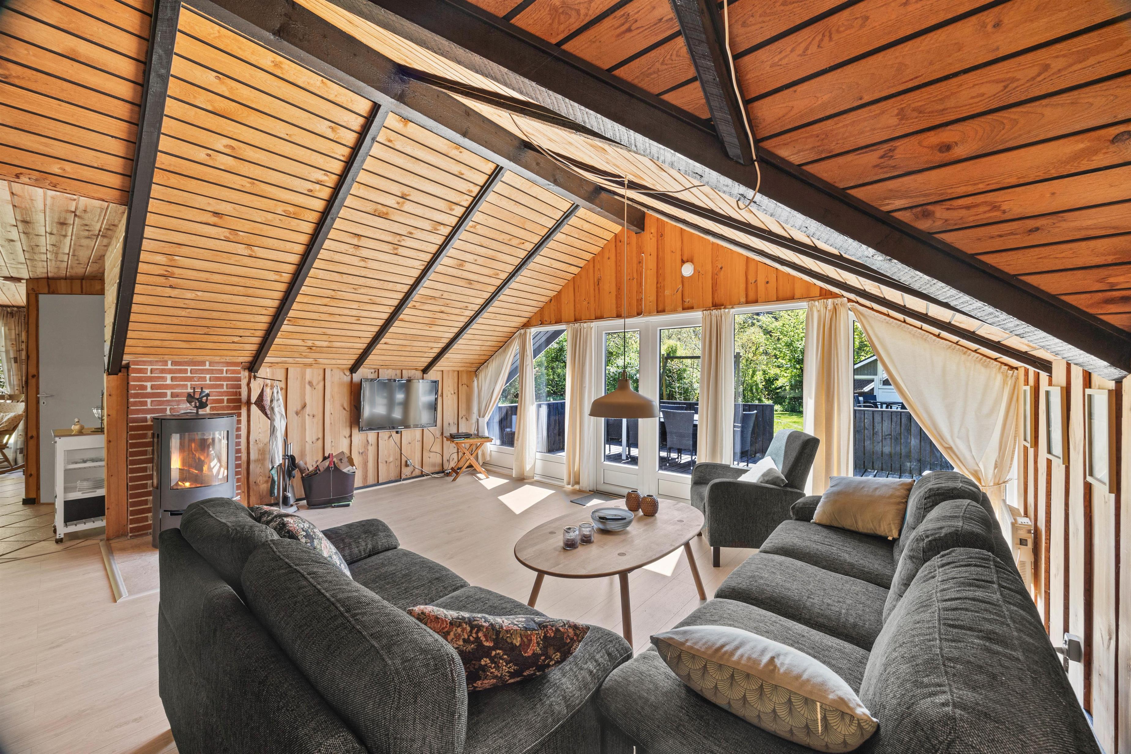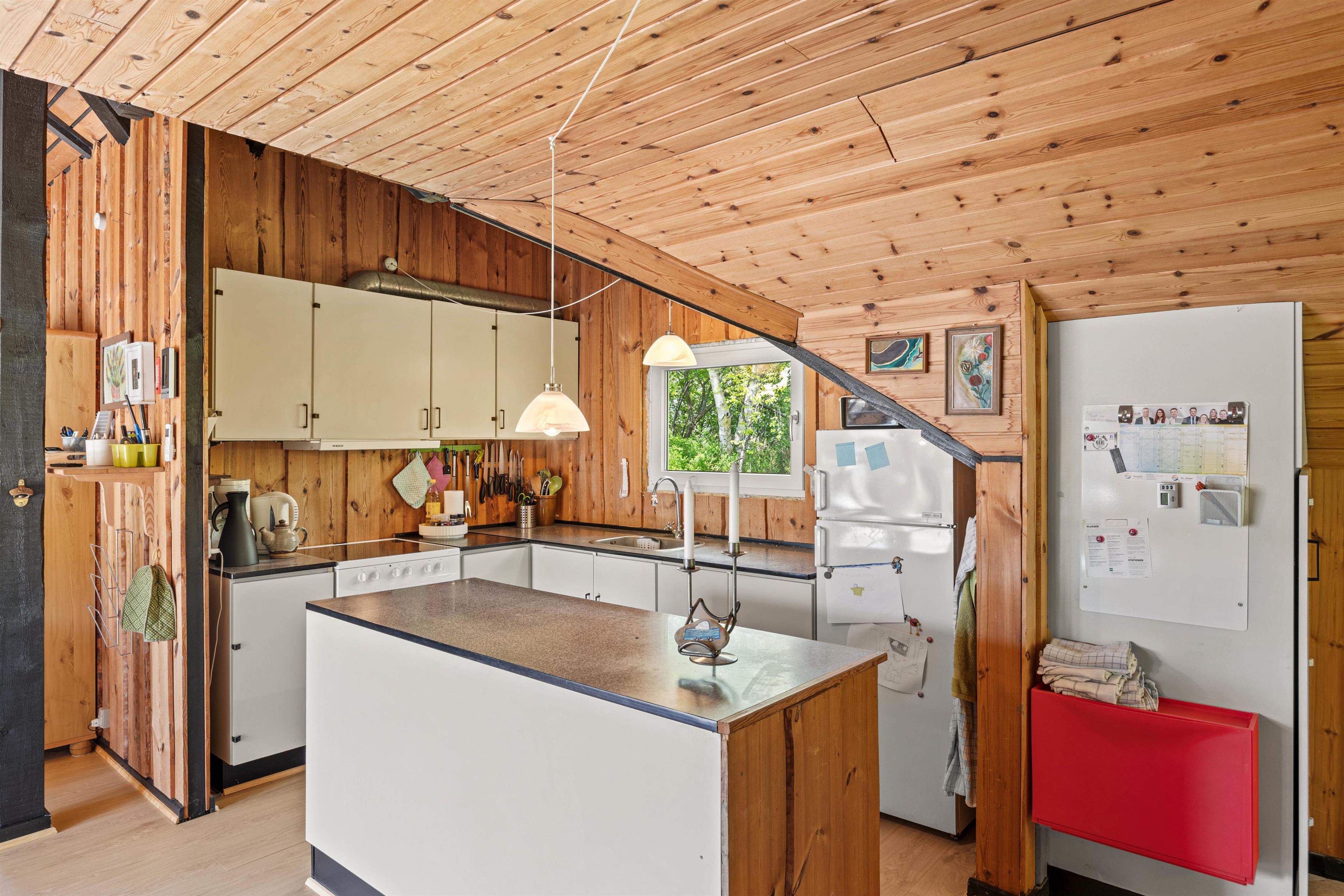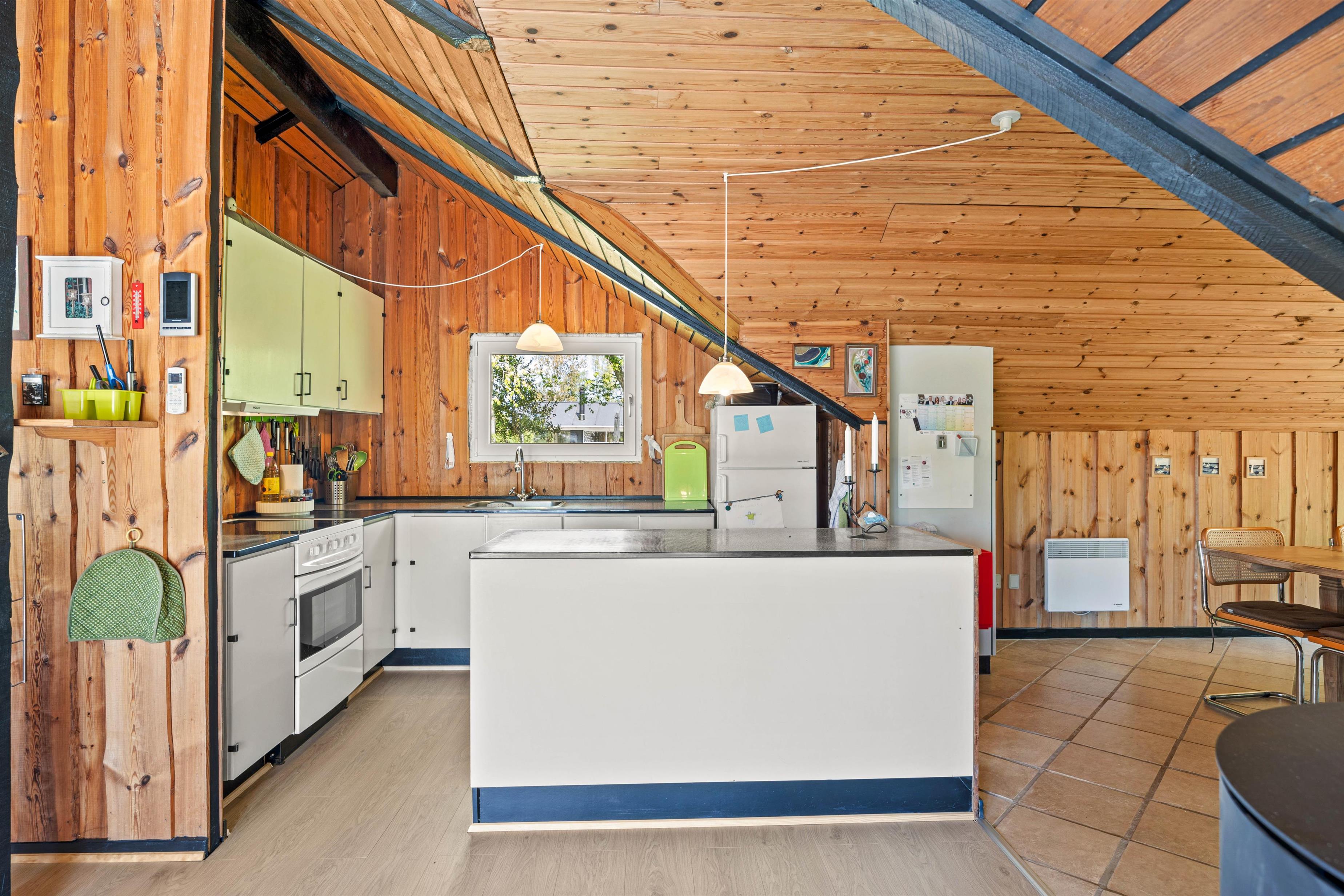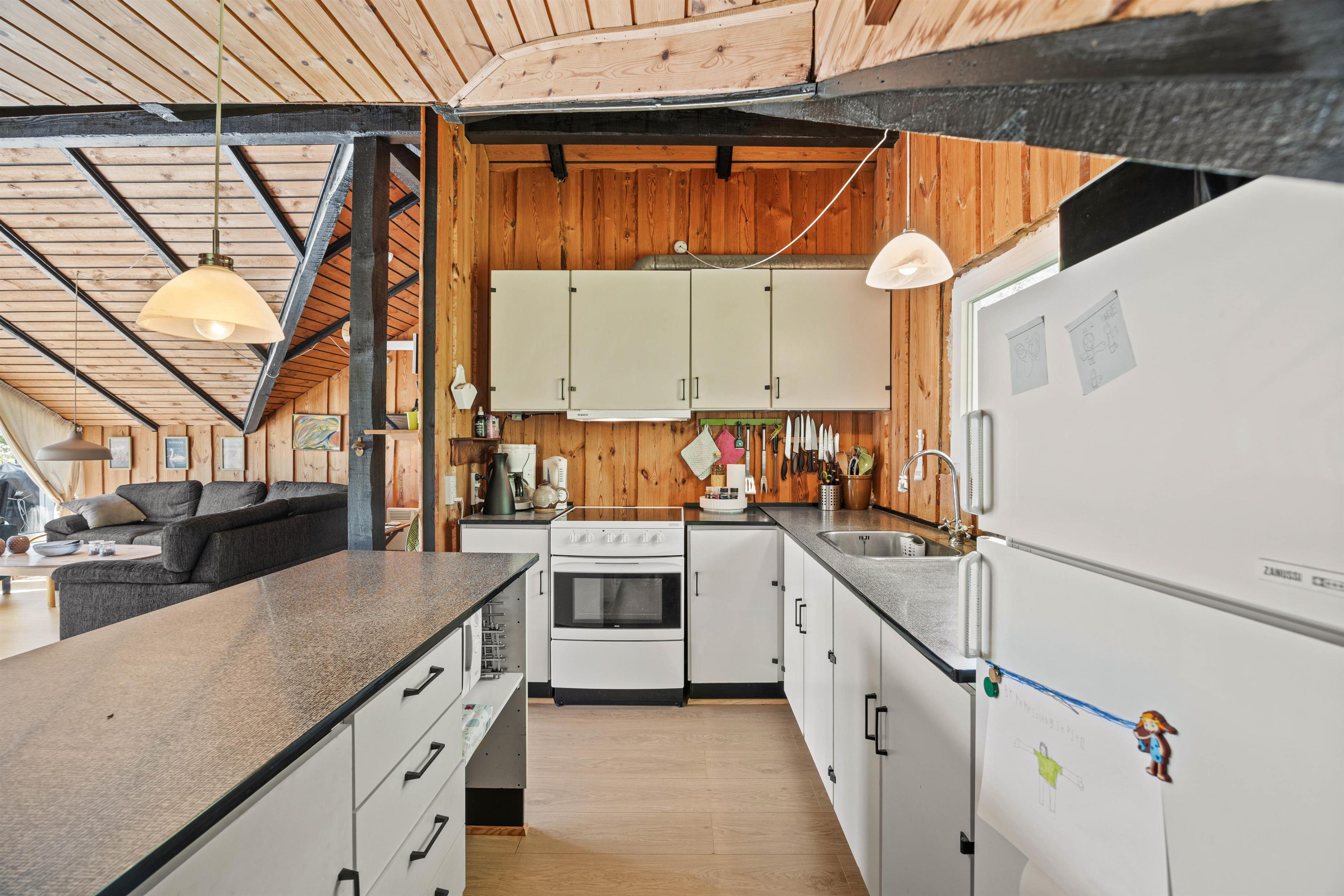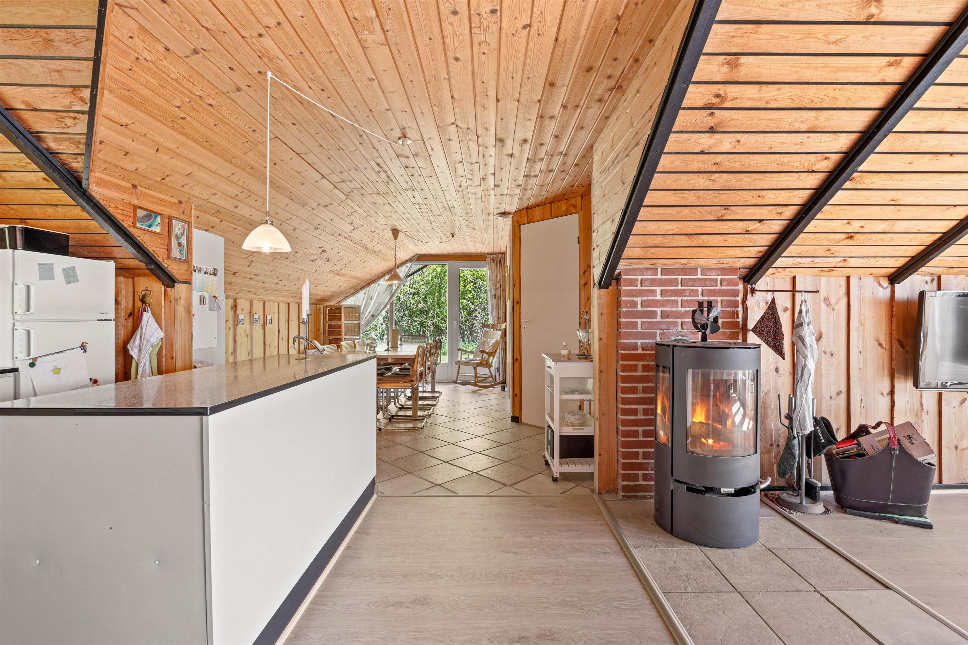 Træder I videre ind i sommerhuset finder I det charmerende køkken der ligger op til gode samtaler og lækker madlavning. Når oprydningen melder sig, kan I rolig putte det i opvaskemaskinen uden at forstyre ferie følelsen. En vaskemaskine står også til rådighed, hvilket gør det nemt at holde garderoben frisk, selv under længere ophold. Når aftenen falder på, kan I samles omkring brændeovnen, der skaber en varm og hyggelig atmosfære, perfekt til en afslappet aften med brætspil eller en god bog.