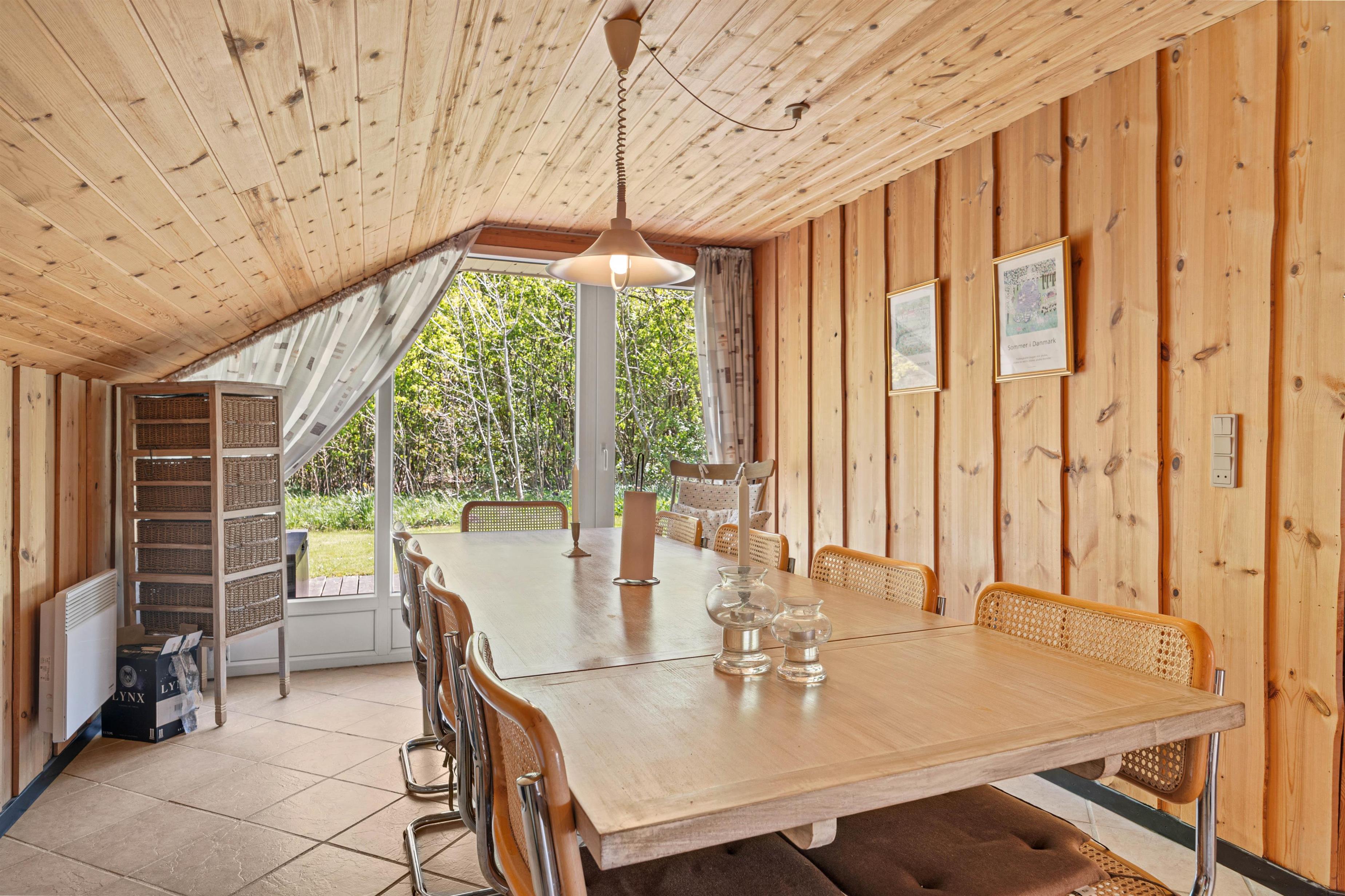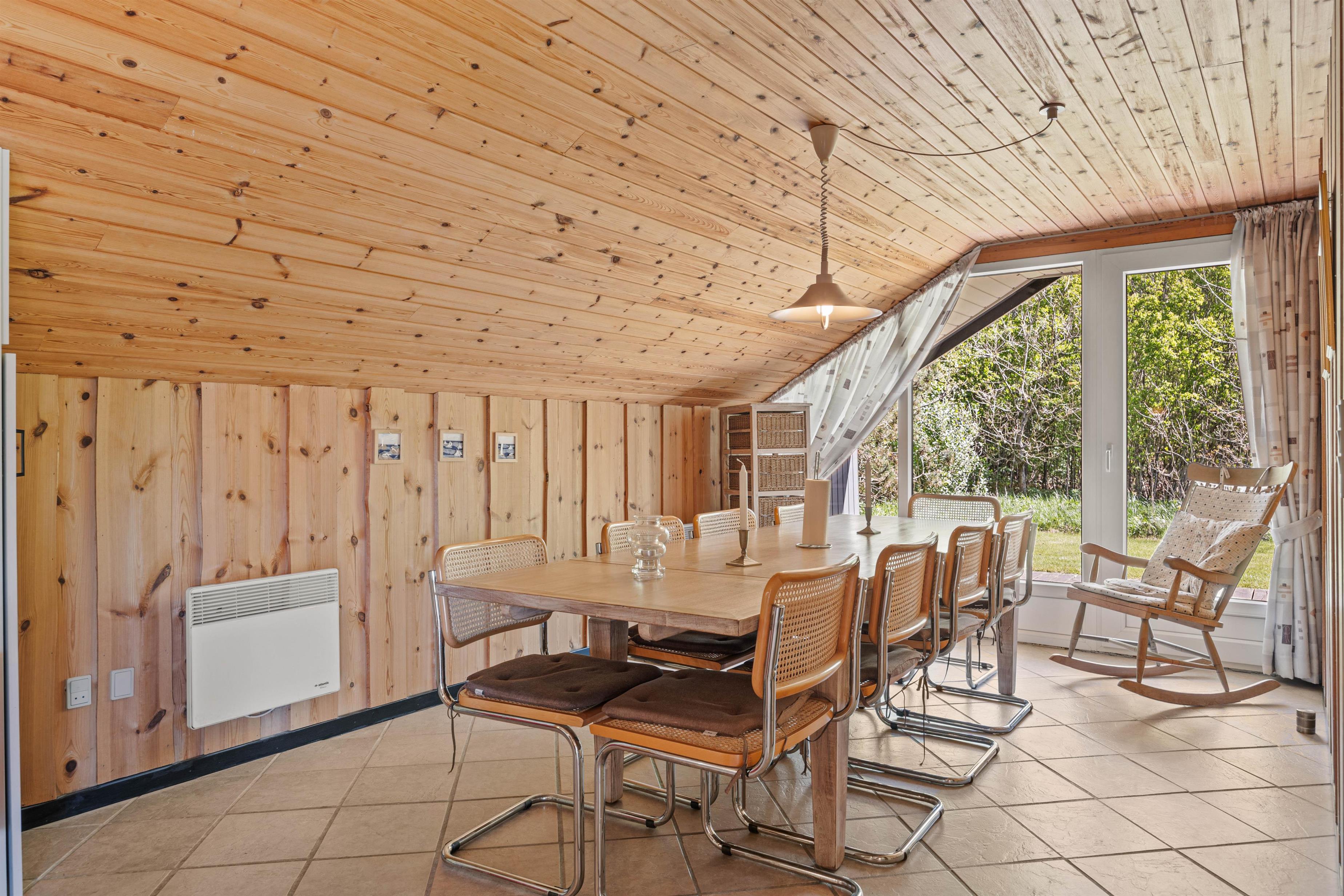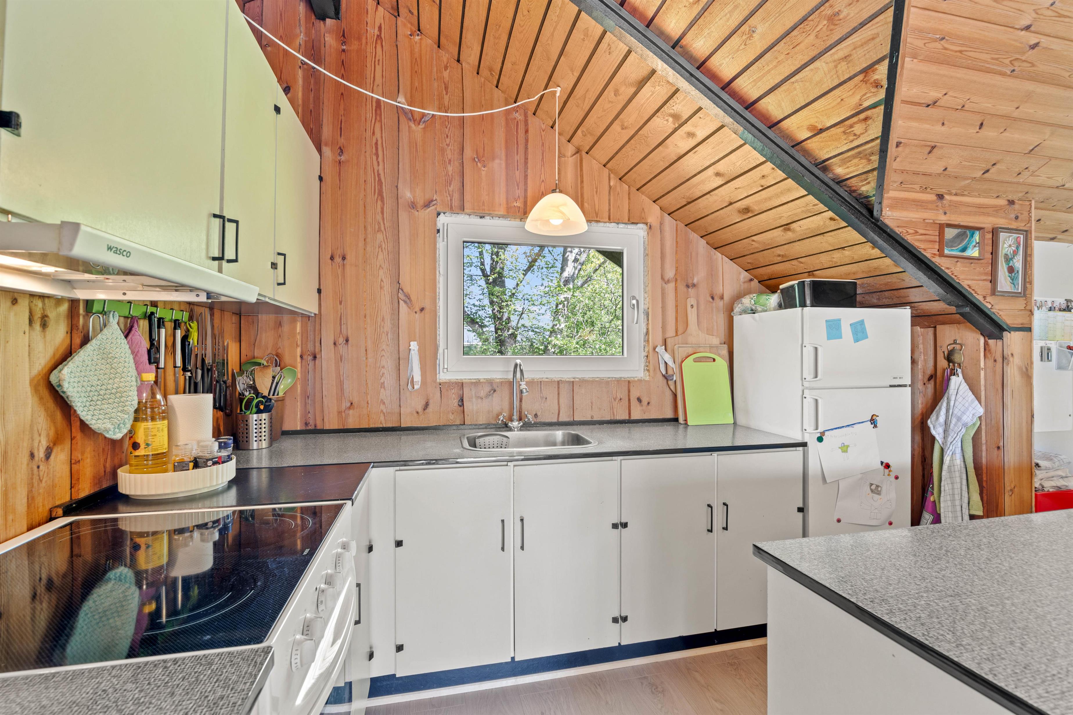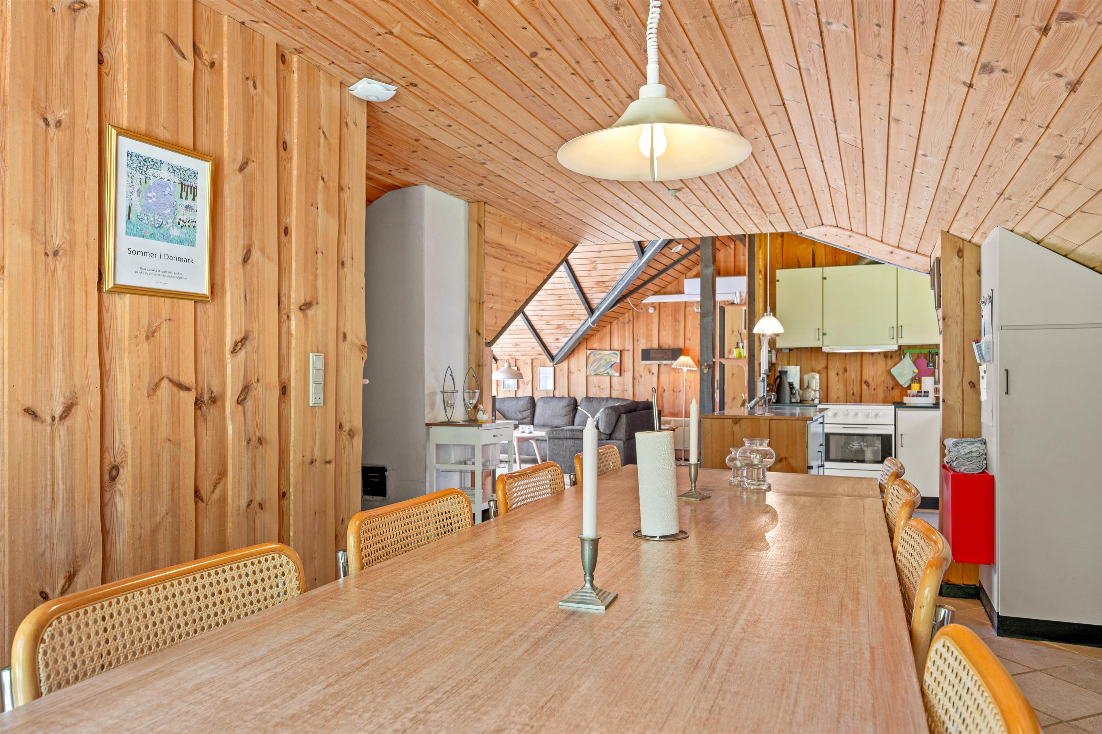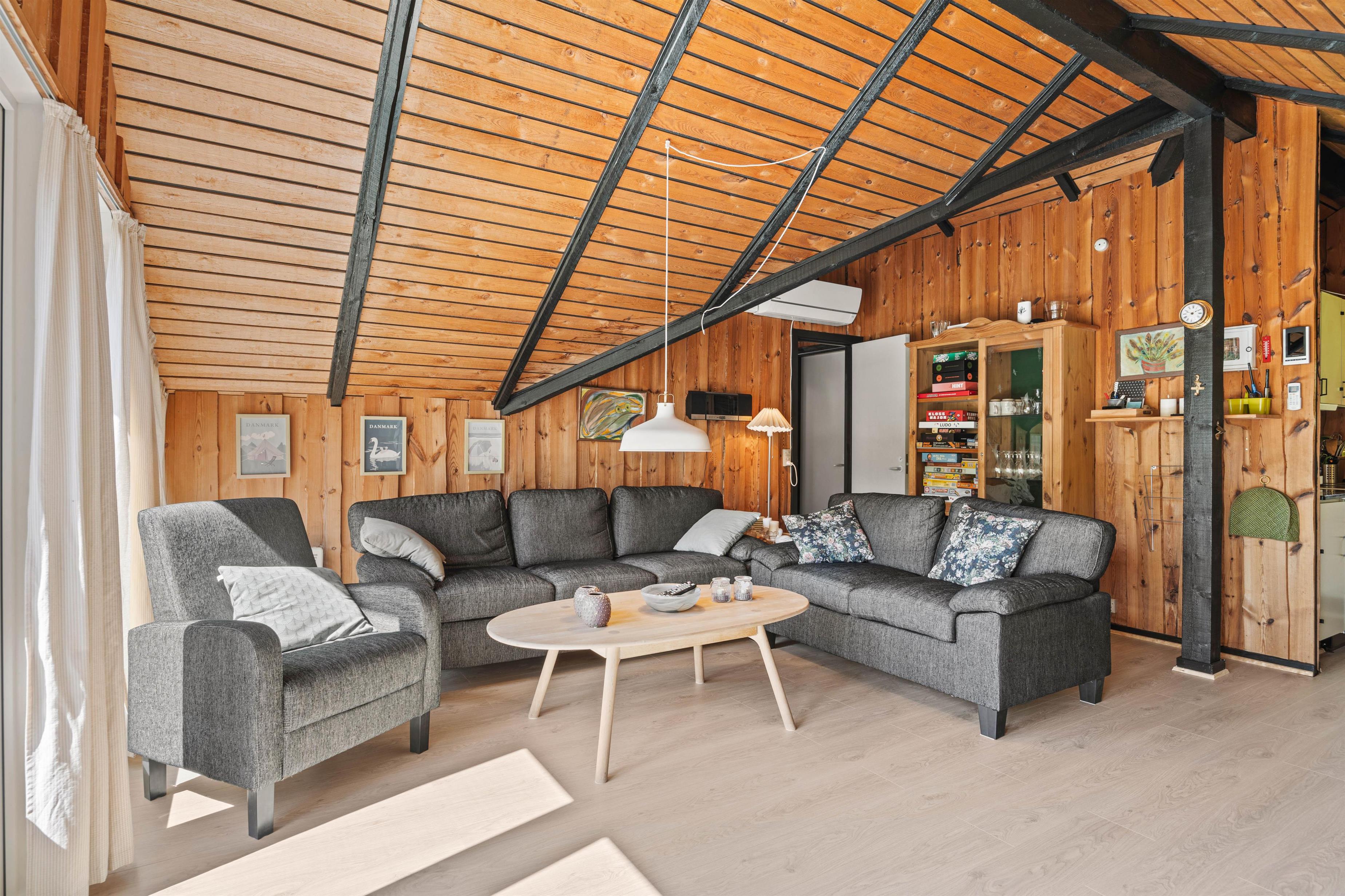 Træder I videre ind i sommerhuset finder I det charmerende køkken der ligger op til gode samtaler og lækker madlavning. Når oprydningen melder sig, kan I rolig putte det i opvaskemaskinen uden at forstyre ferie følelsen. En vaskemaskine står også til rådighed, hvilket gør det nemt at holde garderoben frisk, selv under længere ophold. Når aftenen falder på, kan I samles omkring brændeovnen, der skaber en varm og hyggelig atmosfære, perfekt til en afslappet aften med brætspil eller en god bog.