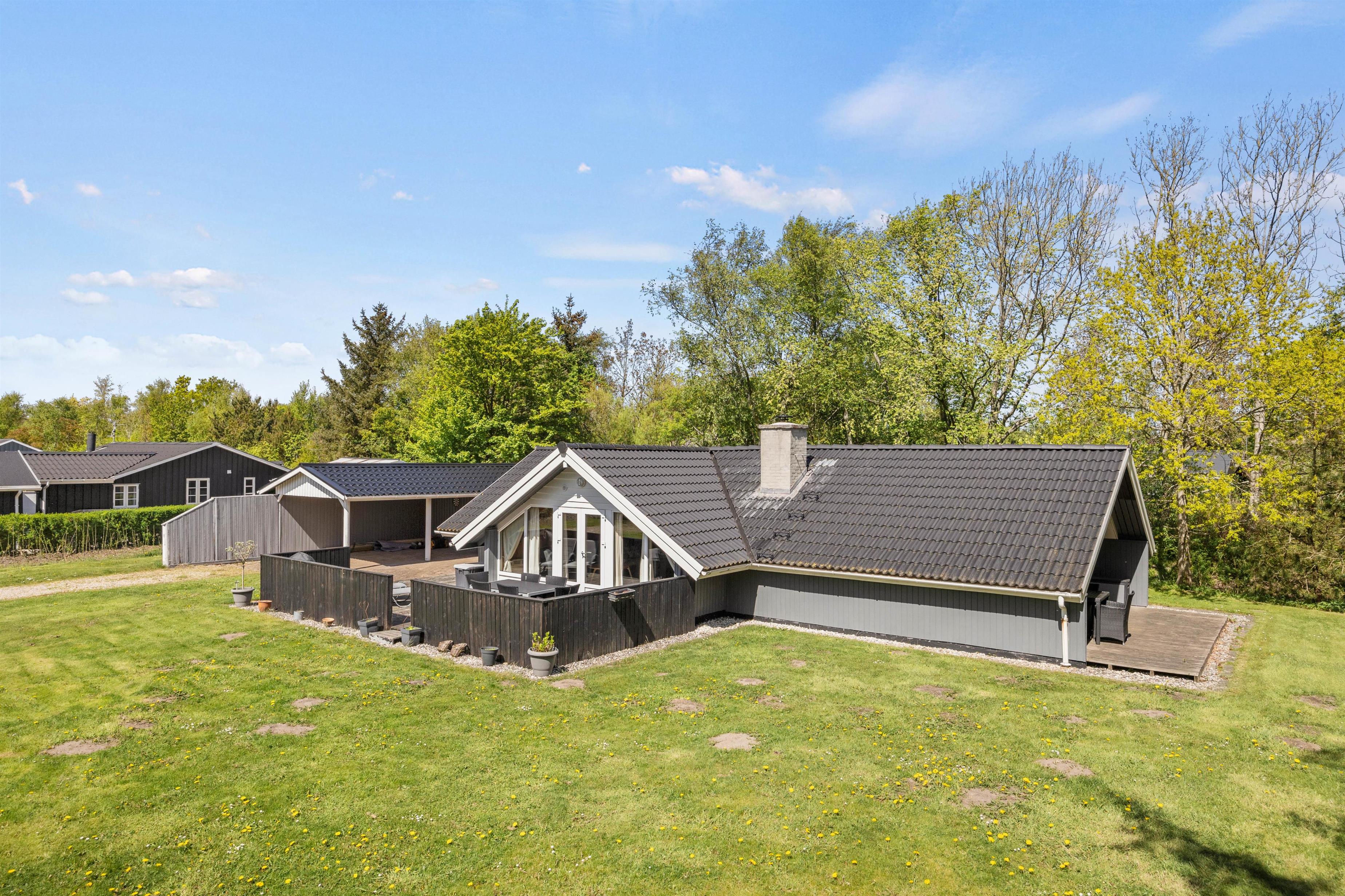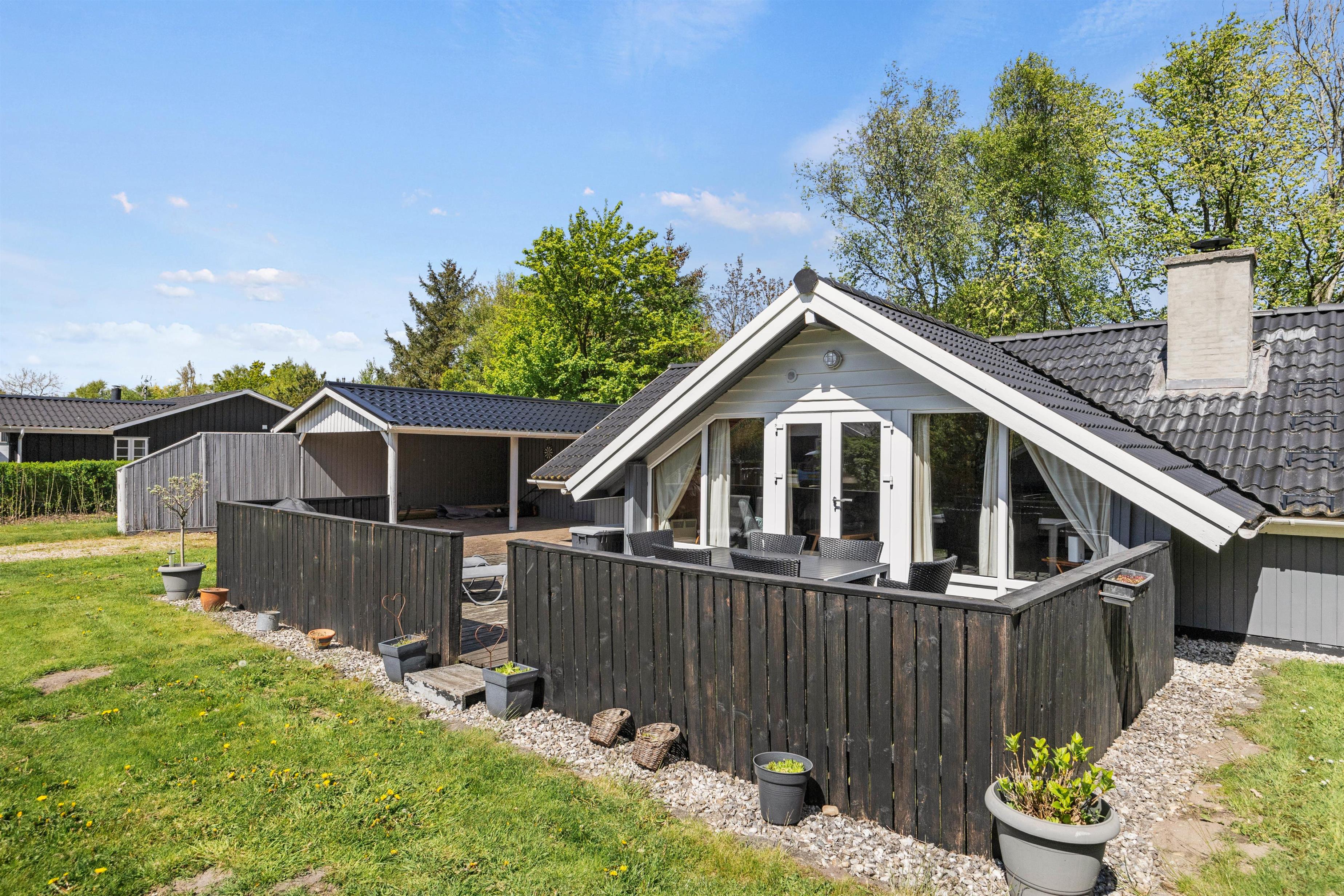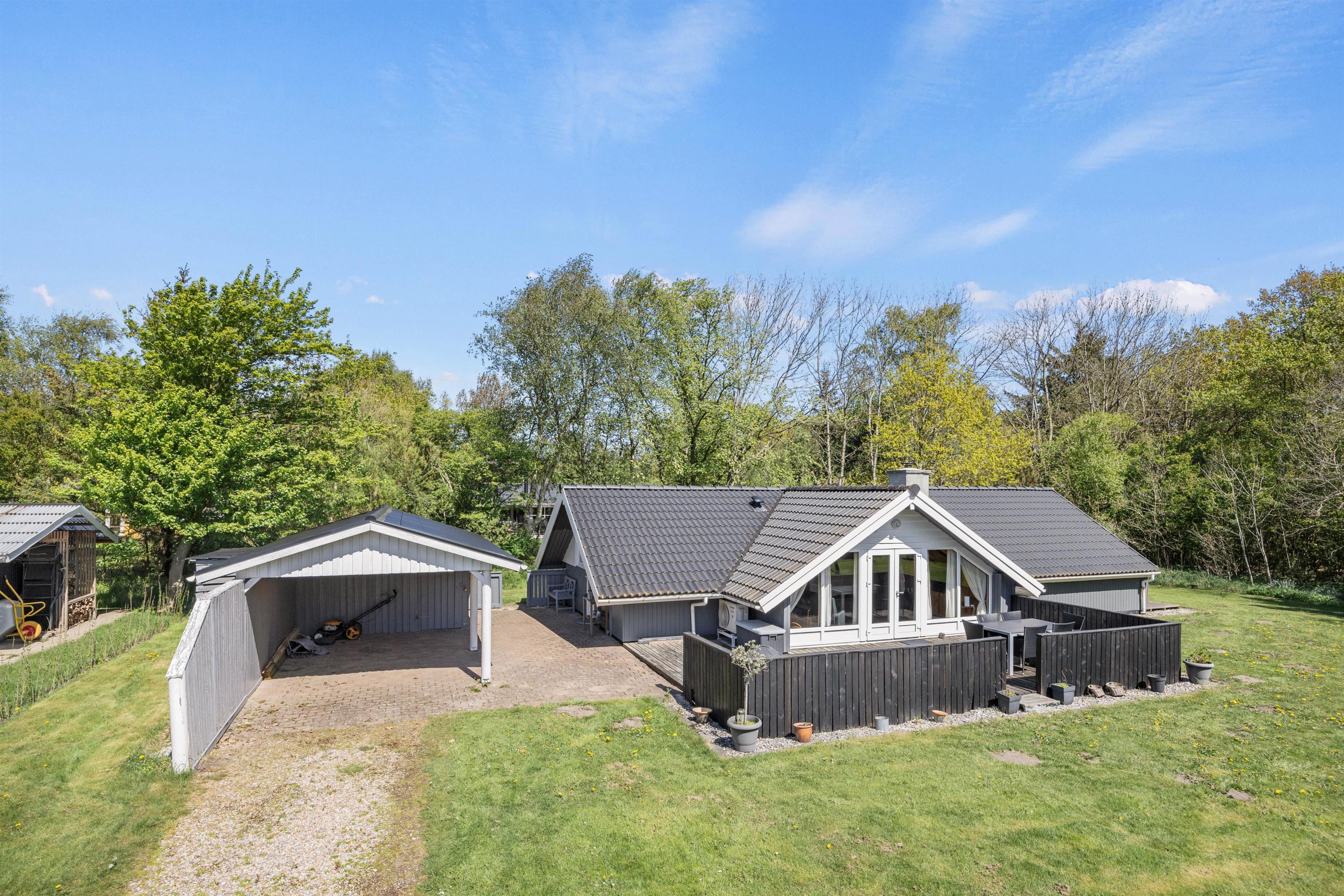 Den afskærmede og overdækkede terrasse giver mulighed for at nyde den friske luft i al slags vejr, og med en grill til rådighed kan I nemt tilberede lækre måltider under åben himmel. En carport sikrer, at bilen altid står godt beskyttet, og skulle behovet for opbevaring opstå, kan redskabsrummet nemt benyttes.