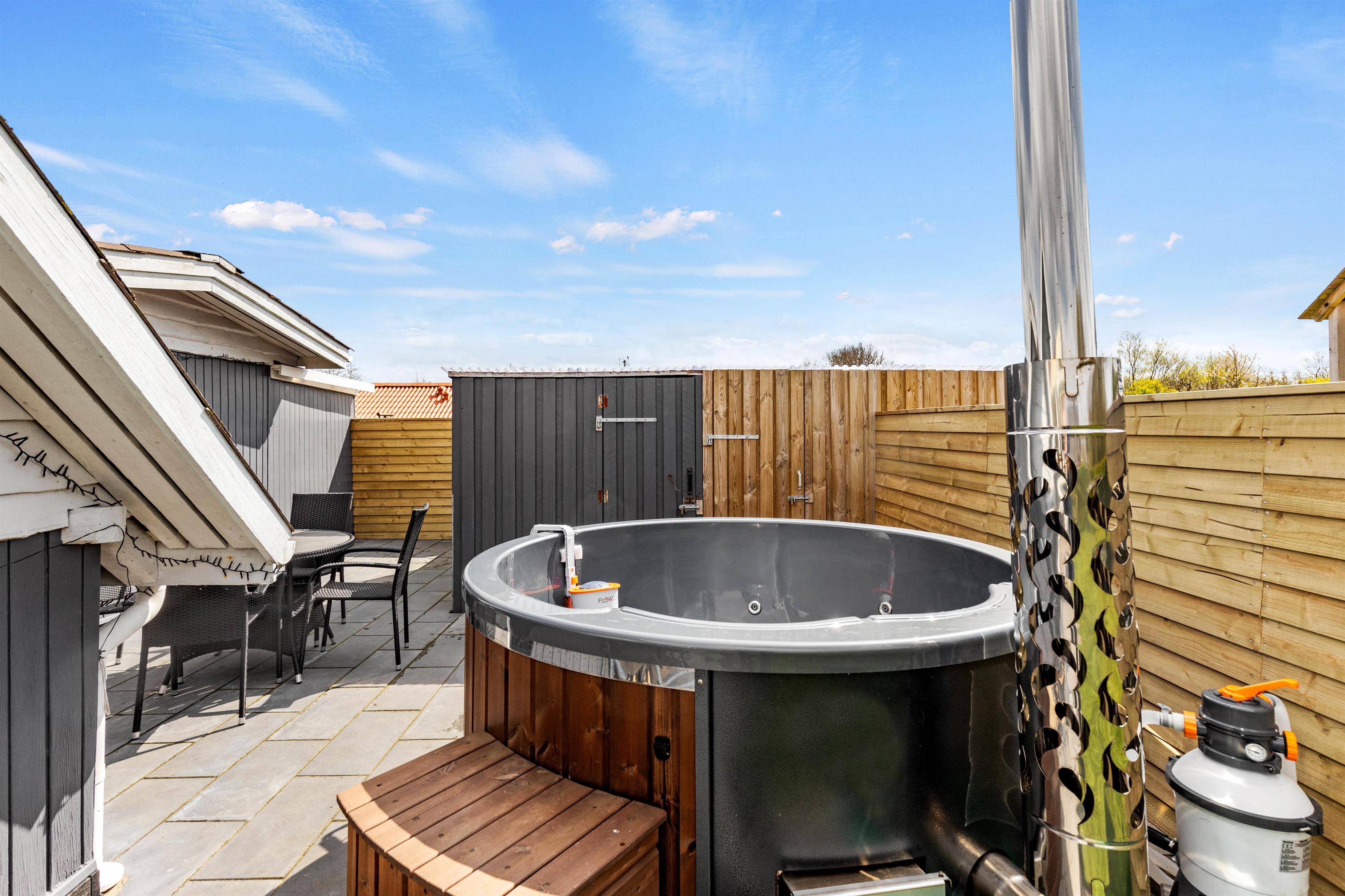 Delvist overdækket terrasse med vildmarksbad på indhegnet grund