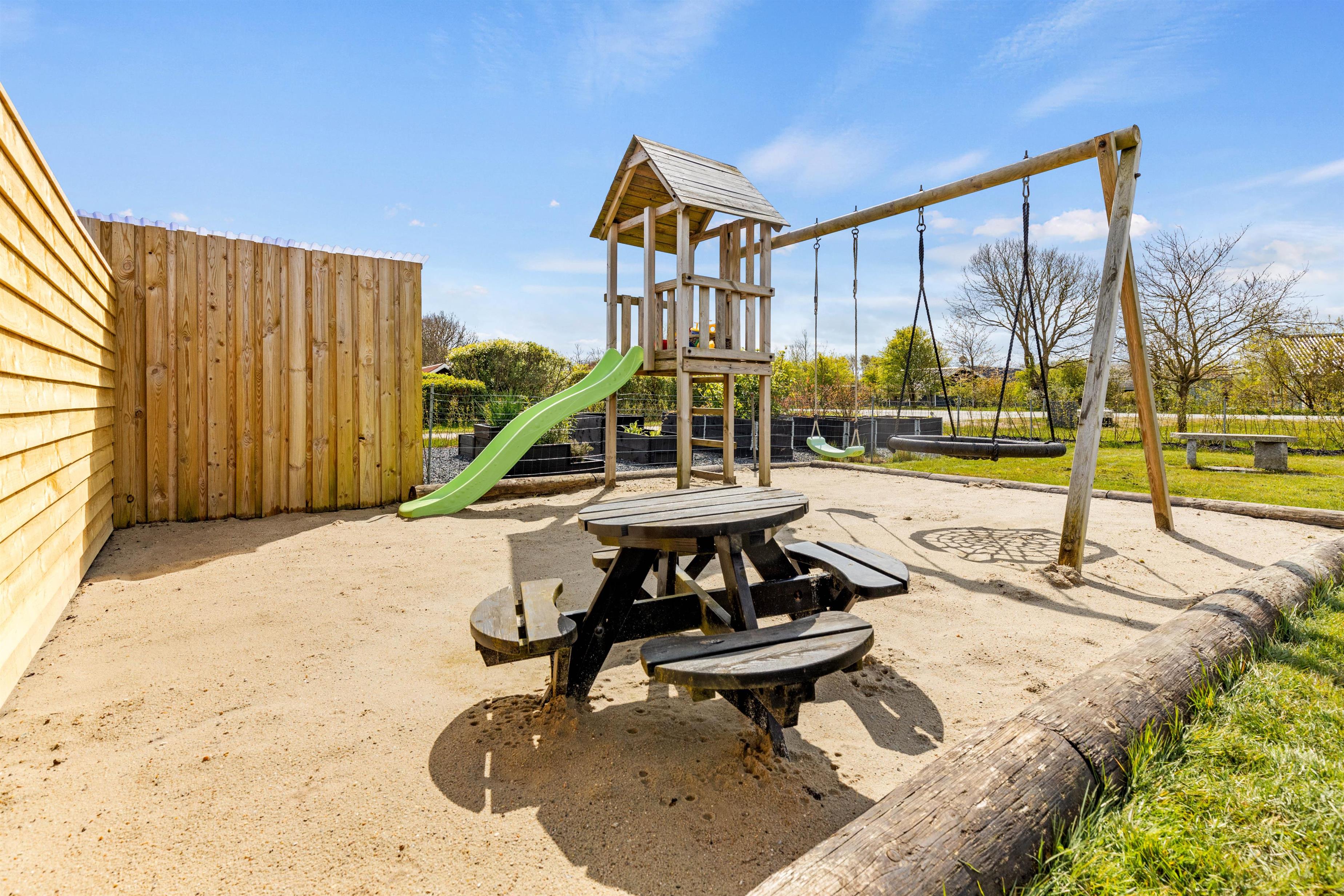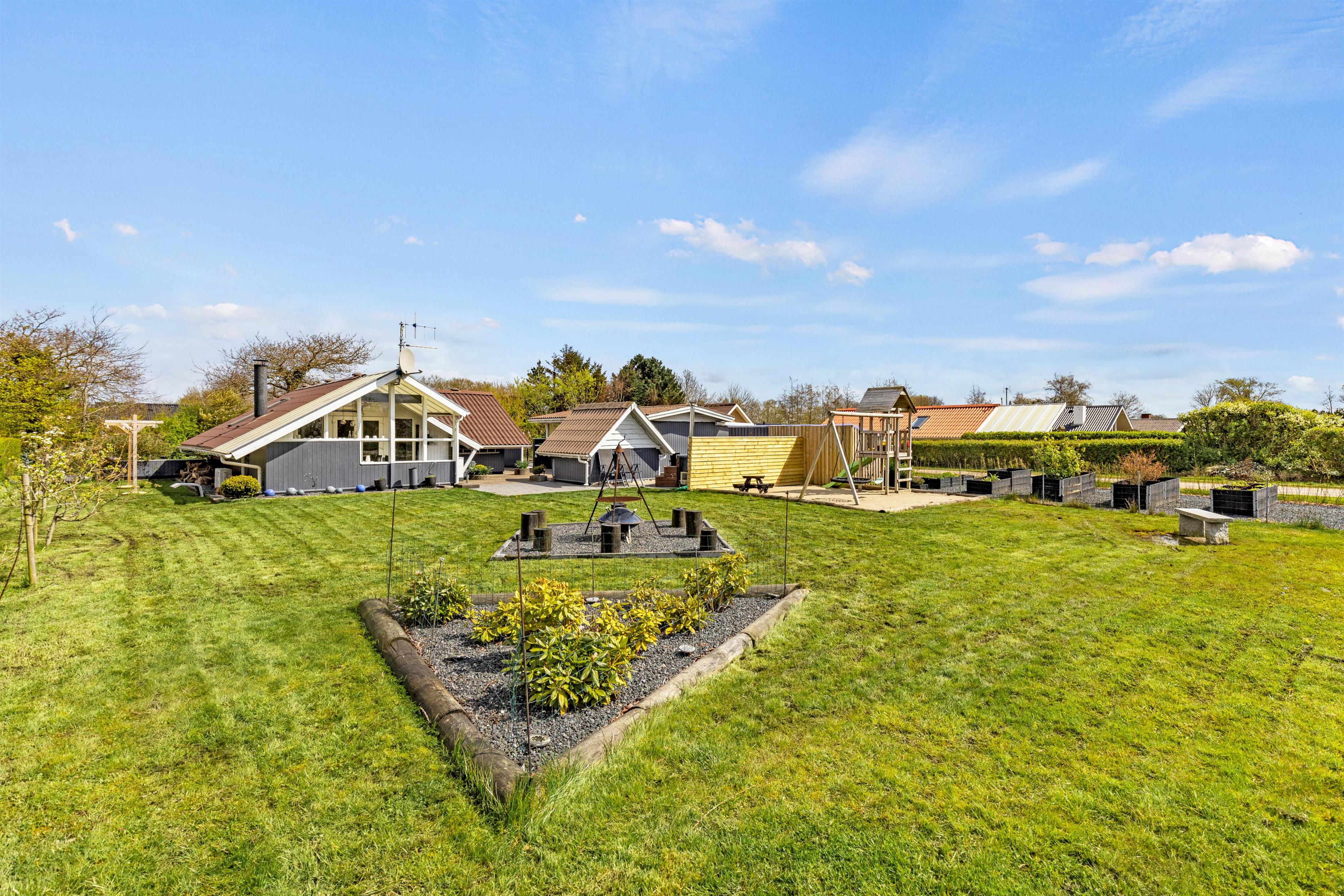 Sommerhuset byder også på et skønt udeområde med vildmarksbad på den delvist overdækkede terrasse, hvor I kan nyde noget koldt at drikke efter en skøn feriedag. Dertil er der en skøn have, hvor hele familien kan nyde sommerens solrige dage. I haven er der sandkasse og gynge til børnene, som de kan få glæde af på ferien.