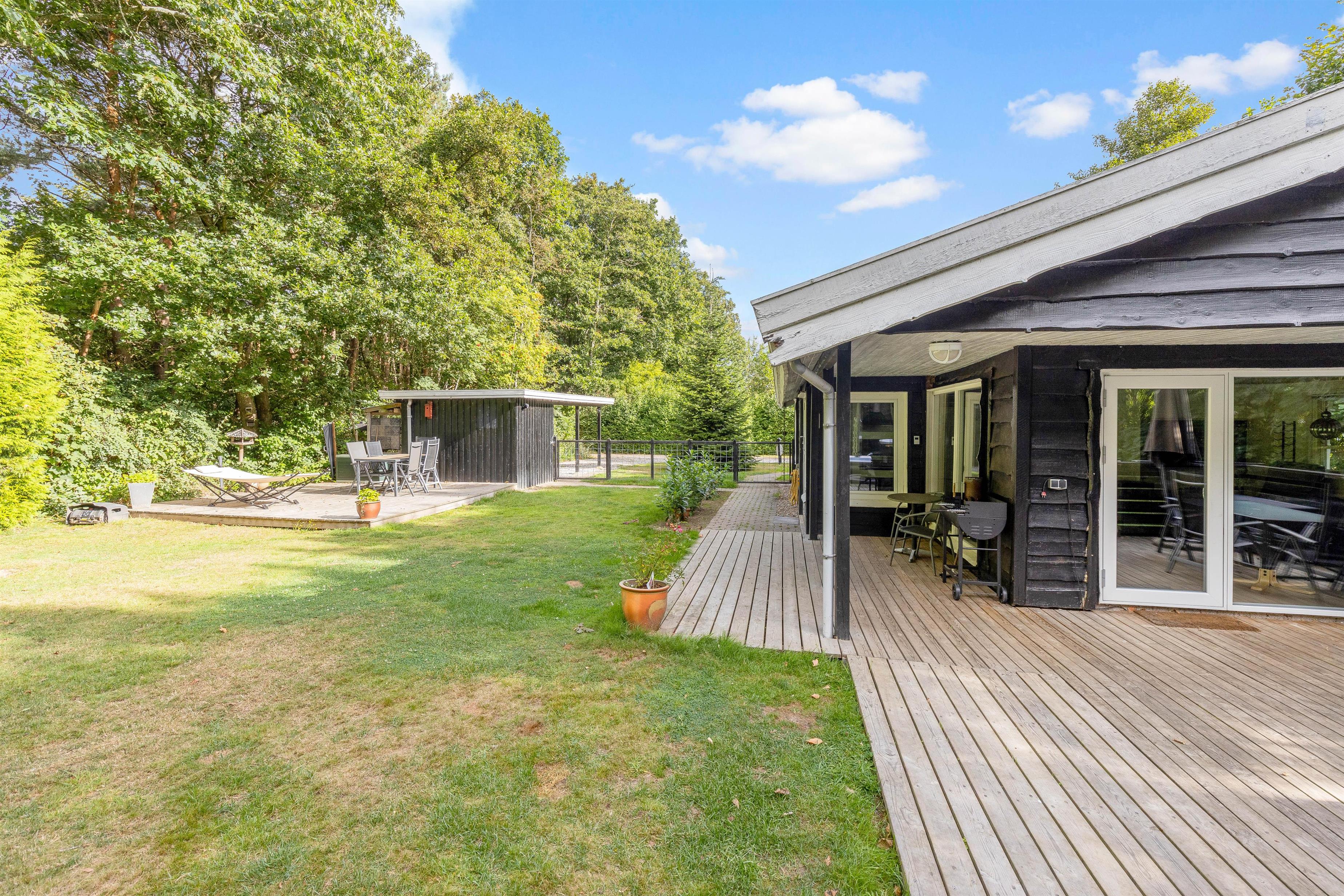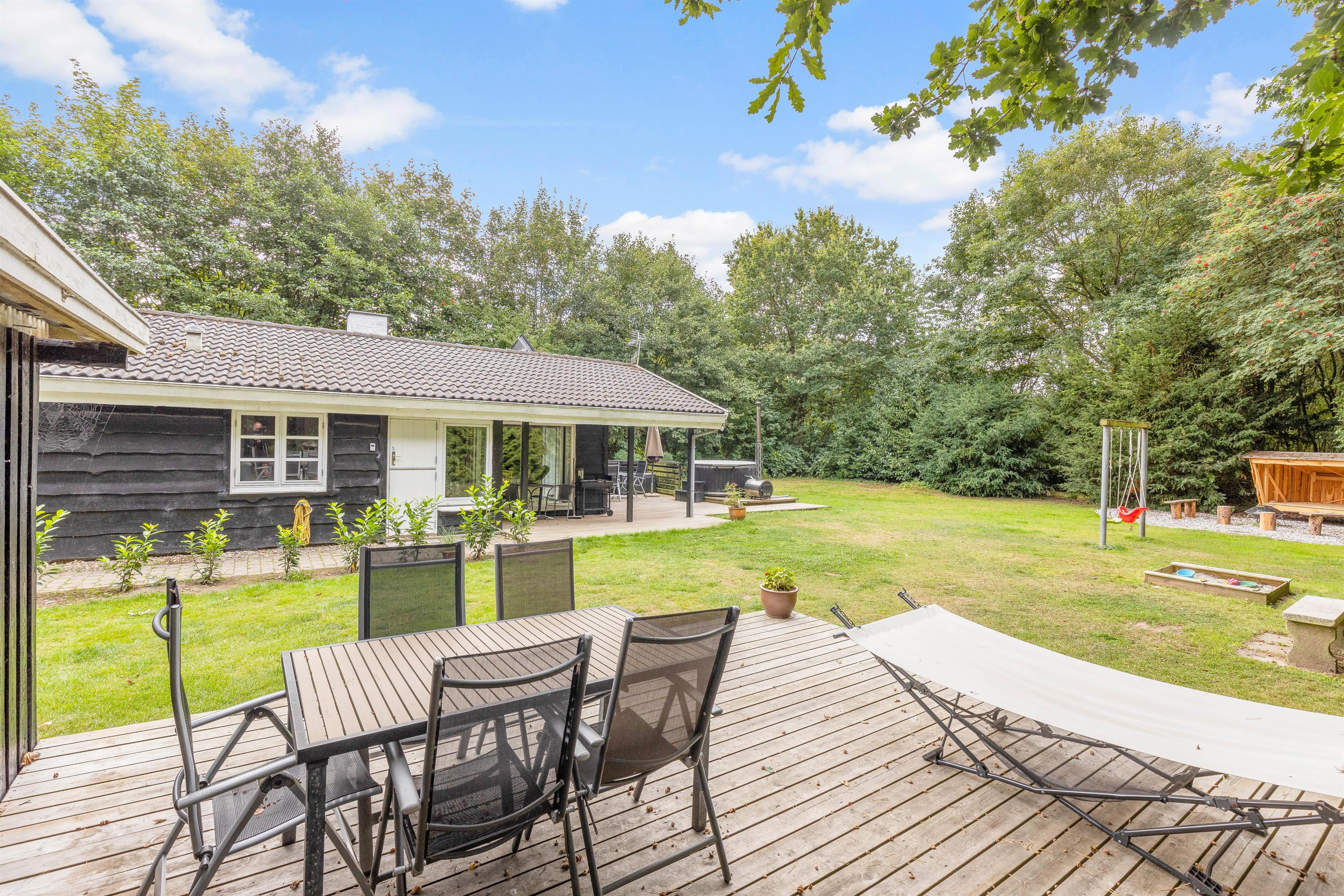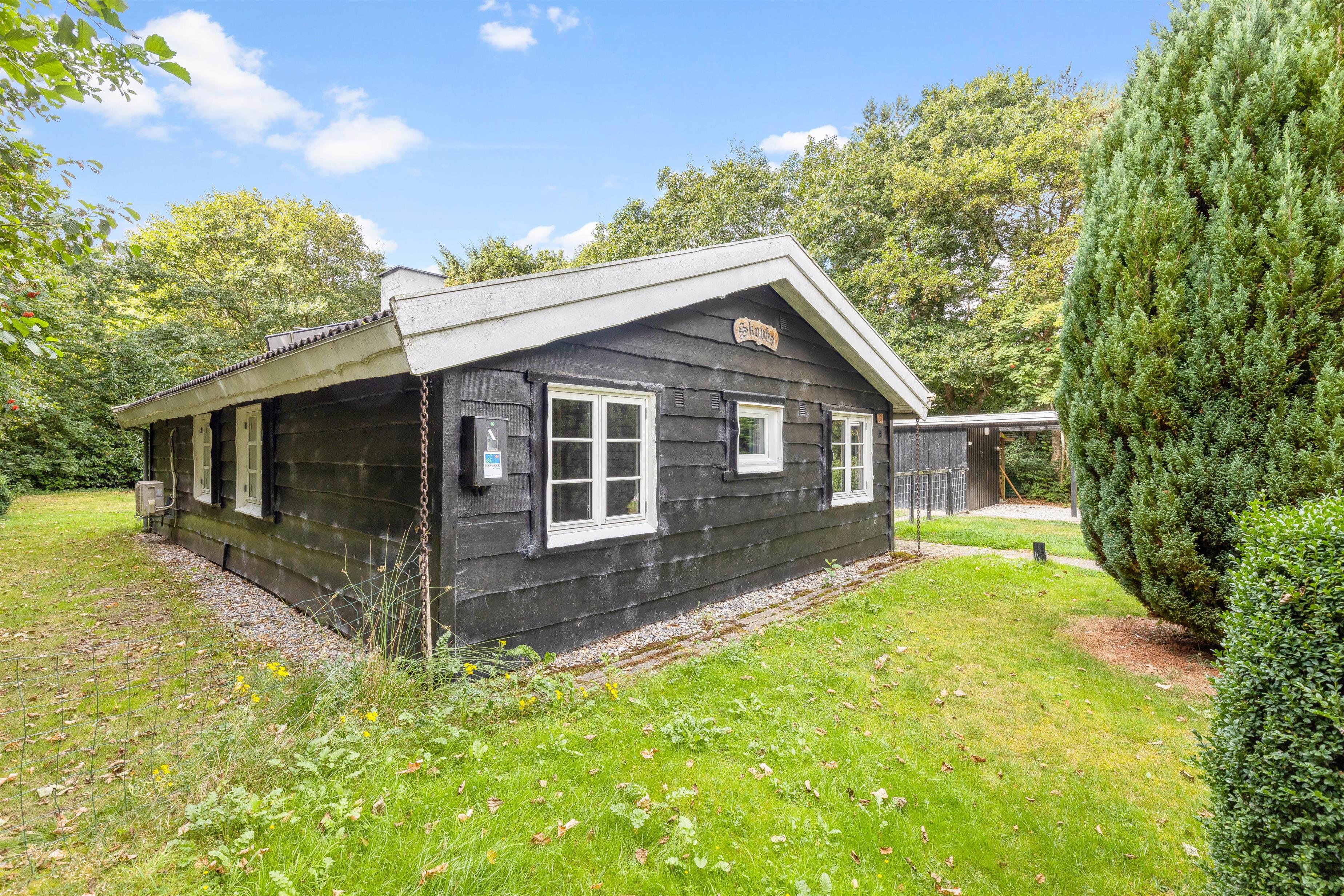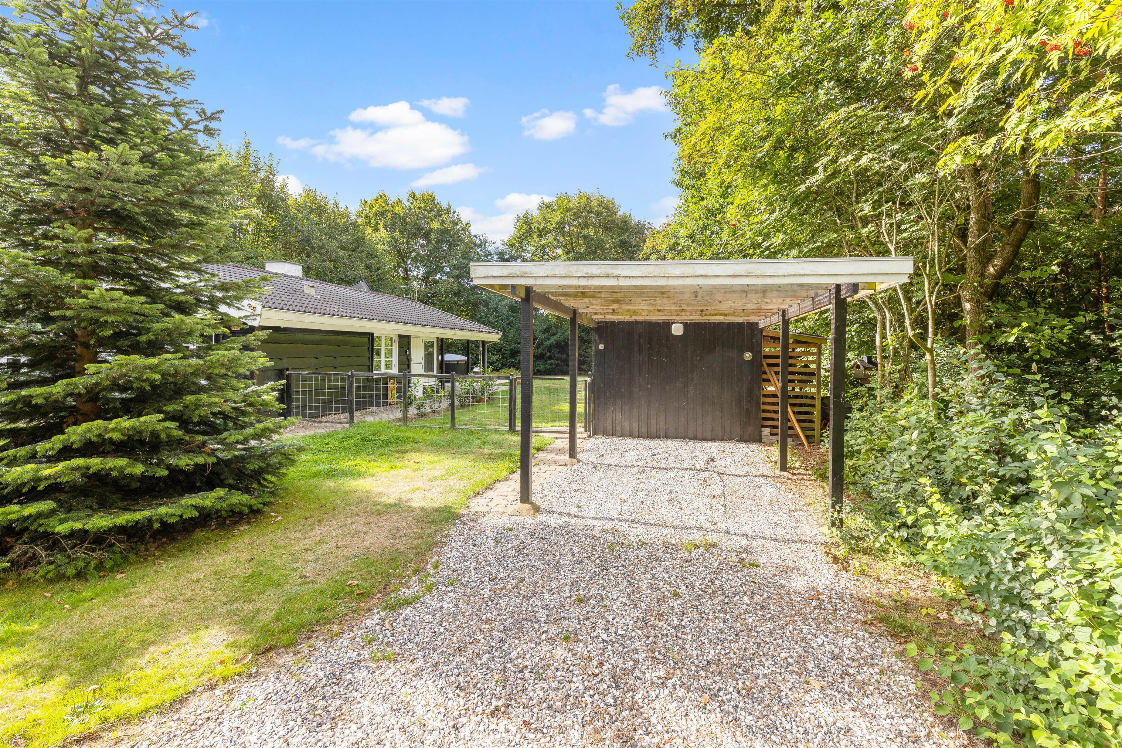 Sommerhuset har en indhegnet grund, hvor I kan give jeres hunde frisk luft uden bekymringer. Yderligere er der sandkasse og gyngestativ i haven, som familiens mindste helt sikkert vil få glæde af. Desuden har sommerhuset også en carport, så jeres bil kan stå beskyttet.