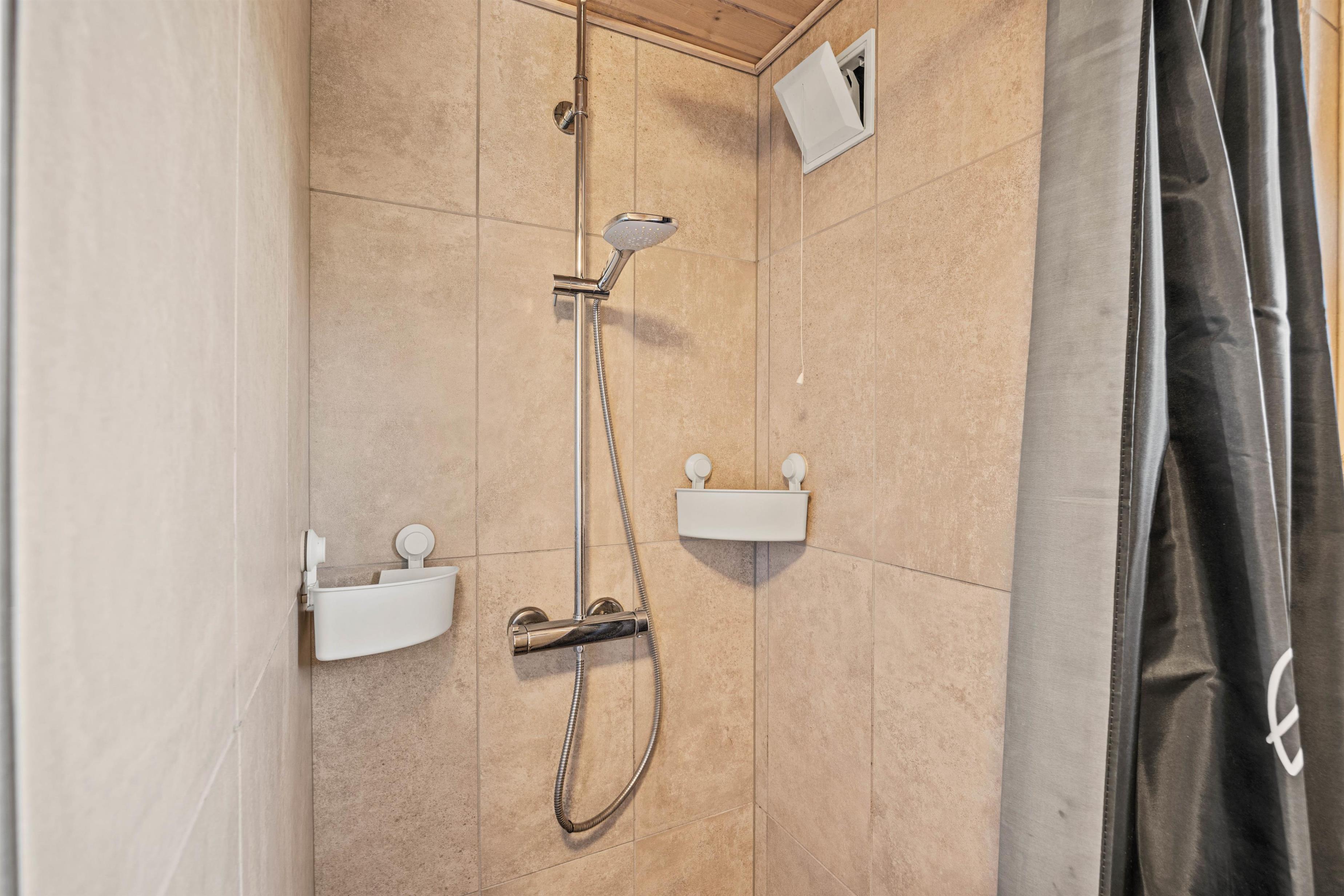 De 6 sovepladser i sommerhuset er fordelt på 2 dobbeltsenge og 2 etagesenge, som sikrer jer en god søvn til dagens diverse strabadser. Desuden rummer sommerhuset et autentisk badeværelse, som udover en lækker bruser også tilbyder gulvvarme.