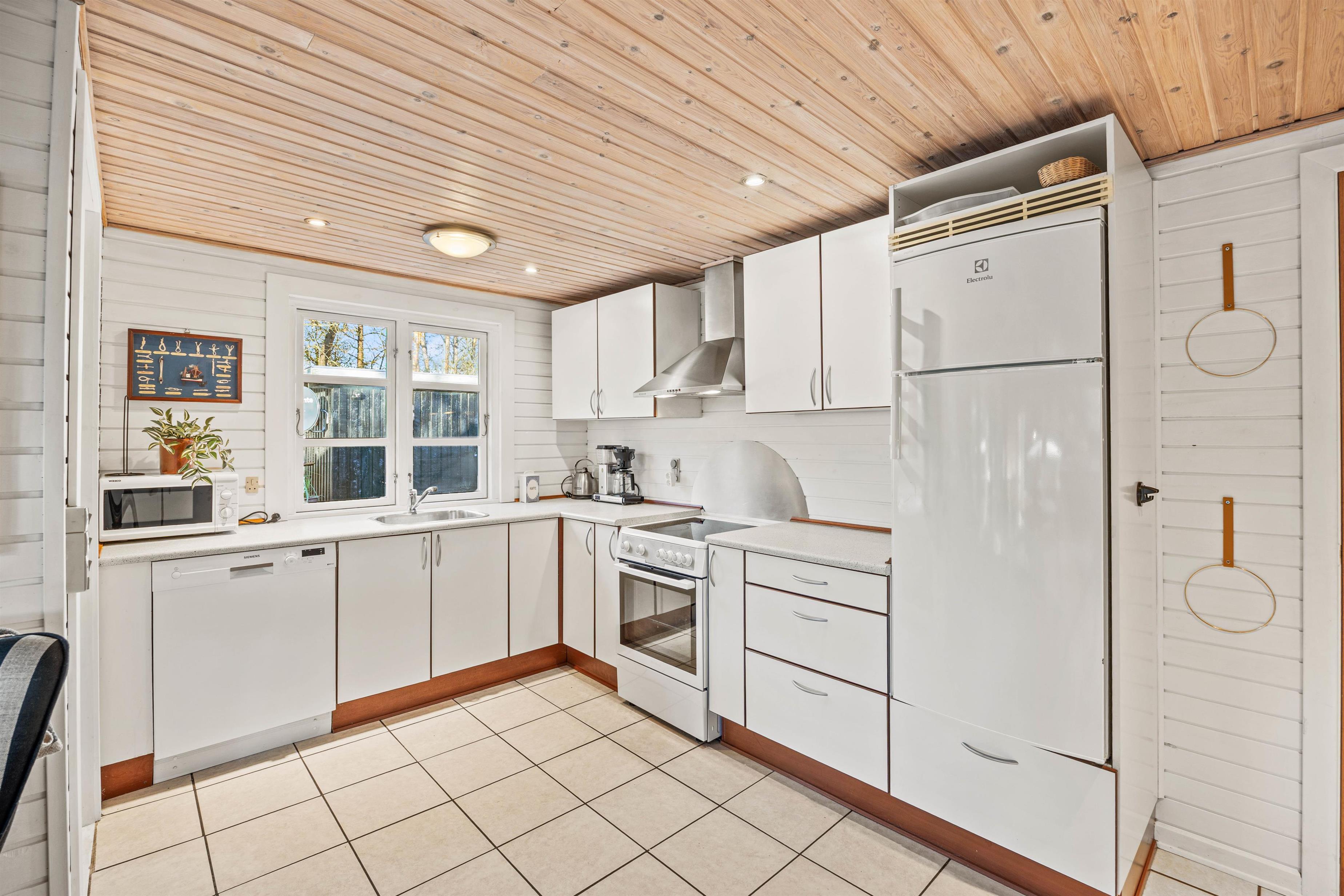 Dette sommerhus er hyggeligt indrettet, og I vil straks føle jer hjemme. Når I træder ind i sommerhuset, møder I det store køkken-alrum, som udover at være samtalevenligt også tilbyder en opvaskemaskine til at klare selv det største rod. Hele familien kan samles i stuen, til filmaftener eller timevis af spilhygge i hinandens selskab. Her kan I tænde op for brændeovnen og nyde knitren.