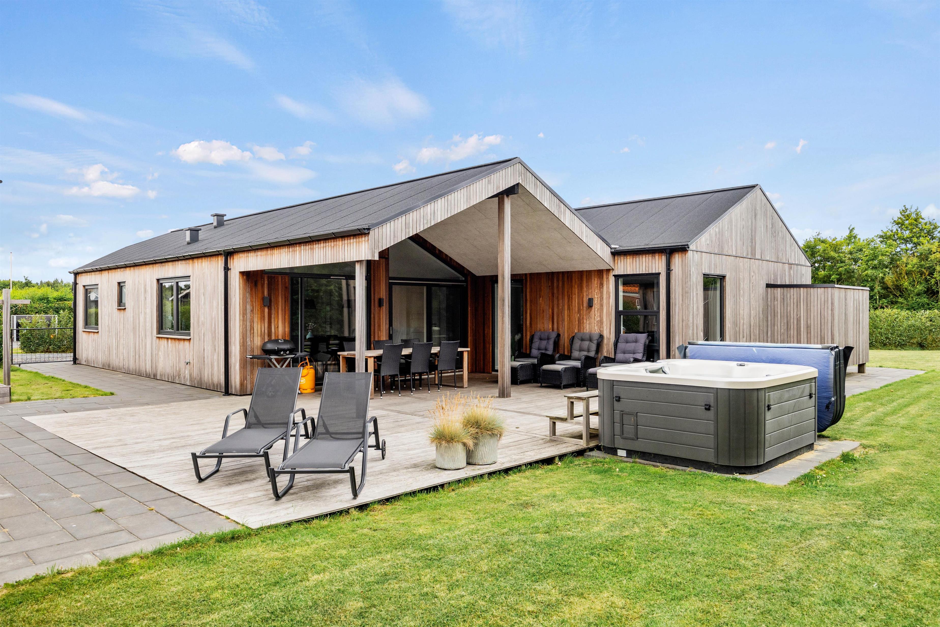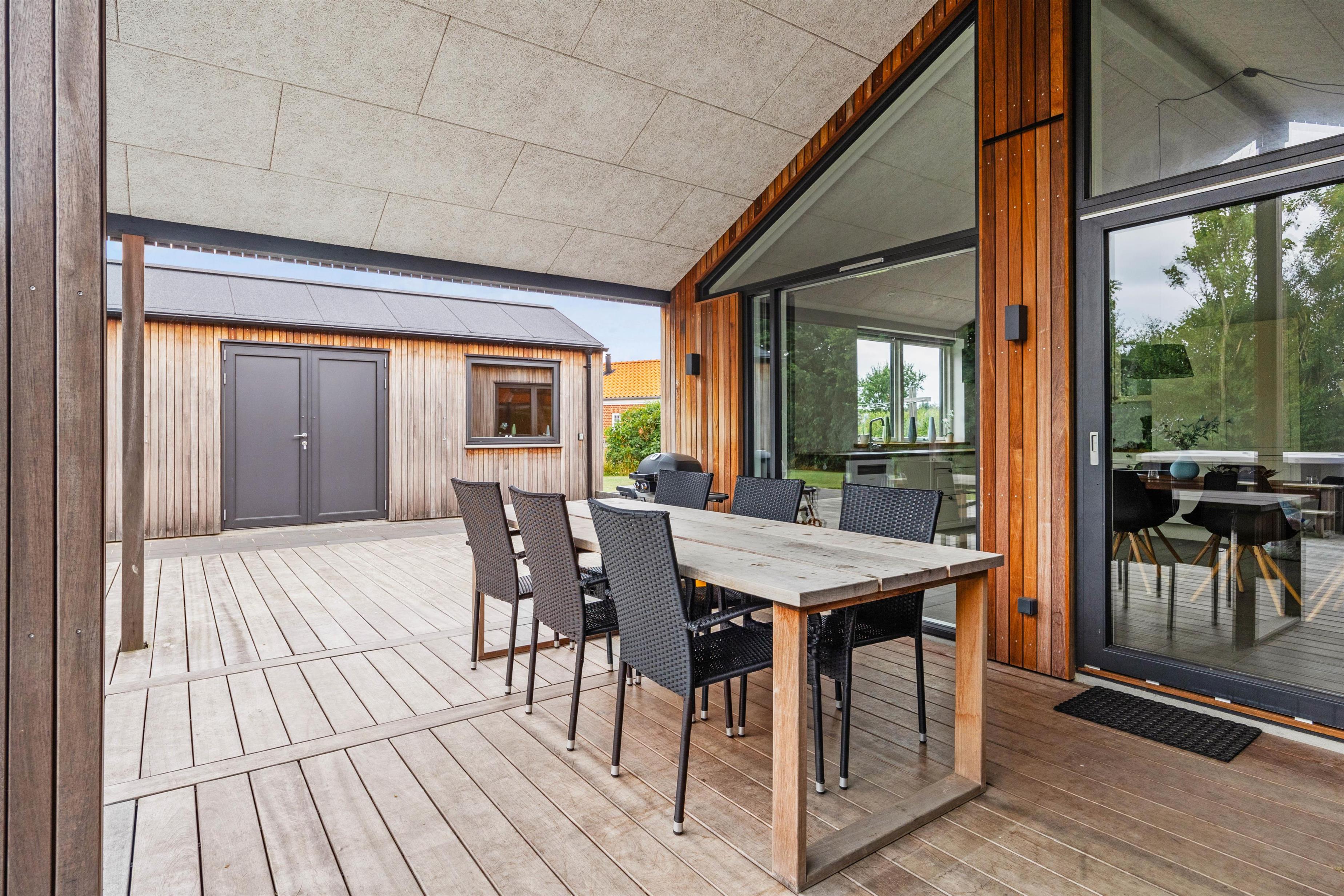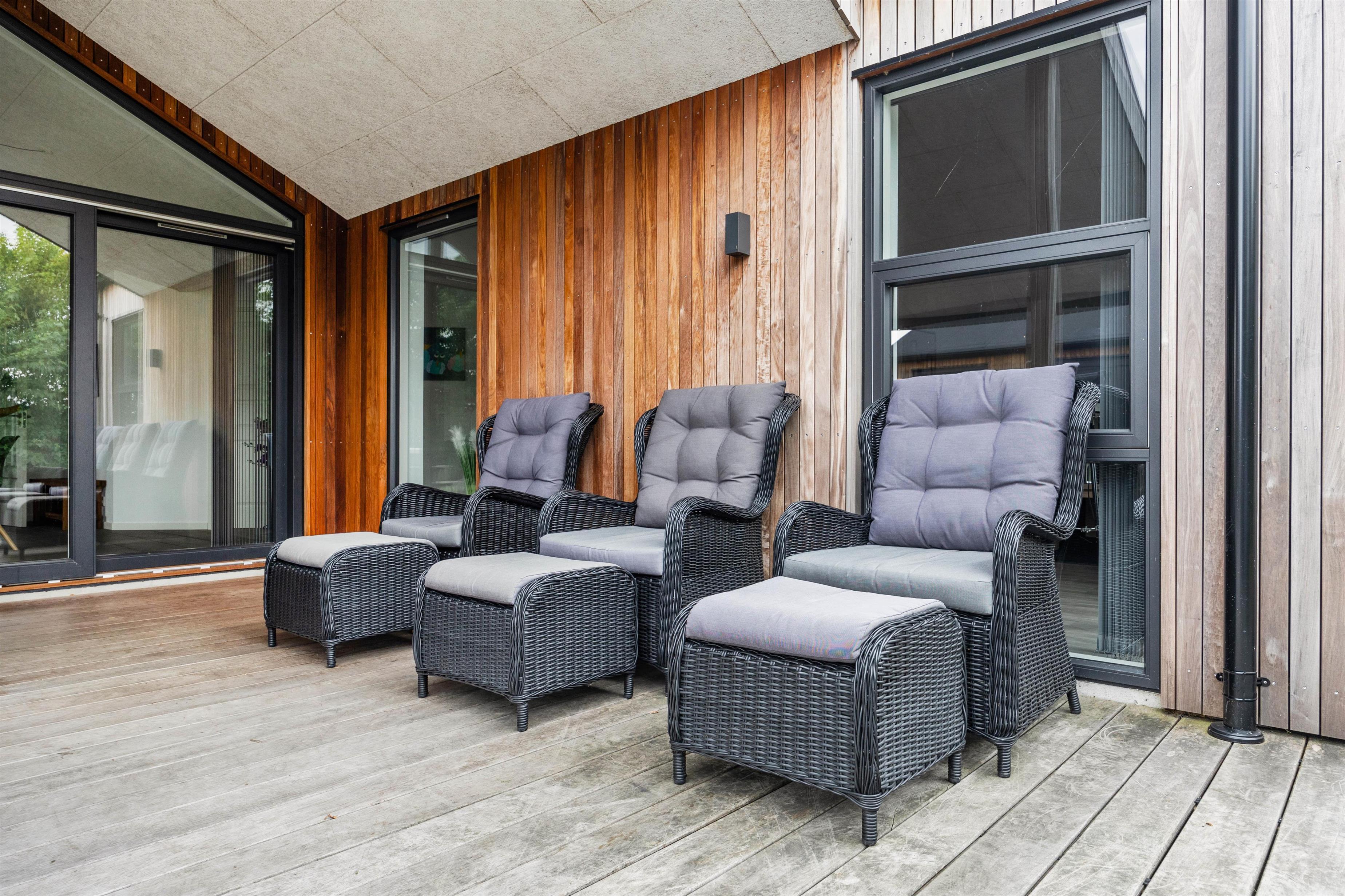 Den store terrasse skaber de ideelle omgivelser for at nyde ferien udendørs - her kan I slappe af, lege eller stresse helt af i wellness-oasen. Efter en aktiv feriedag kan I tilberede jeres aftensmad på gasgrillen og afslutte dagen under åben stjernehimmel i udendørsspaen eller en varm udendørssauna.
