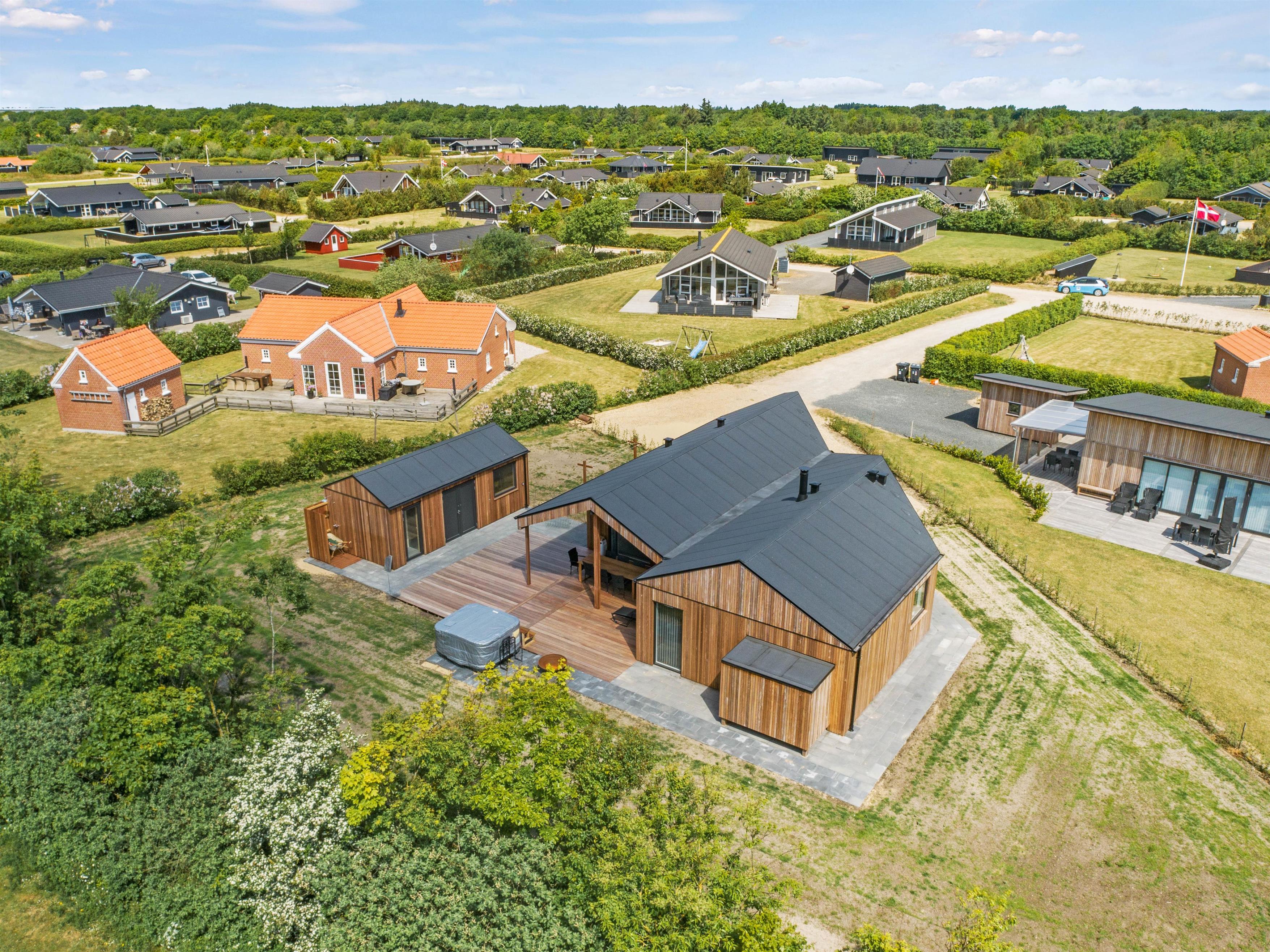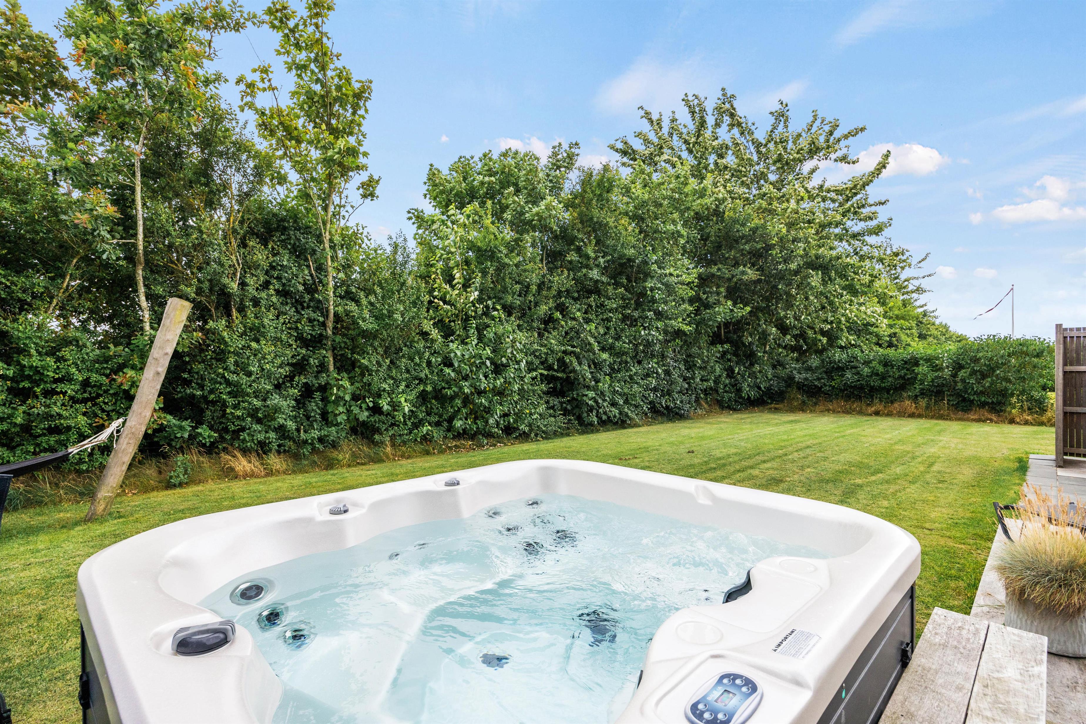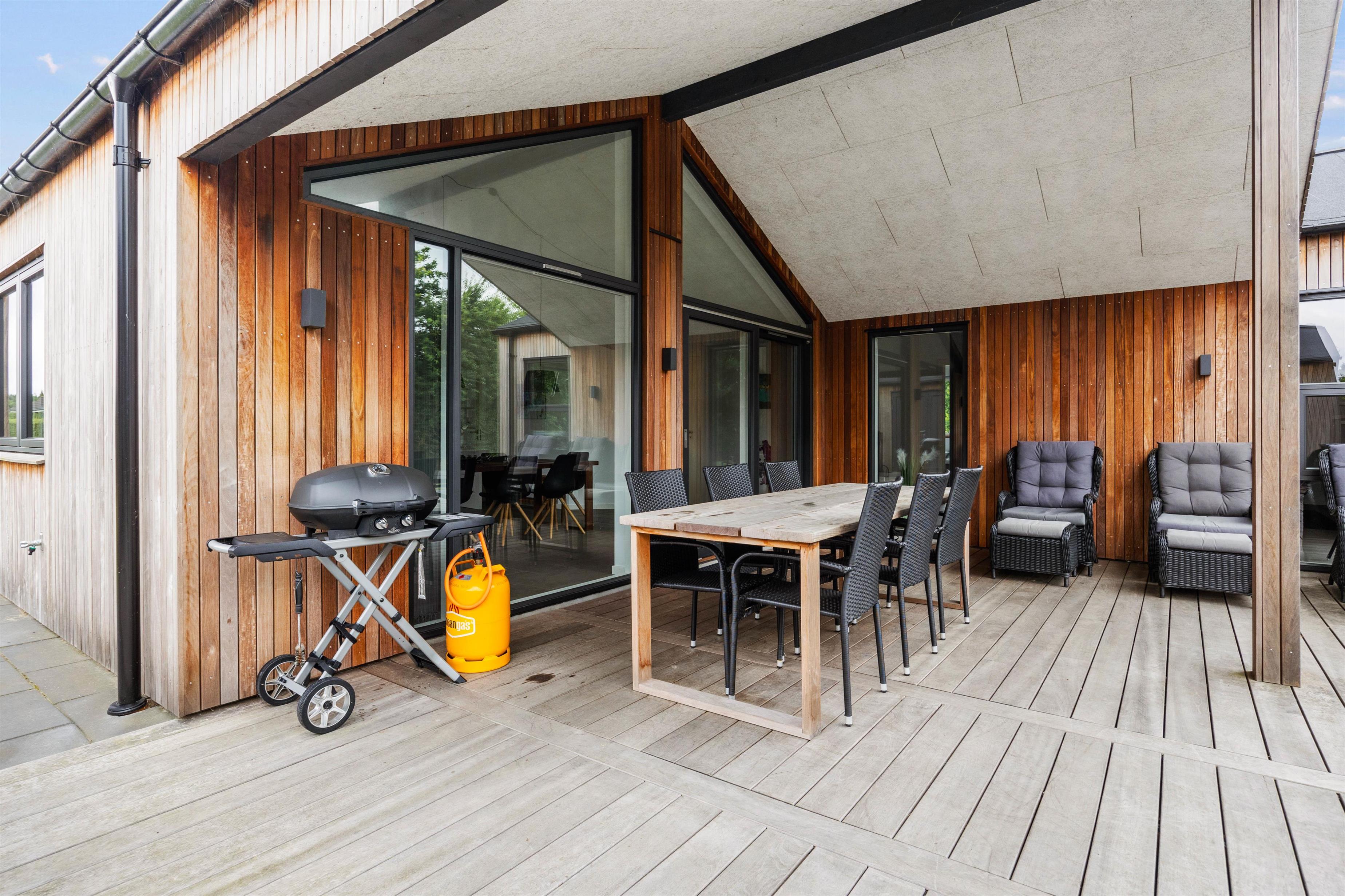 Den store terrasse skaber de ideelle omgivelser for at nyde ferien udendørs - her kan I slappe af, lege eller stresse helt af i wellness-oasen. Efter en aktiv feriedag kan I tilberede jeres aftensmad på gasgrillen og afslutte dagen under åben stjernehimmel i udendørsspaen eller en varm udendørssauna.