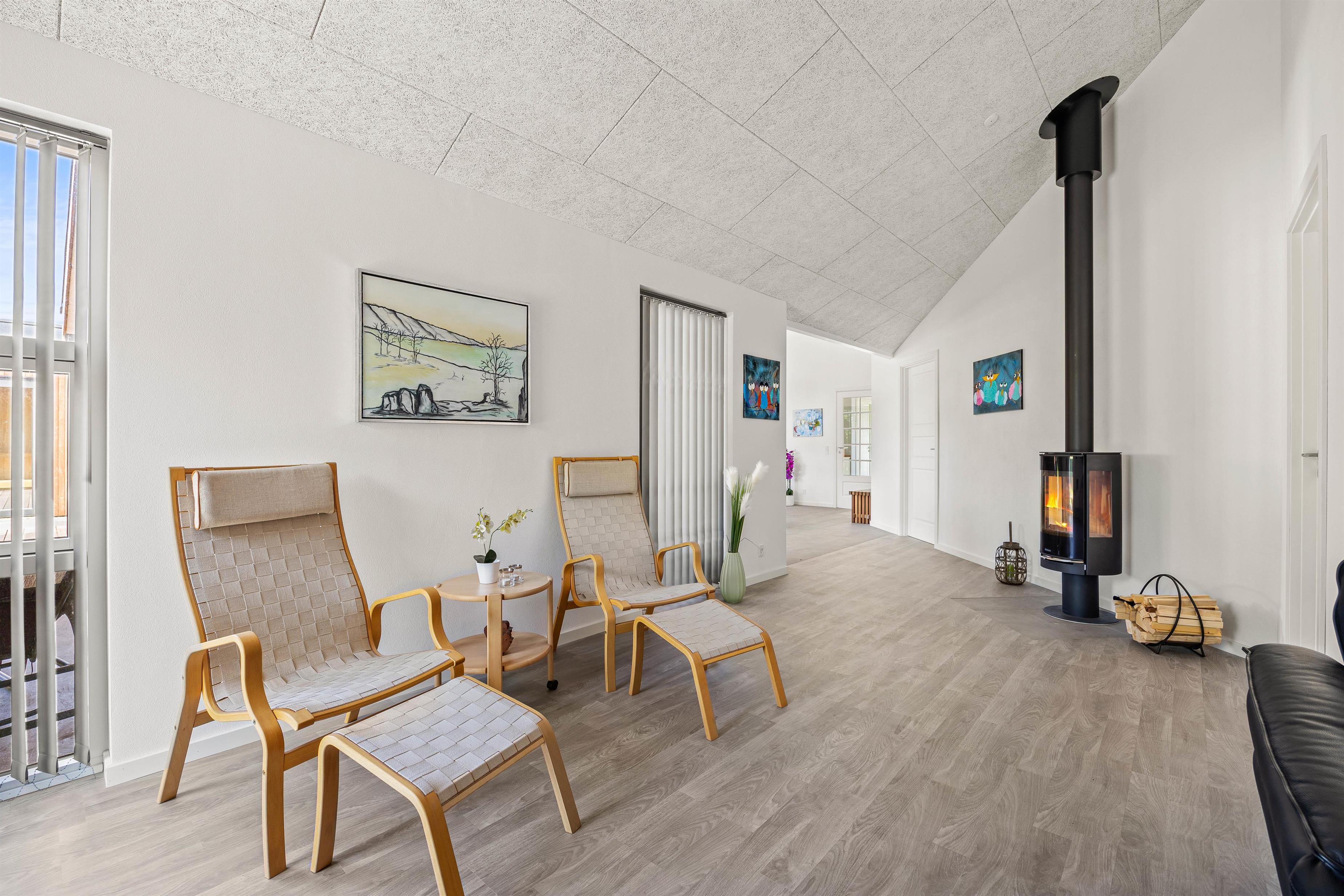I stuen finder I brændeovnen, som ikke kun sender varme gennem sommerhuset, men også skaber en hyggelig atmosfære.