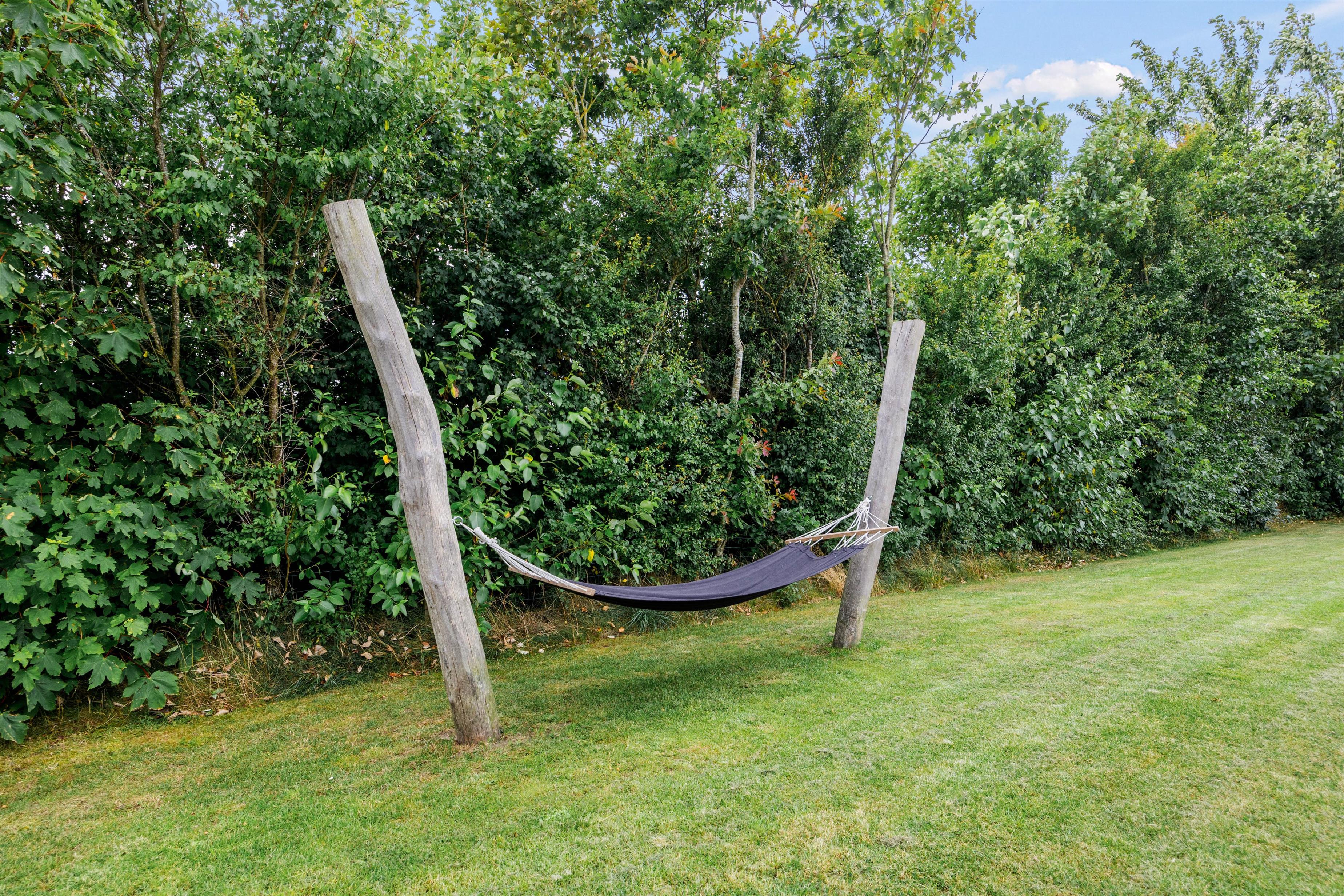 Hele vejen rundt om feriehuset er der en halvanden meter bred terrasse, og der er endda træterrasse fra sommerhuset til annekset. Den store indhegnede natur- og plænegrund på 1320m2 giver jer masser af plads til at nyde udendørslivet, og giver jer mulighed for at lade hunden løbe trygt og frit rundt i haven.