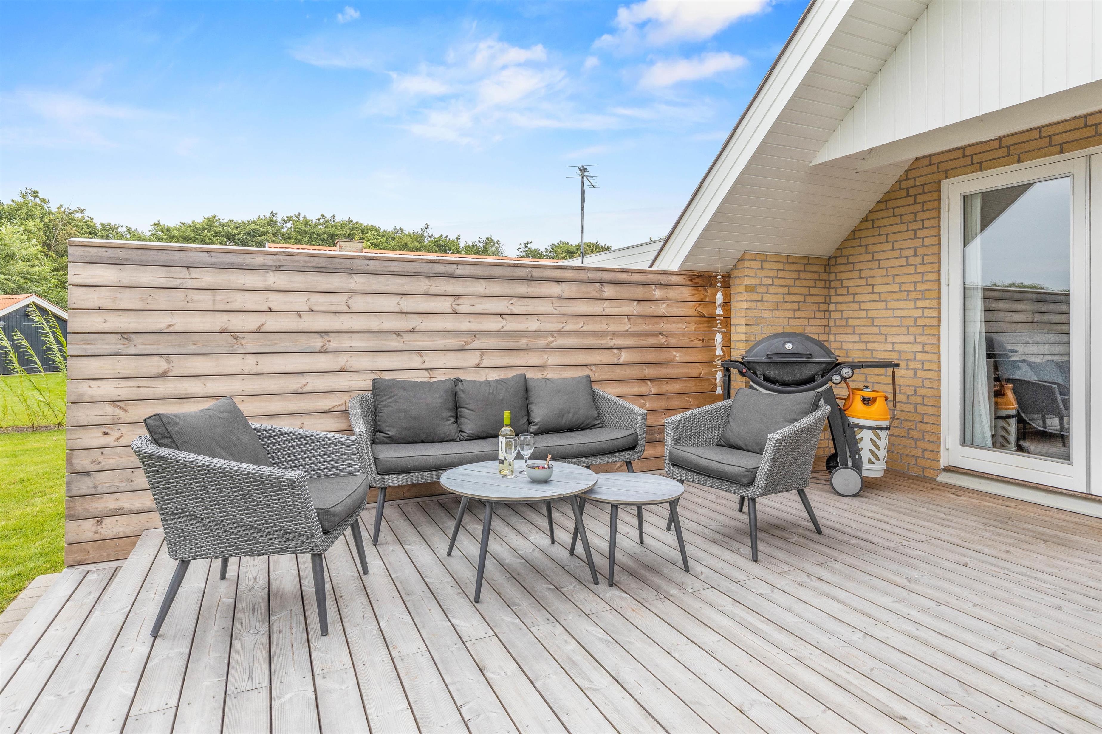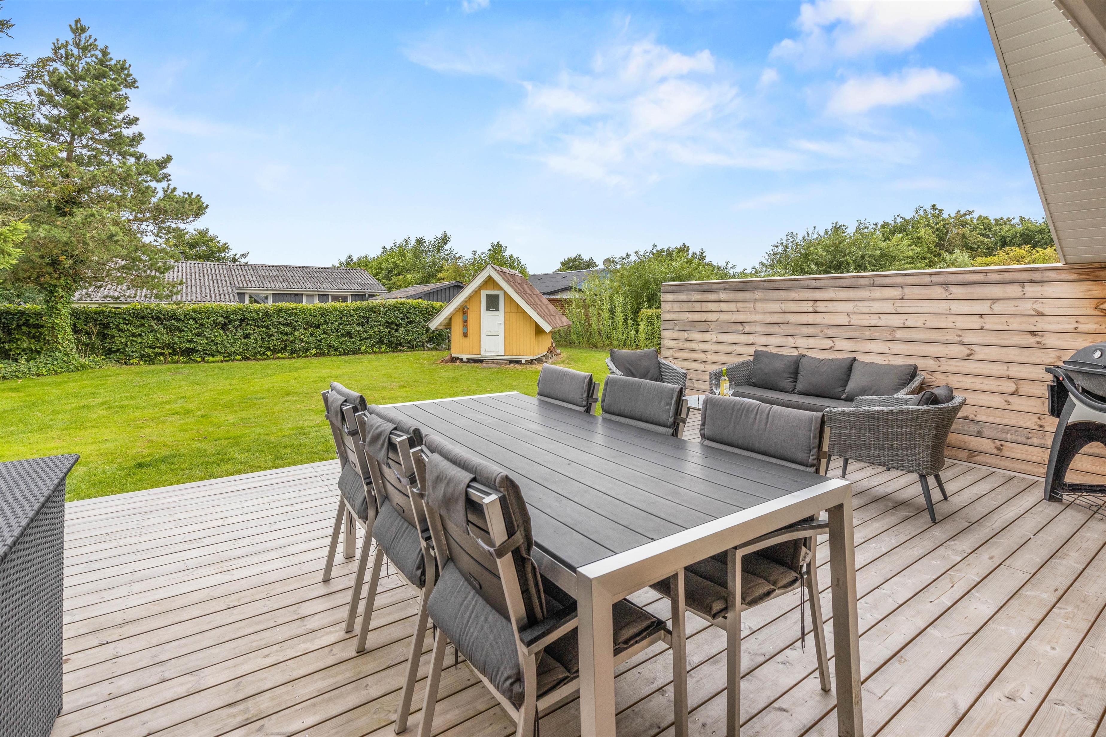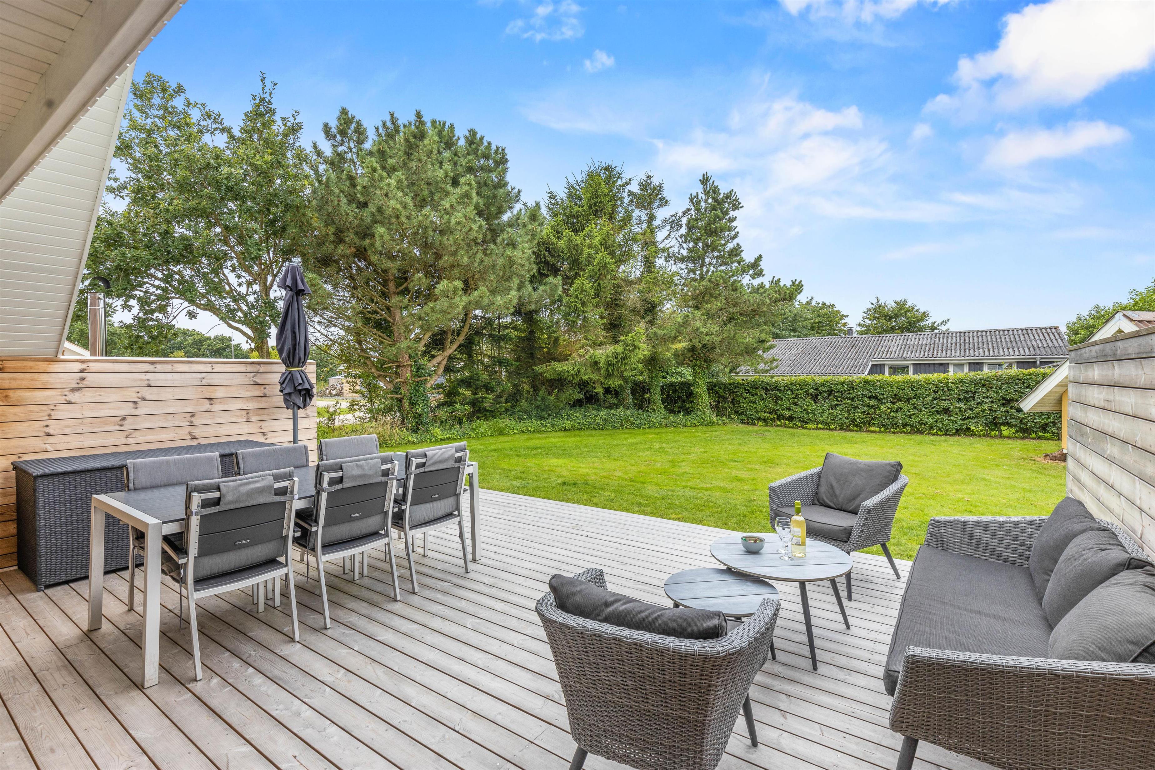 Sommerhuset er placeret på en plænegrund, der er 698 kvadratmeter. Her har I en dejlig, stor træterrasse på hele 120 kvadratmeter, hvor I finder både grill, havemøbler, loungesæt og solvogne. Det er også her vildmarksbadet er at finde. Det skal blot tændes op i et par timer før brug, så I til aften kan nyde mørket falde på og stjernerne komme frem, mens I sidder i det varme vand og nyder noget koldt at drikke.