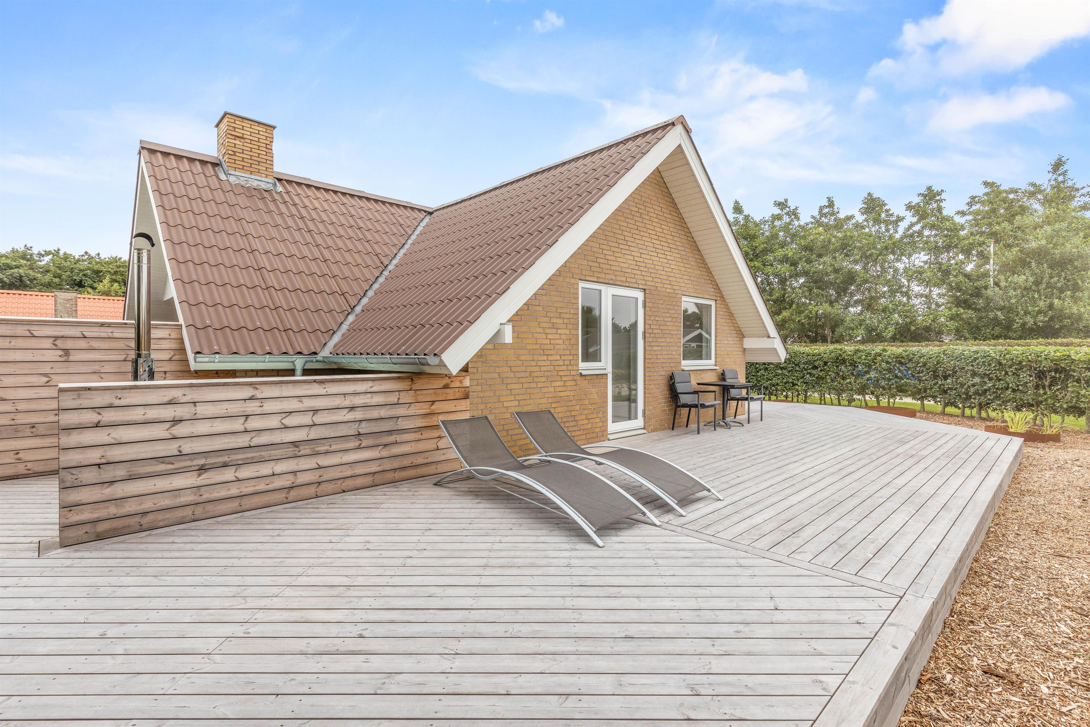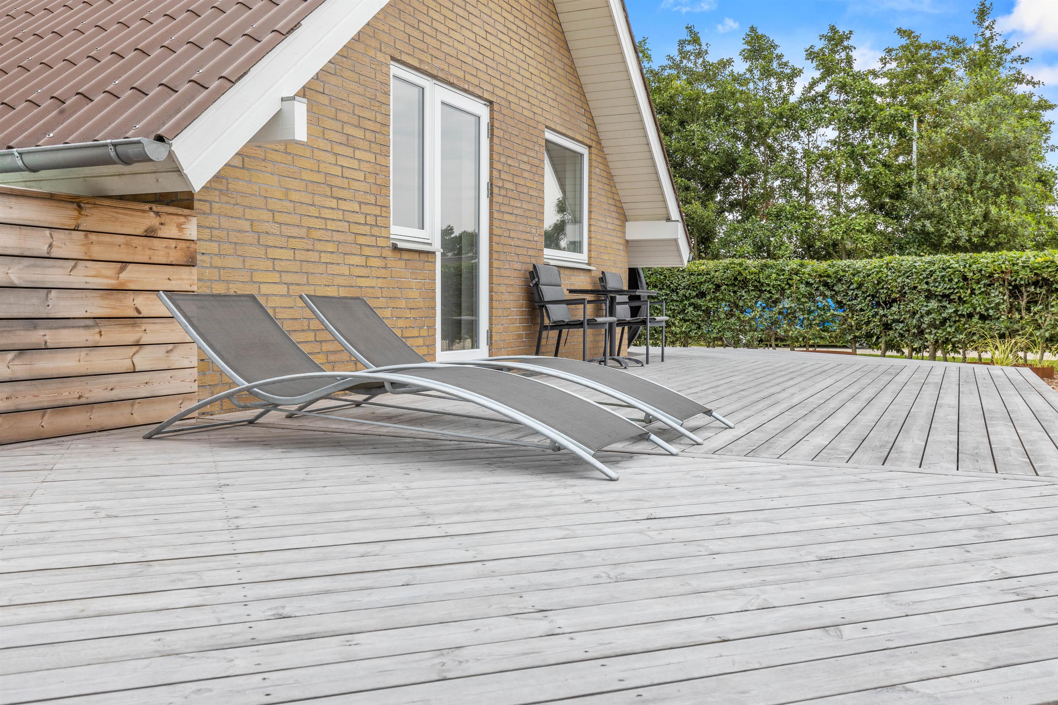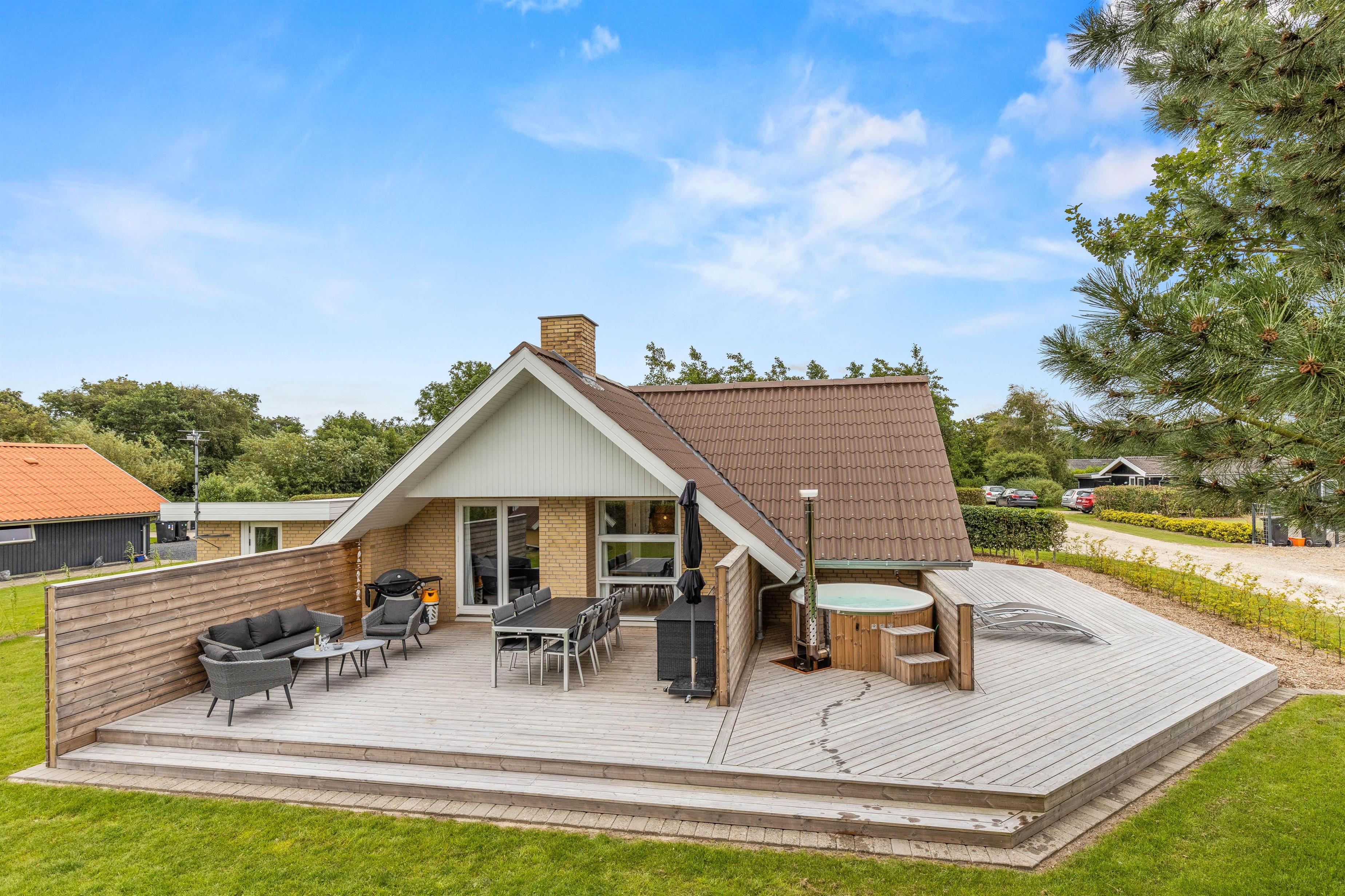 Sommerhuset er placeret på en plænegrund, der er 698 kvadratmeter. Her har I en dejlig, stor træterrasse på hele 120 kvadratmeter, hvor I finder både grill, havemøbler, loungesæt og solvogne. Det er også her vildmarksbadet er at finde. Det skal blot tændes op i et par timer før brug, så I til aften kan nyde mørket falde på og stjernerne komme frem, mens I sidder i det varme vand og nyder noget koldt at drikke.