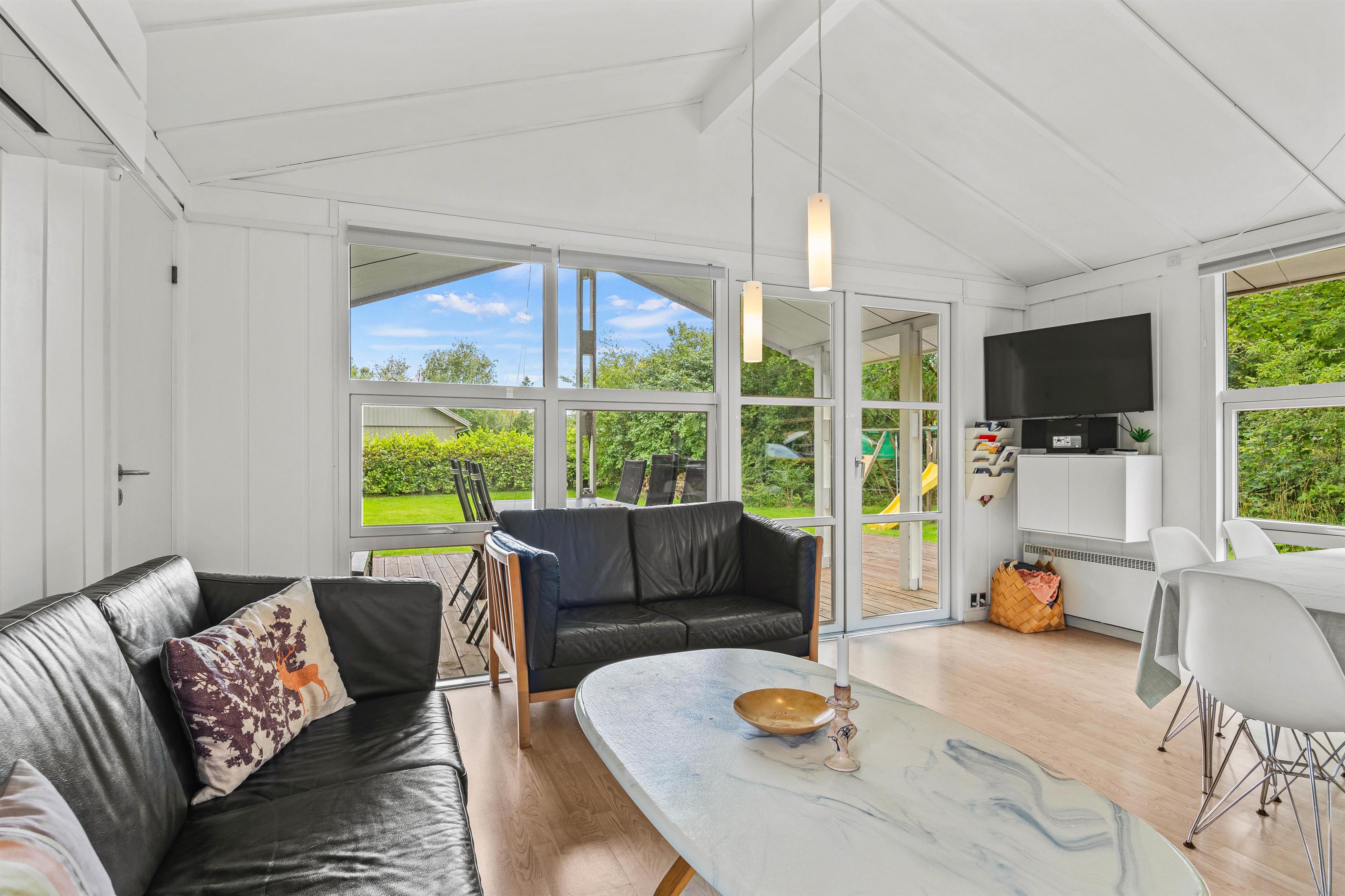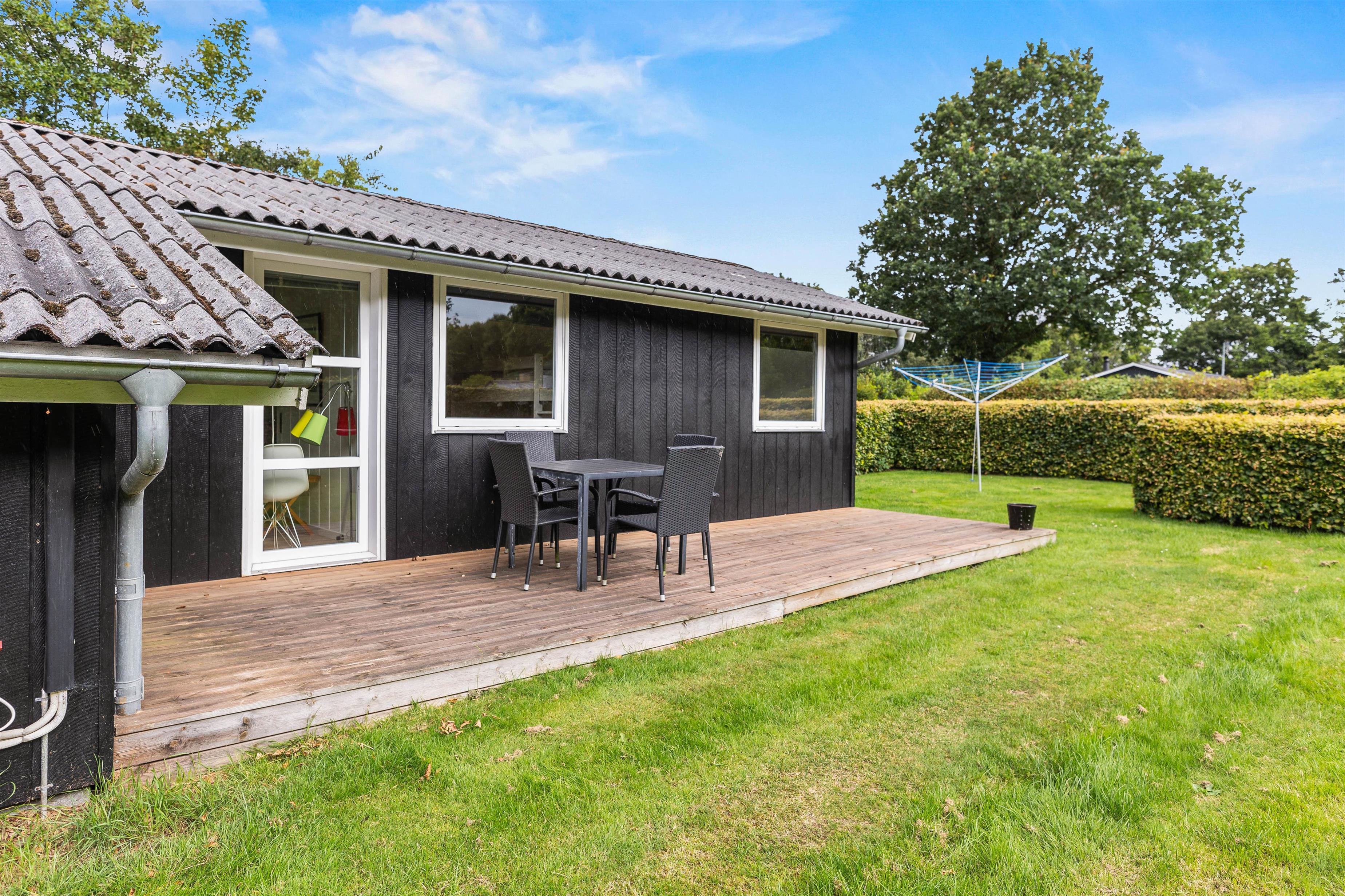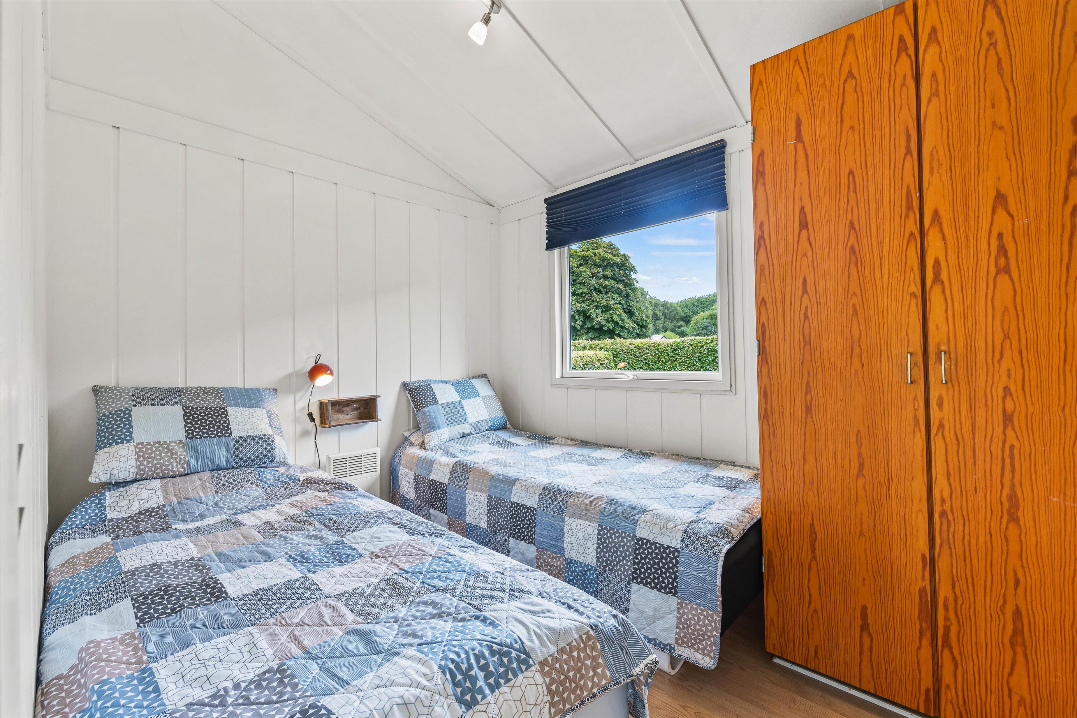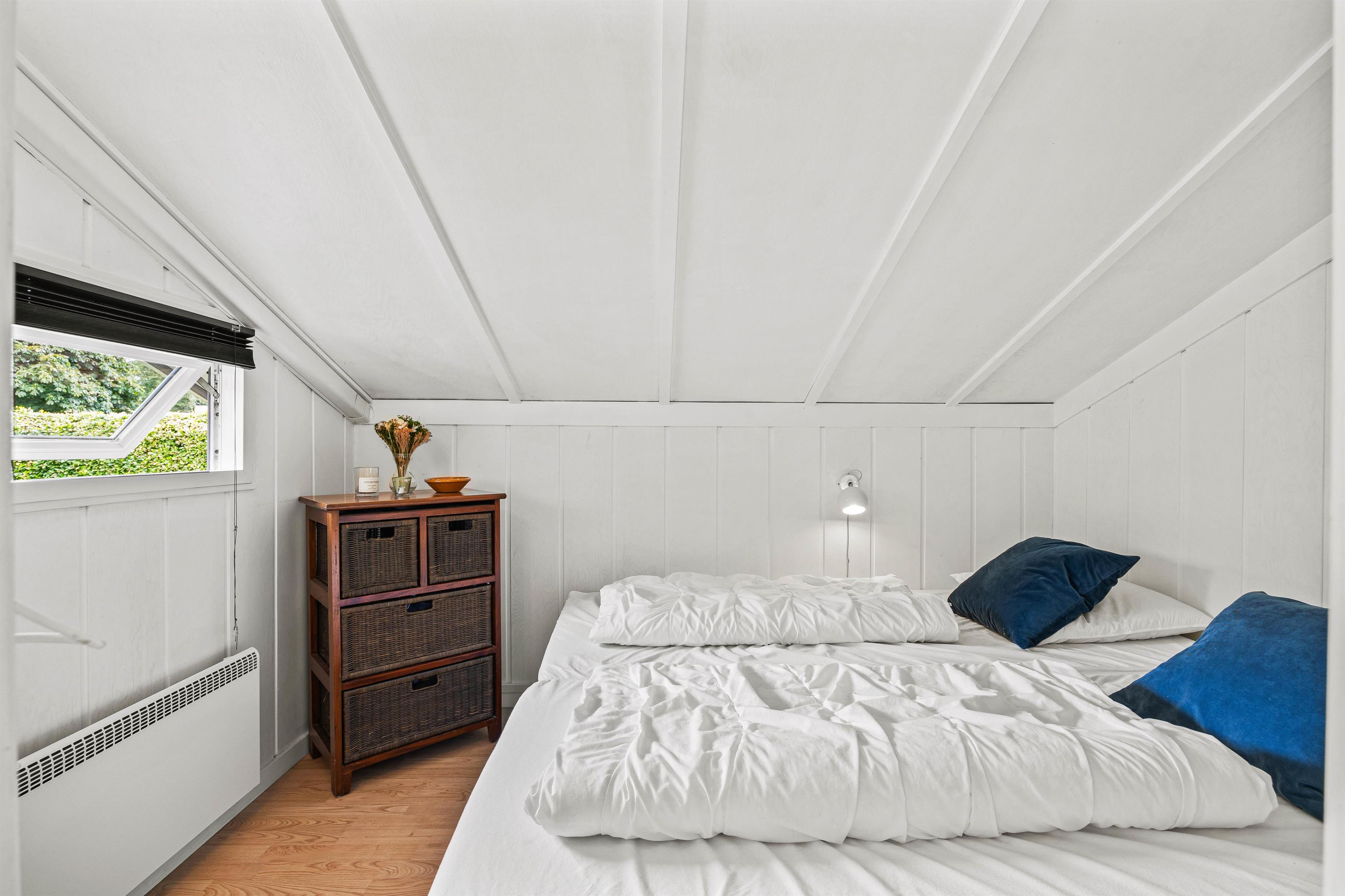 Sommerhuset har tre soveværelser, som giver fleksible overnatningsmuligheder. Et af værelserne byder på en stor 140x200 cm dobbeltseng, et andet værelse har to enkeltsenge, mens det tredje værelse er udstyret med en funktionel køjeseng. Denne opdeling gør huset ideelt for børnefamilier, der har brug for både privatliv og fælles hyggetid.