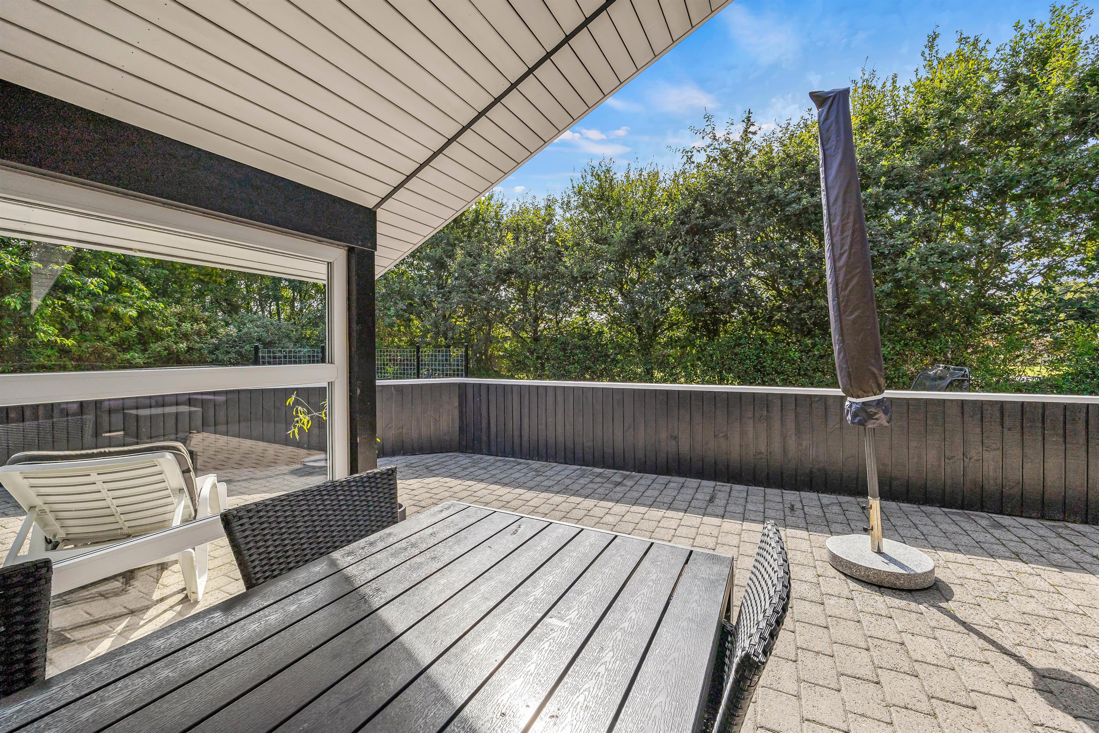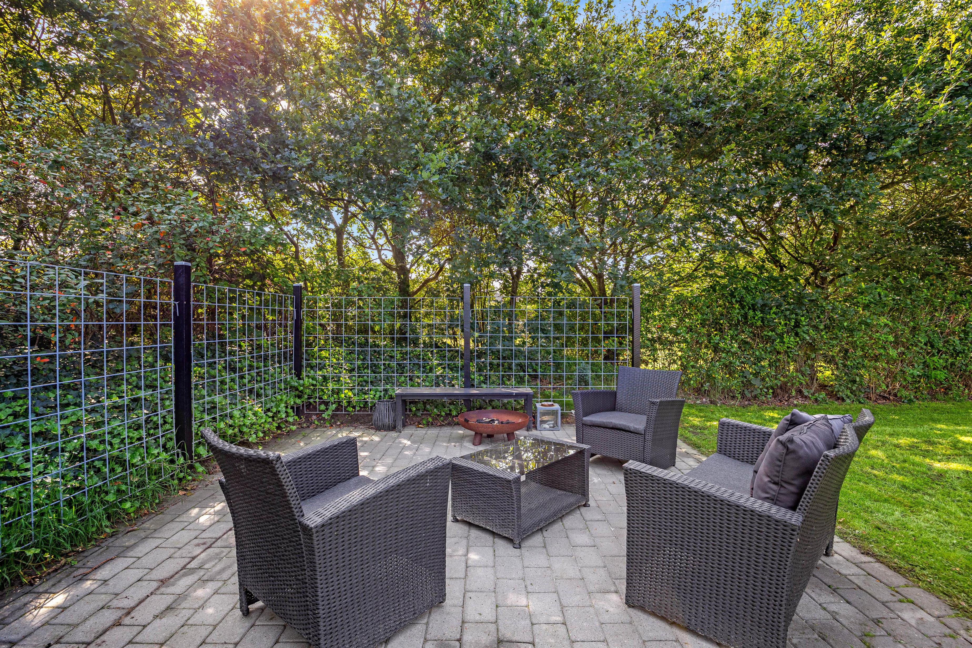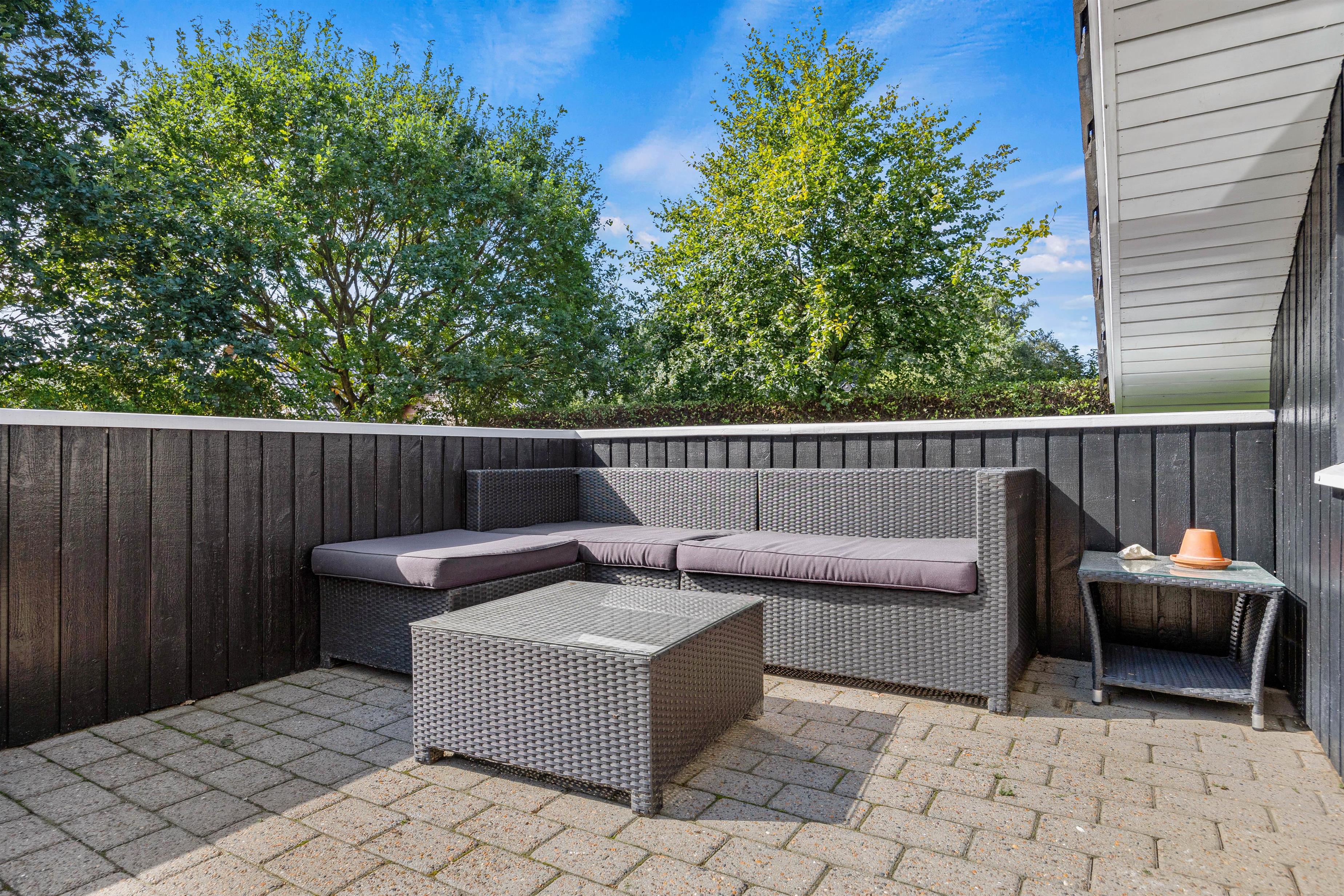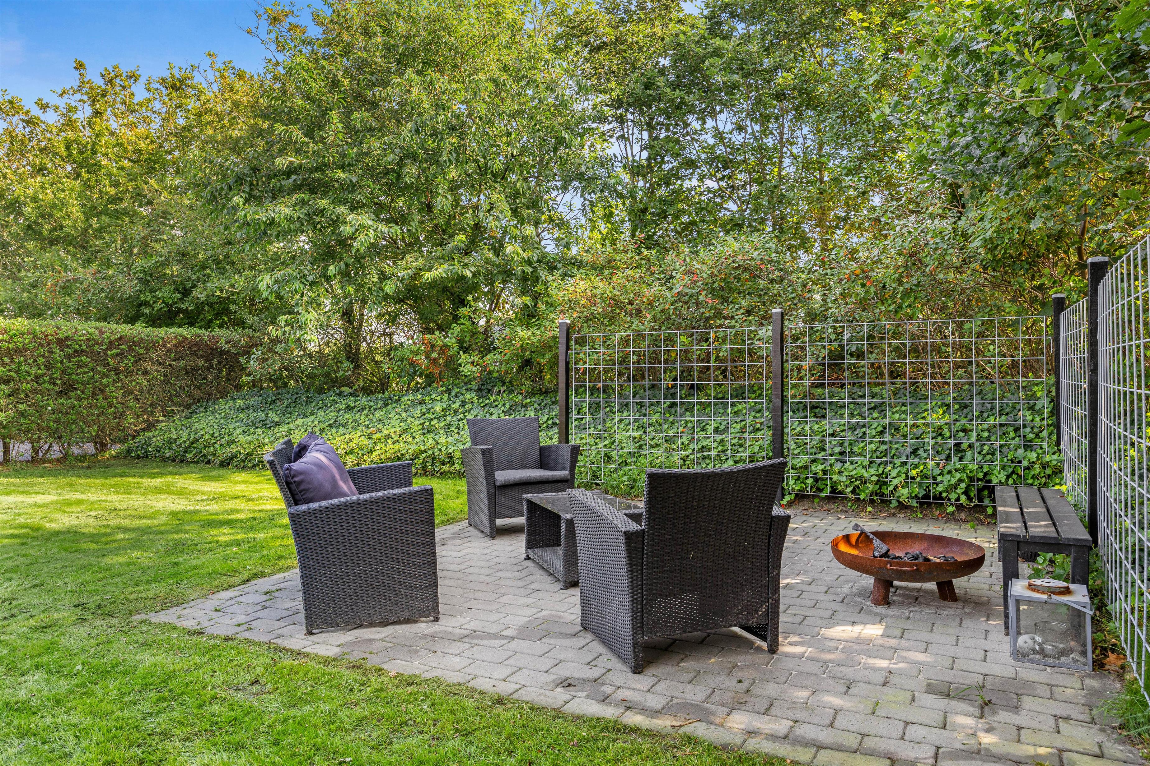 Udendørsområdet ved sommerhuset byder på en indbydende og aflukket terrasse, hvor I kan lade småbørnene boltre sig trygt og sikkert. Her finder I alt, hvad I behøver til en perfekt ferieoplevelse - fra grill til havemøbler, solvogne og en parasol, der skaber ideelle rammer for dage og aftener under åben himmel. Måske frister det med hjemmelavede burgere på grillen?