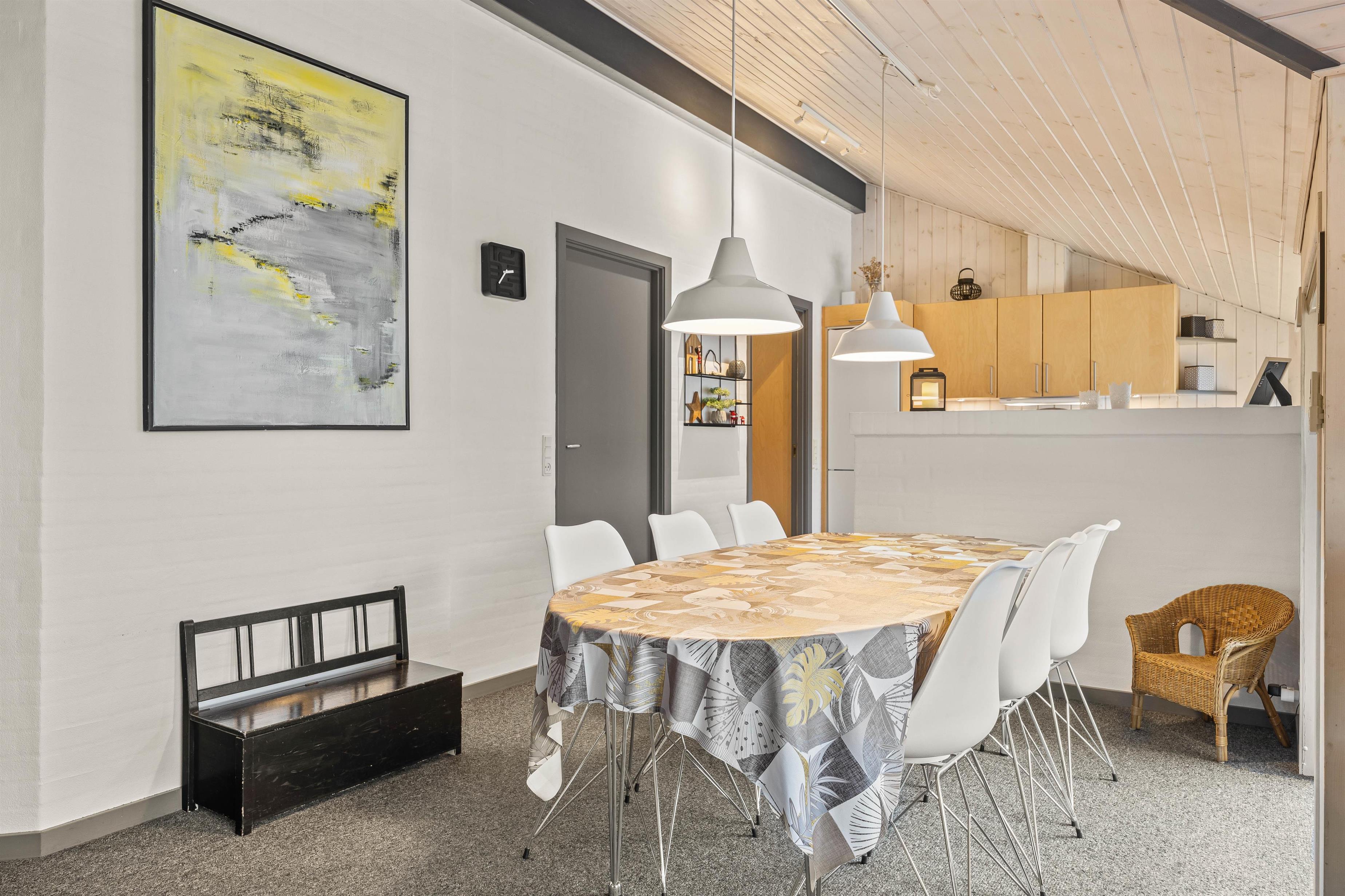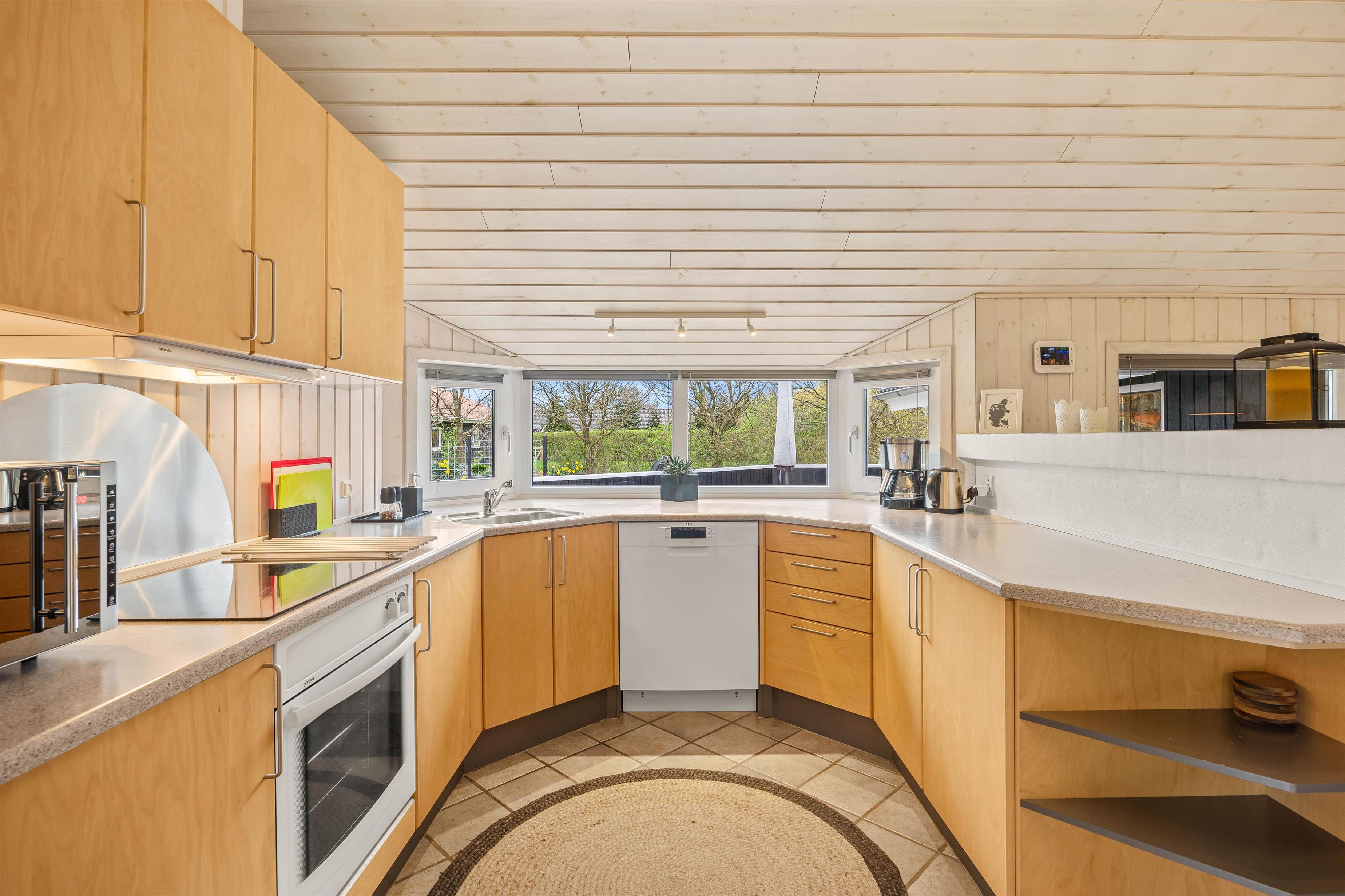 Inde i ferieboligen inviterer den åbne indretning til livlige samtaler, selv når nogen står ved komfuret og andre sidder omkring spisebordet og spiller kort eller lægger puslespil. Det er let at holde øje med, hvad der foregår nedenunder i stuen, hvor børnene måske fordyber sig i deres yndlingsserier på streamingtjenesten, mens I tryller i køkkenet.