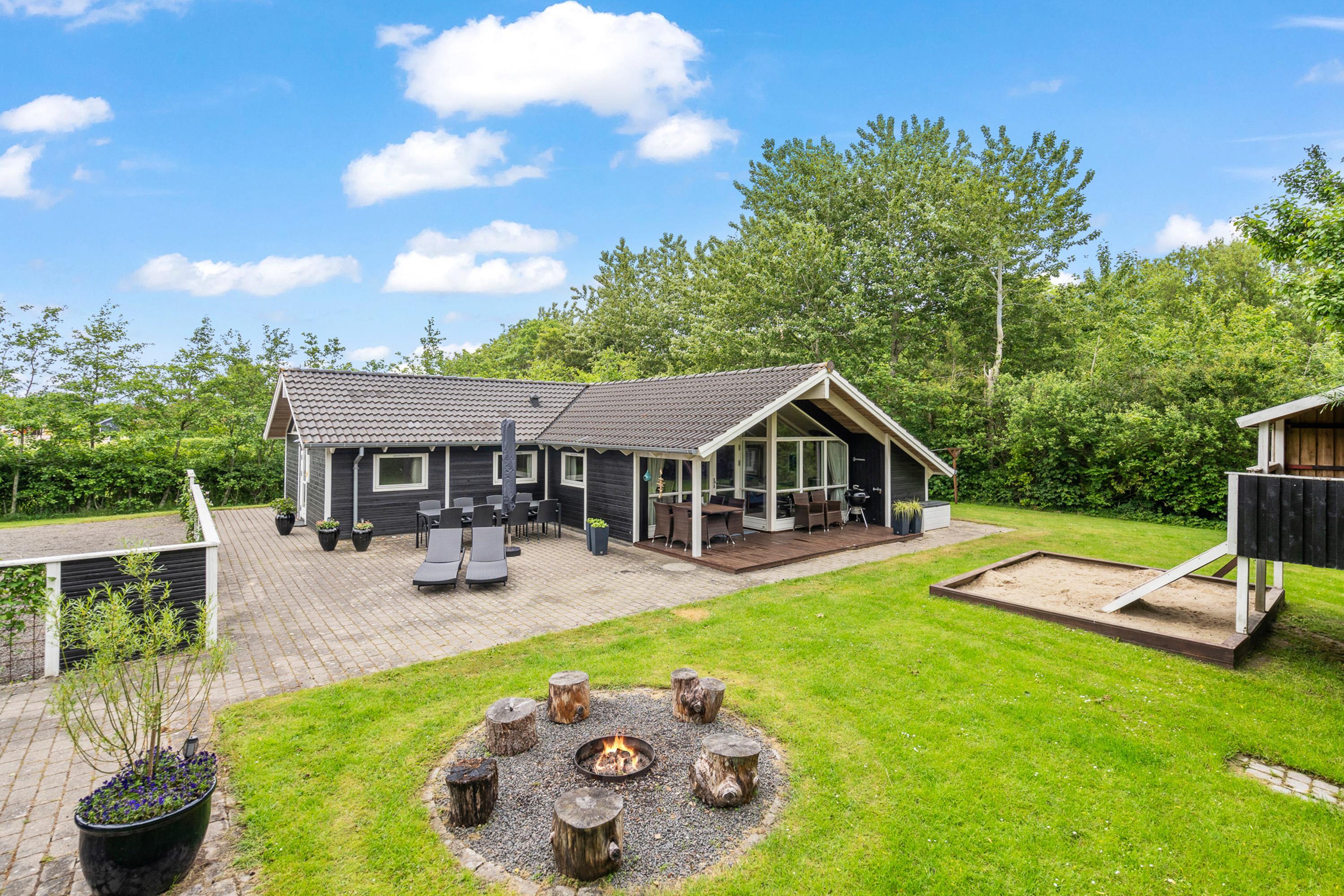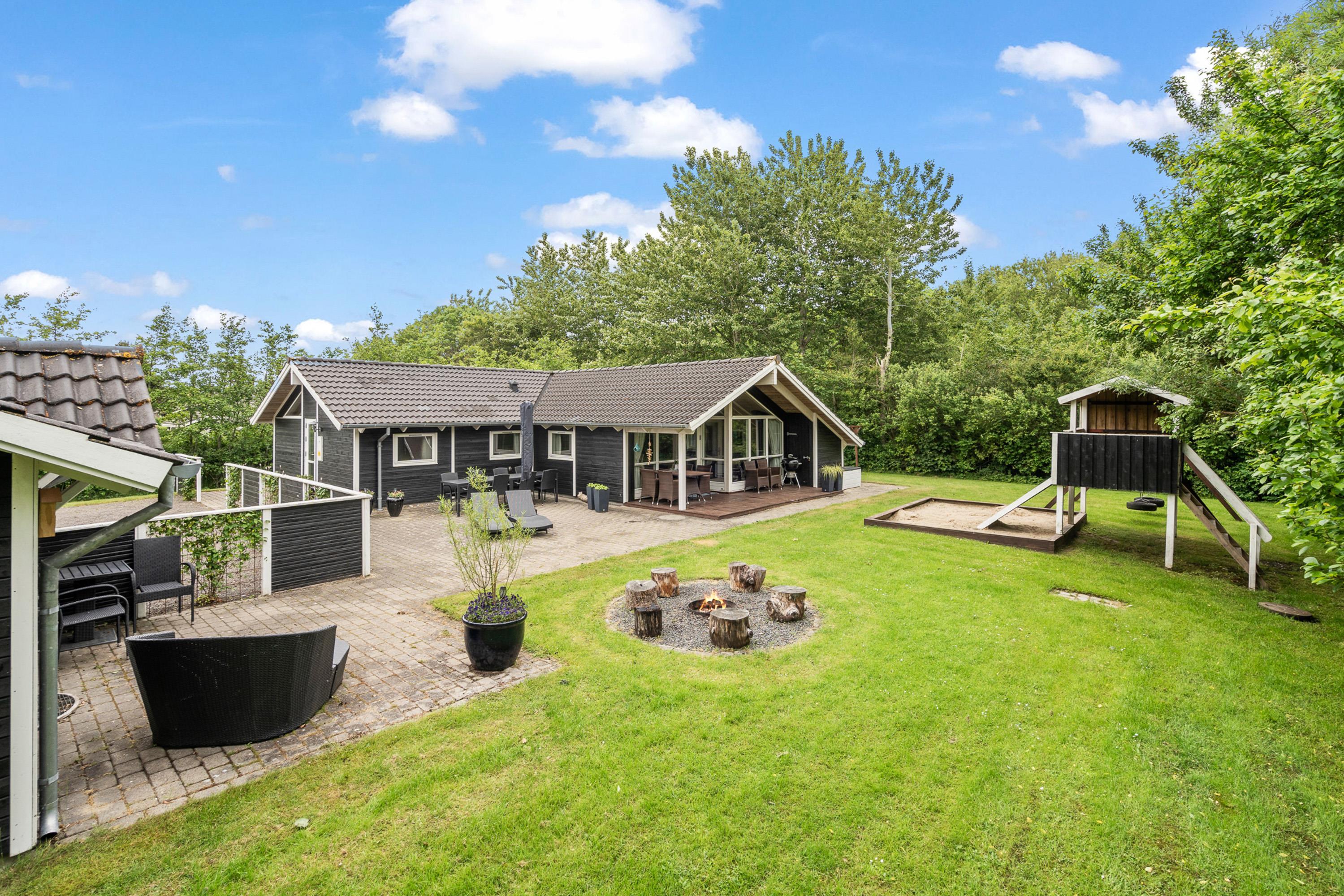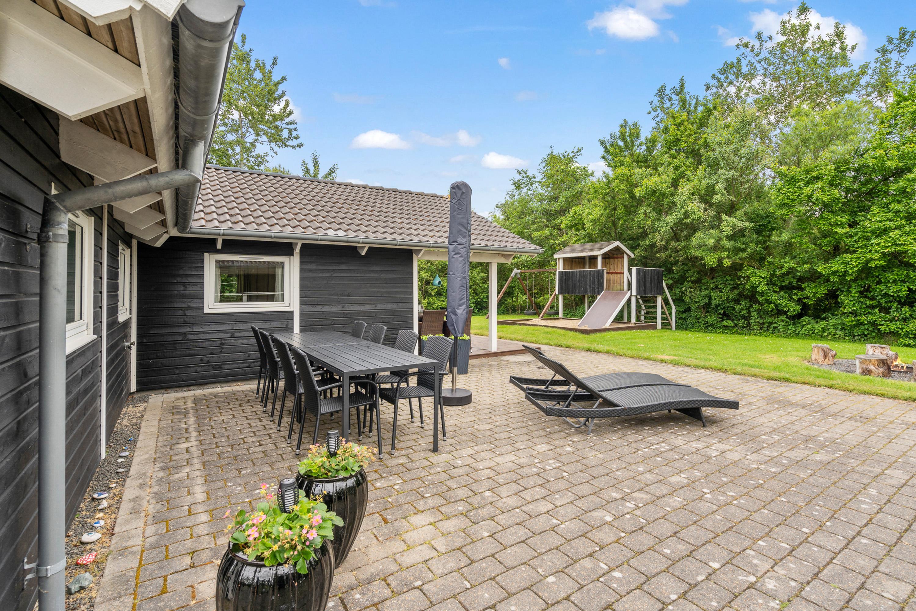 Fra sommerhuset kan I træde ud på det dejlige udeområde, hvor hele familien kan nyde feriens solrige dage. På terrassen kan I læne jer tilbage i havemøbler og liggestole, mens børnene leger i haven, hvor der er både sandkasse og gyngestativ.