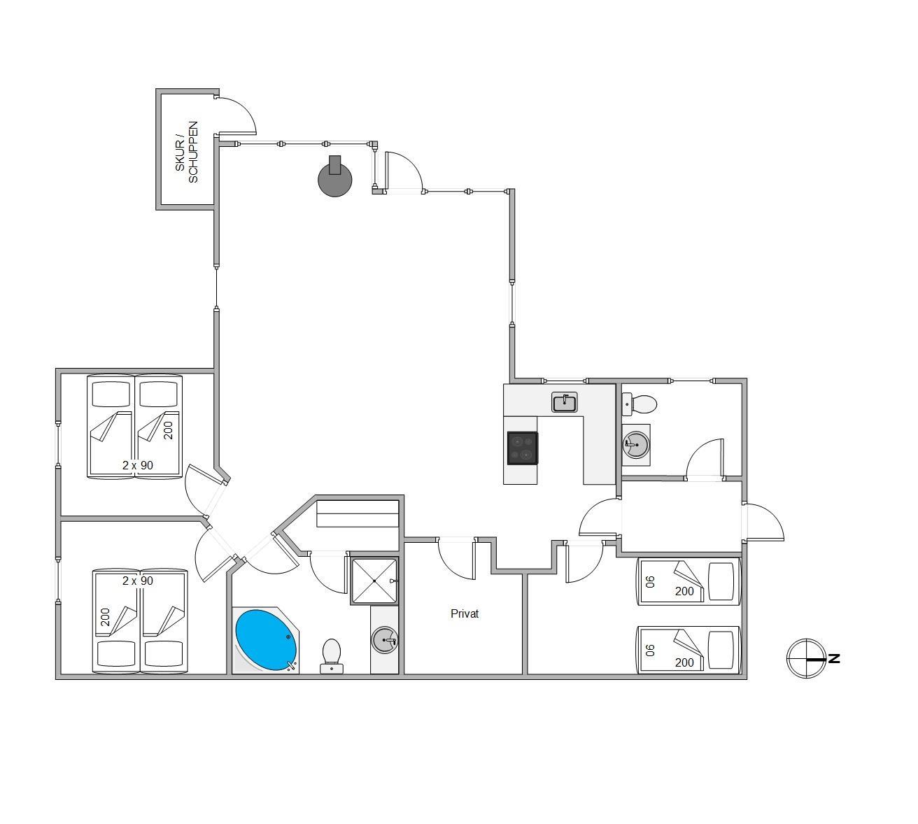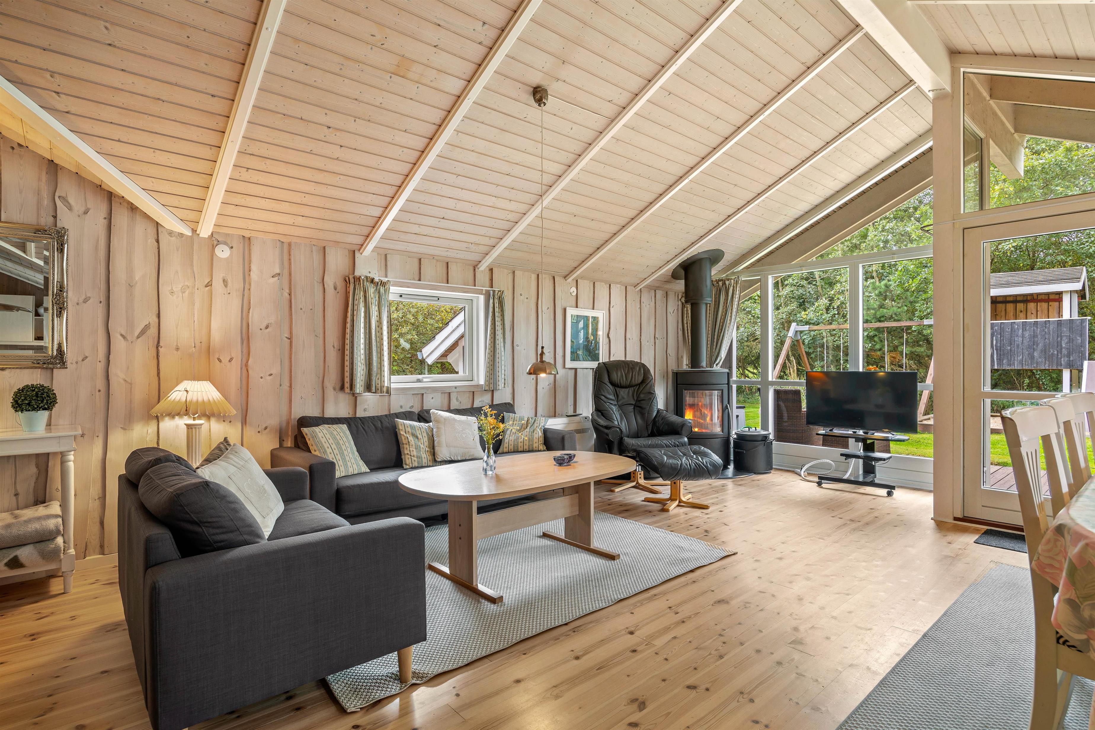 Feriehusets hjerte er alrummet, hvor I kan samles til hyggelige feriestunder med hele familien. Alrummet forener køkkenet med stue og spiseplads, og derfor kan I nyde hinandens selskab, selvom I har gang i forskellige ting i alrummet. Alt imens sørger brændeovnen for, at den hyggelige feriestemning bliver fuldendt. Desuden er der gulvvarme i alrummet, så I ikke fryser fødderne.
