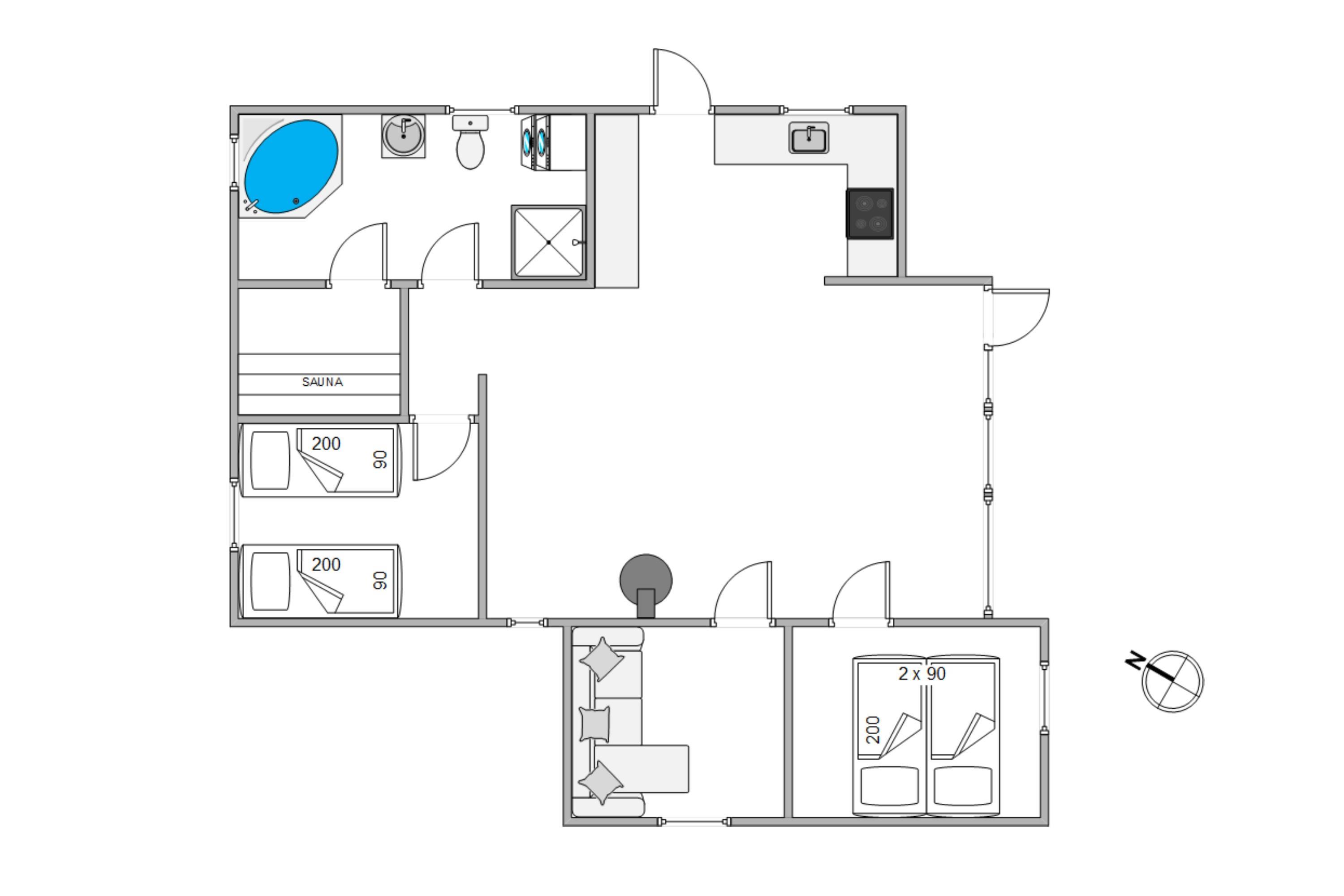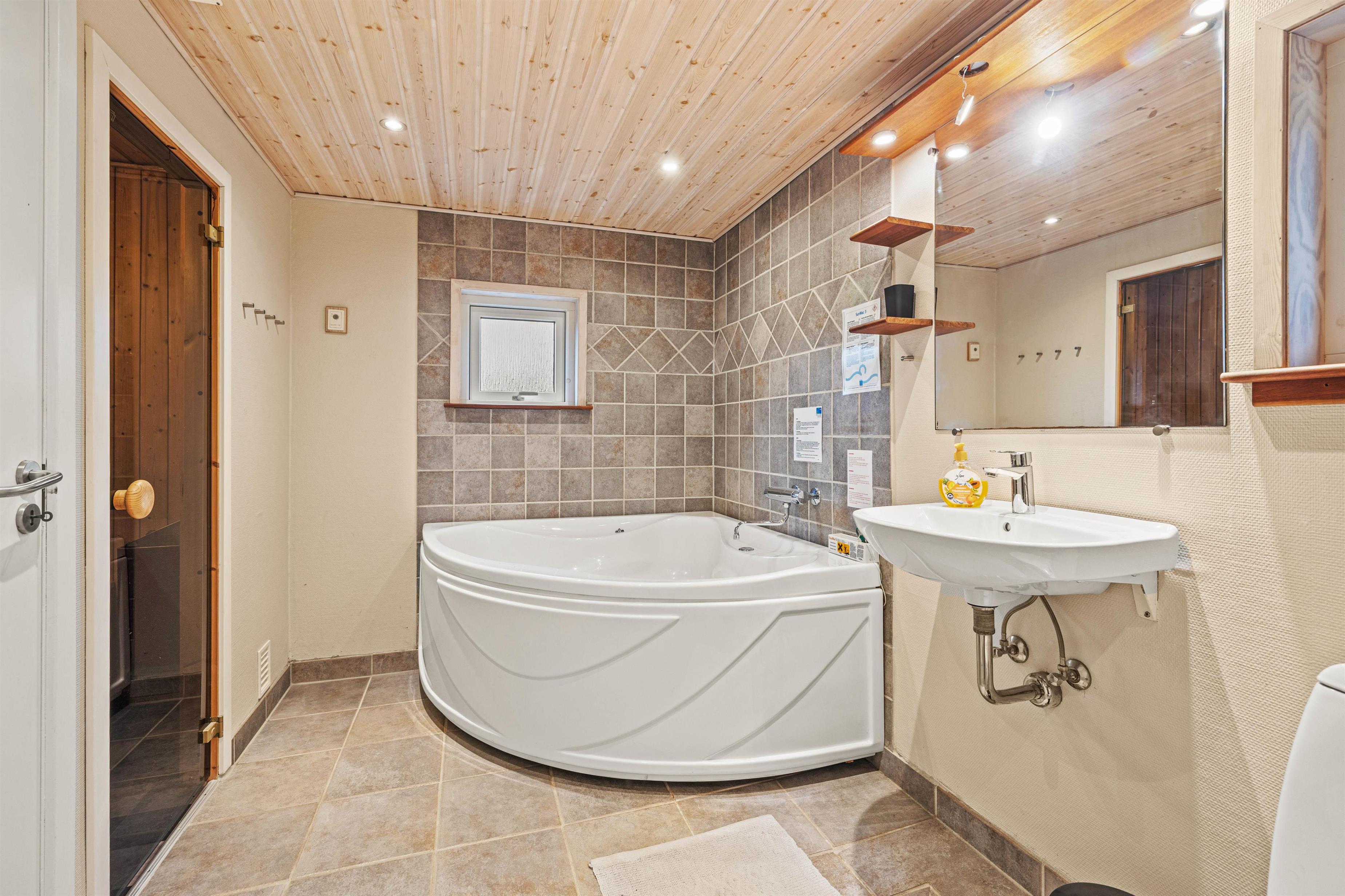 Foruden det store opholdsrum er der i sommerhuset 3 soveværelser, det ene med en sovesofa, og 1 badeværelse. På badeværelset finder I også sommerhusets spaafdeling med et lækkert spabad og sauna, hvor I kan få lige den afslapning, I har brug for.