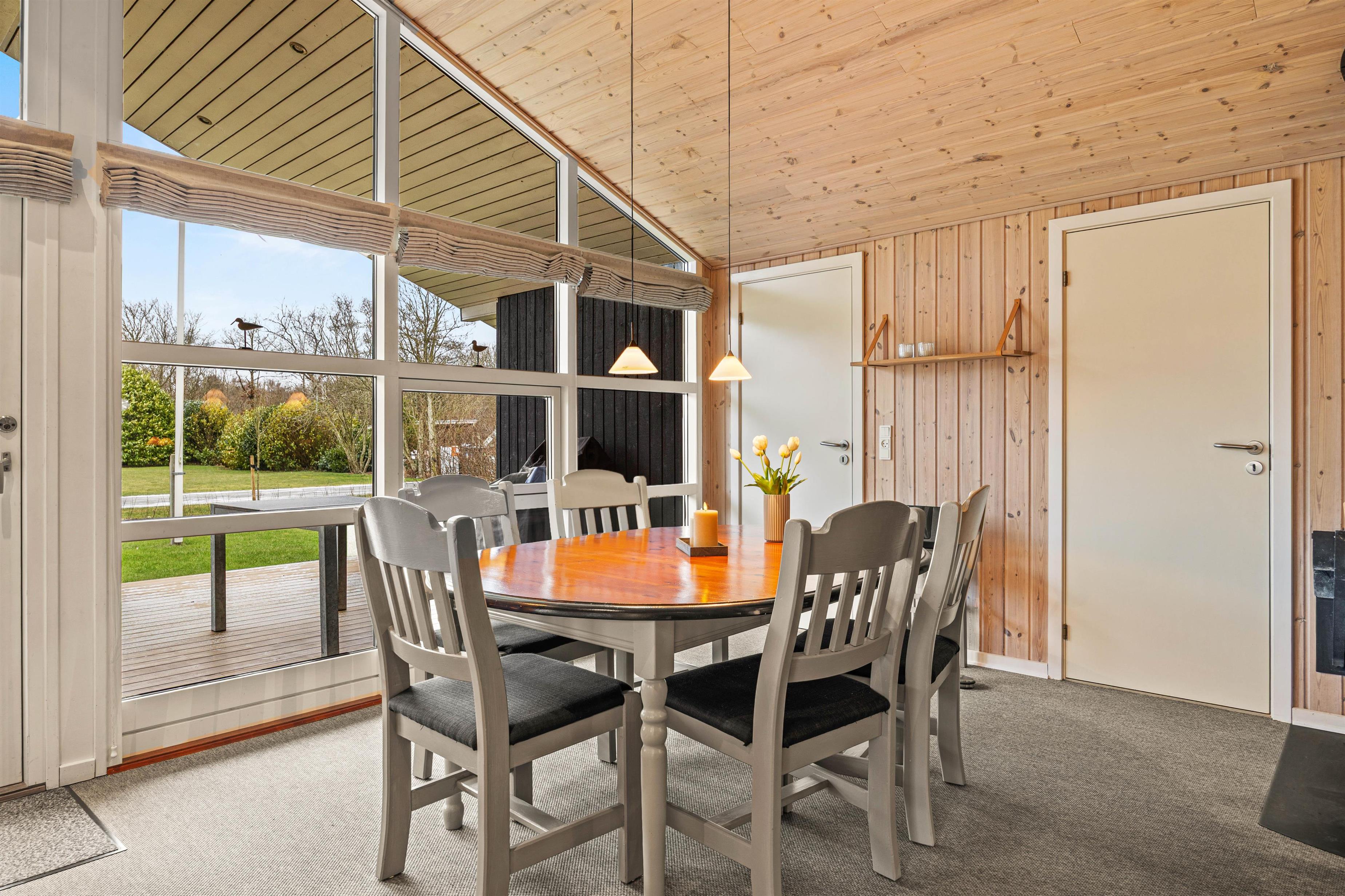 Sommerhusets opholdsrum, hvorfra der er åbent til køkkenet, er perfekt til enhver hyggelig feriestund sammen. Her kan I samle jer omkring spisebordet til skønne måltider og efterfølgende til hyggelige kortspil eller sjove brætspil.