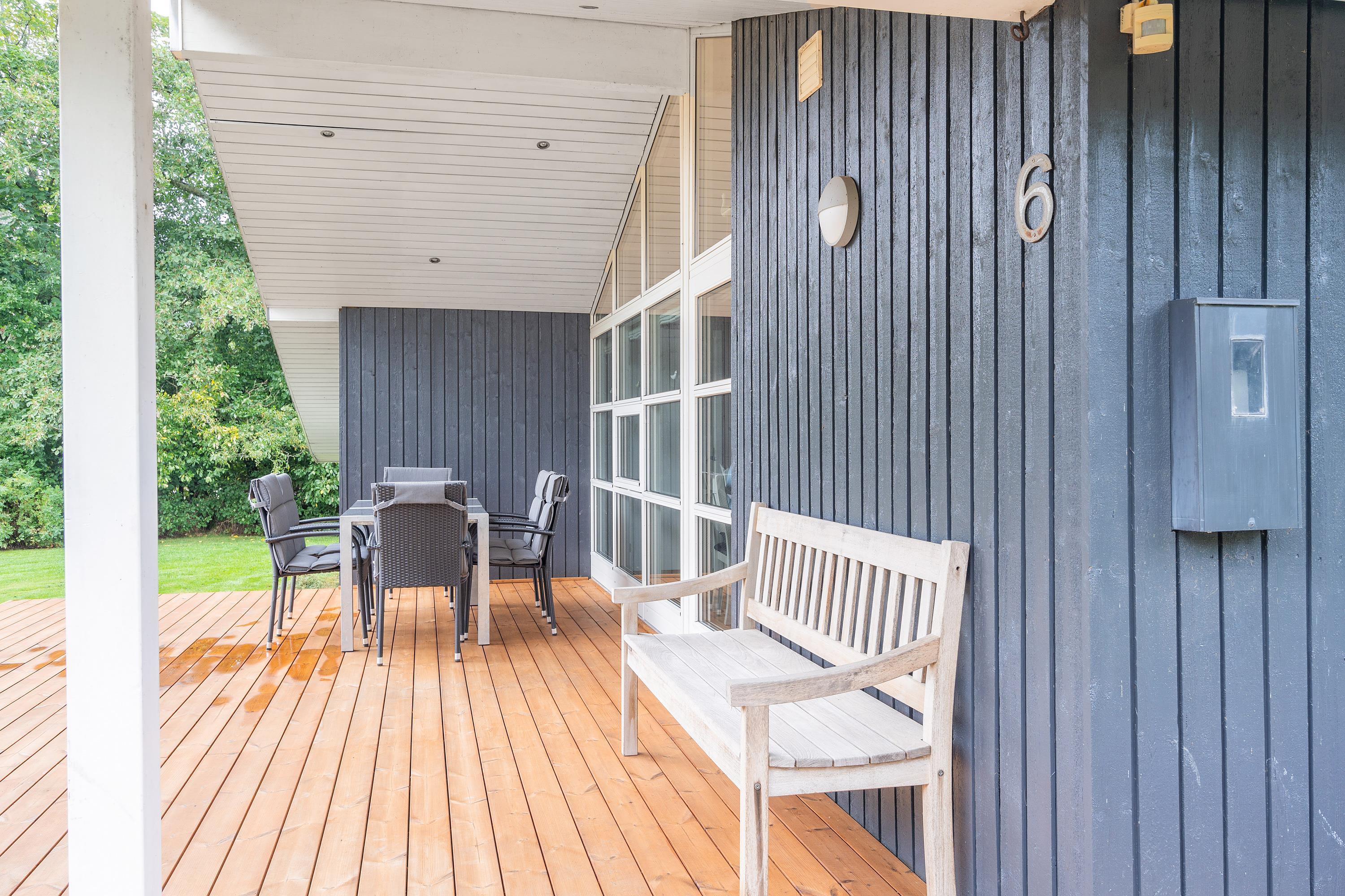 Den nybyggede, delvist overdækkede terrasse er det perfekte sted at være på de varme feriedage. Her har I liggestole og havemøbler til rådighed, som I kan sætte jer til rette i og nyde varmen og ferien. Skulle I få brug for mere skygge på terrassen, kan I slå solsejlet op.