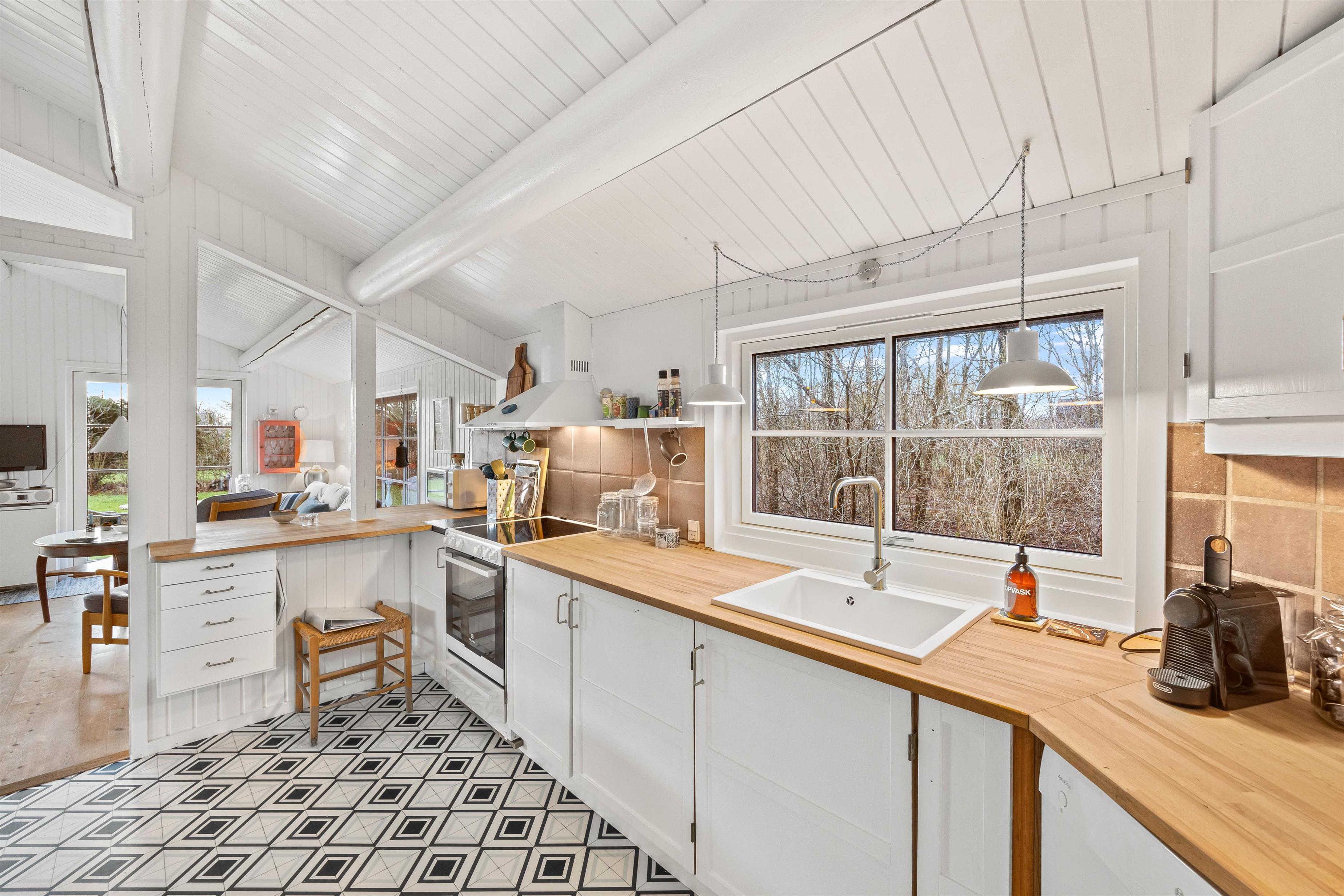 I det 80 kvadratmeter store sommerhus er der åben forbindelse mellem køkken, spiseplads og stue og der er derfor rig mulighed for, at I kan nyde hinandens selskab i løbet af ferien – også når I laver forskellige ting i det åbne rum.
