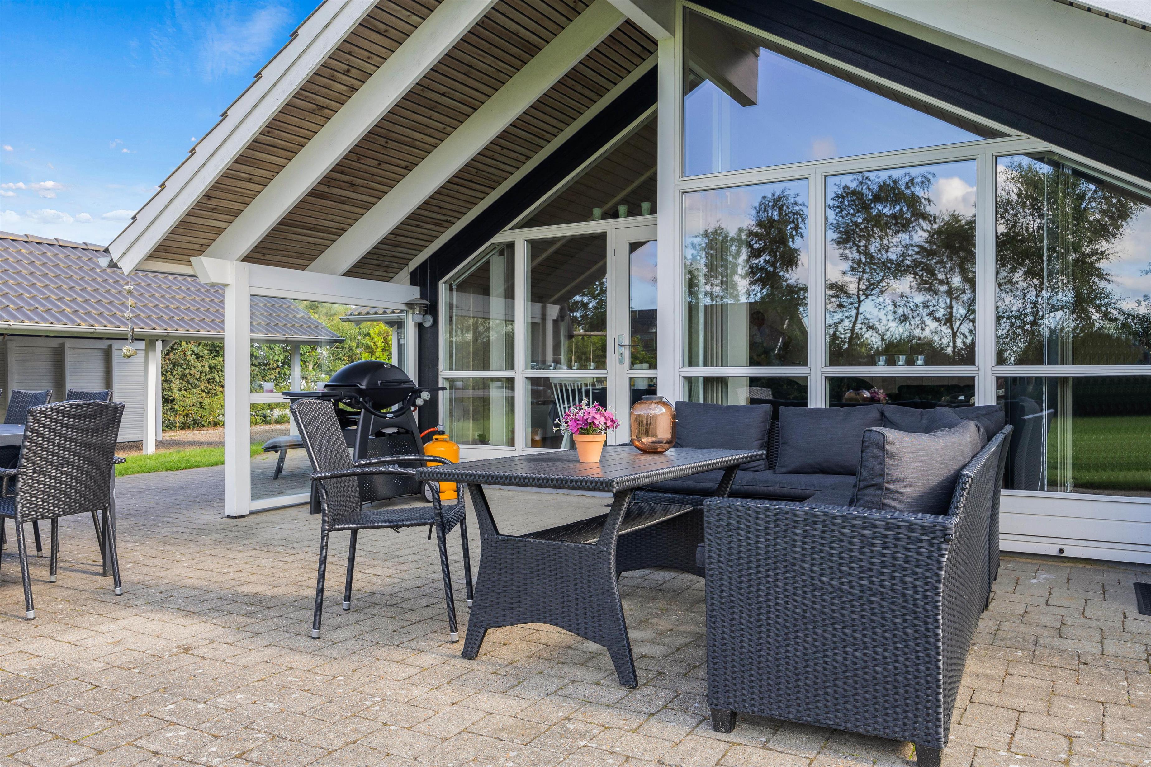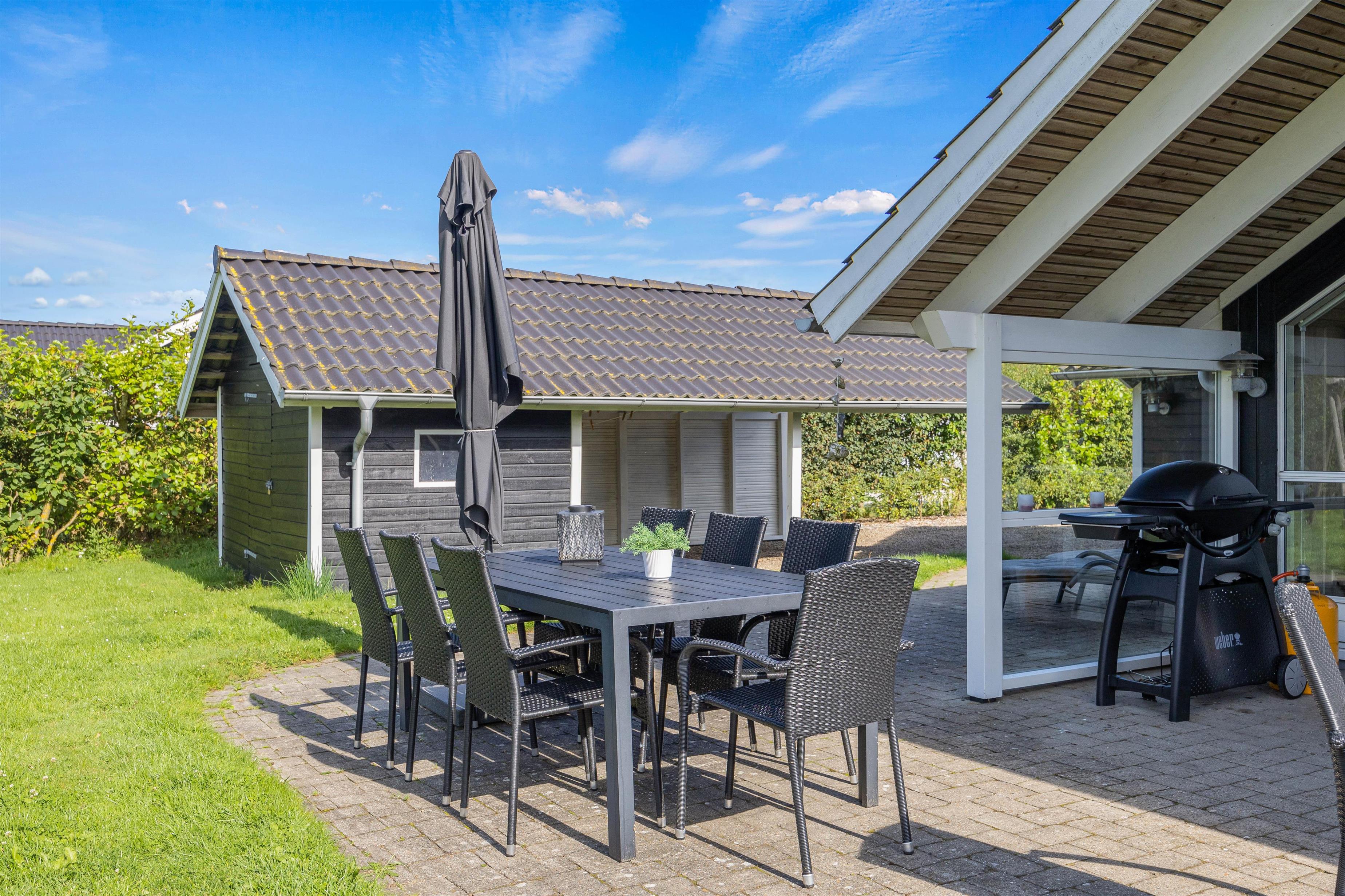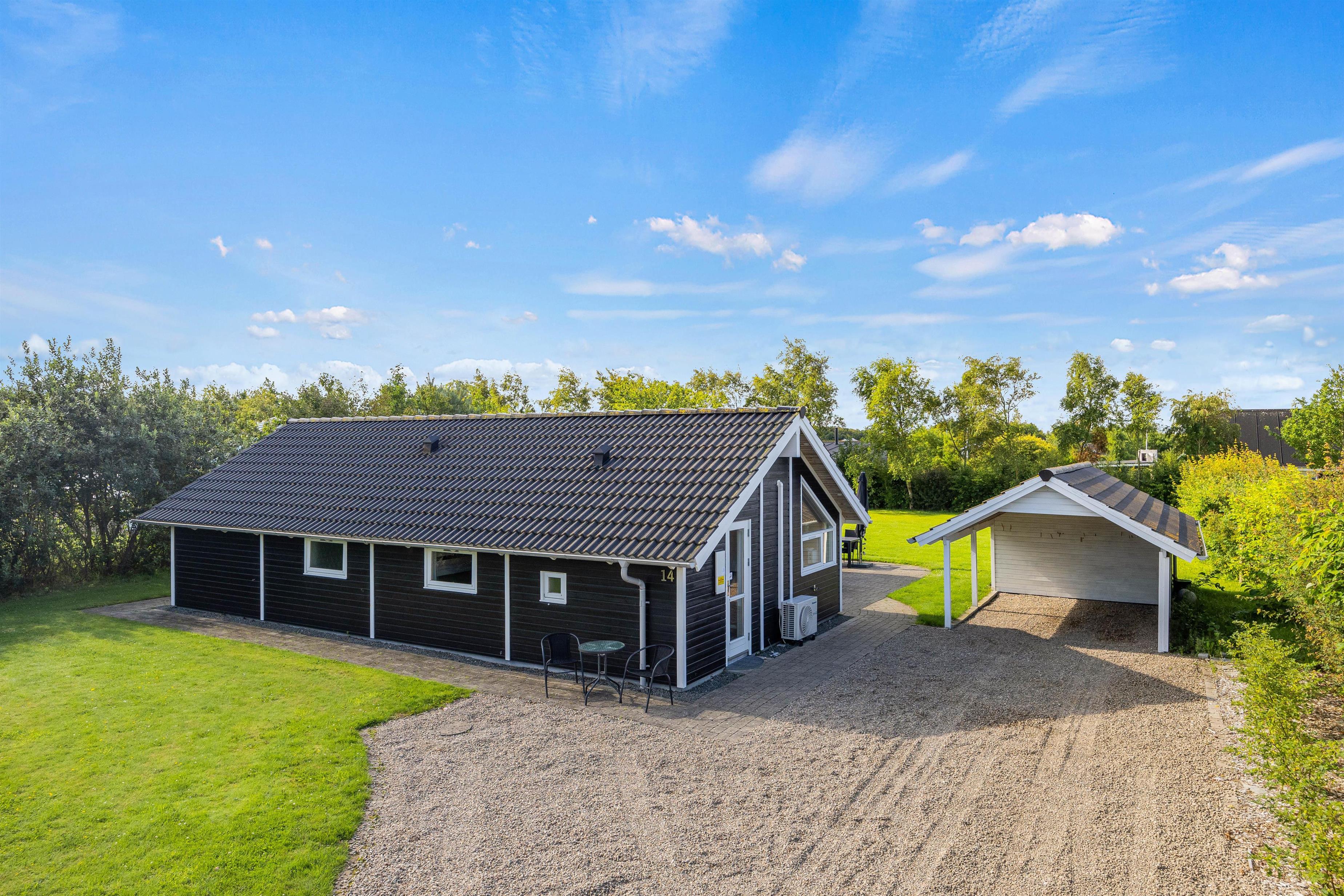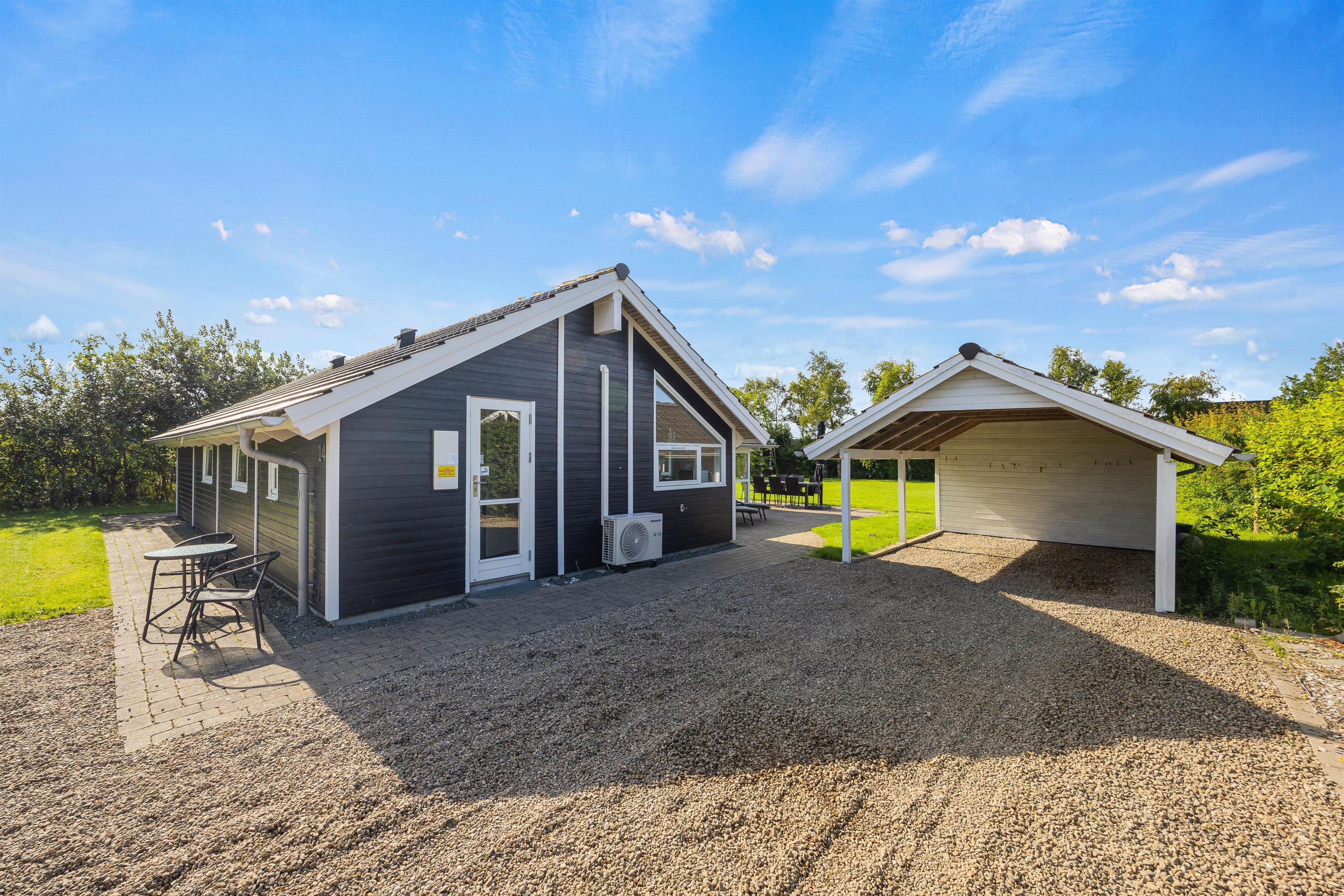 Sommerhuset er udstyret med både en åben og en overdækket terrasse, hvilket giver fleksibilitet til at tilpasse sig både solrige og lunefulde danske sommerdage. Med en praktisk carport er bilerne godt beskyttet, og I kan nemt komme til og fra huset uden bekymringer.